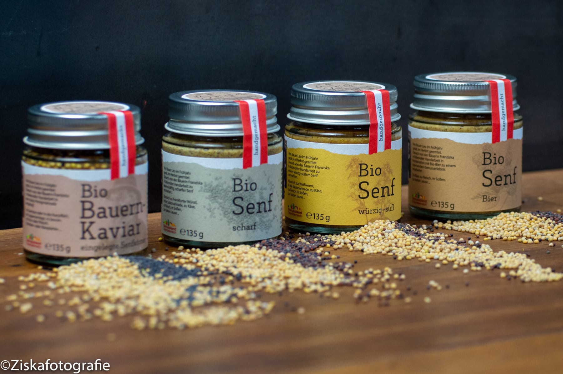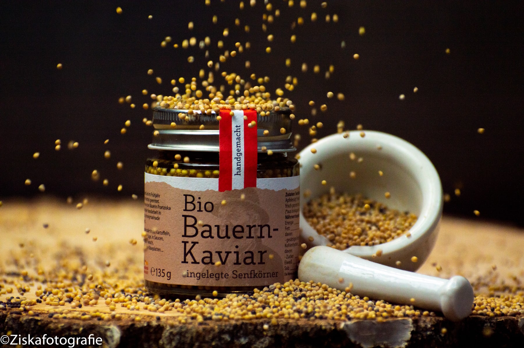 • der Produktion von Senfen in verschiedenen Geschmacksrichtungen. Der mittlerweile sehr bekannte und beliebte Bauernkaviar wurde von uns kreiert und am Hof produziert.