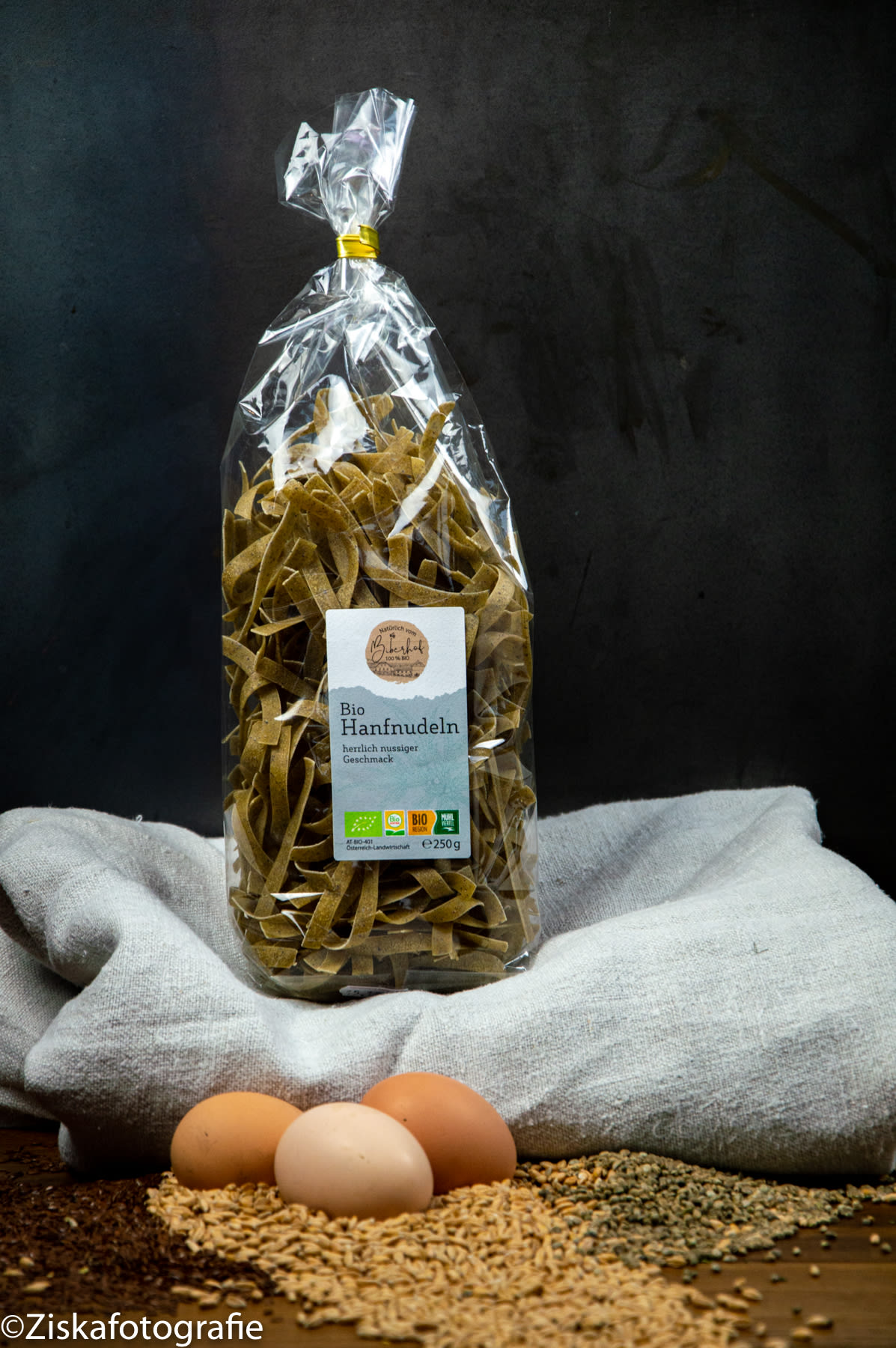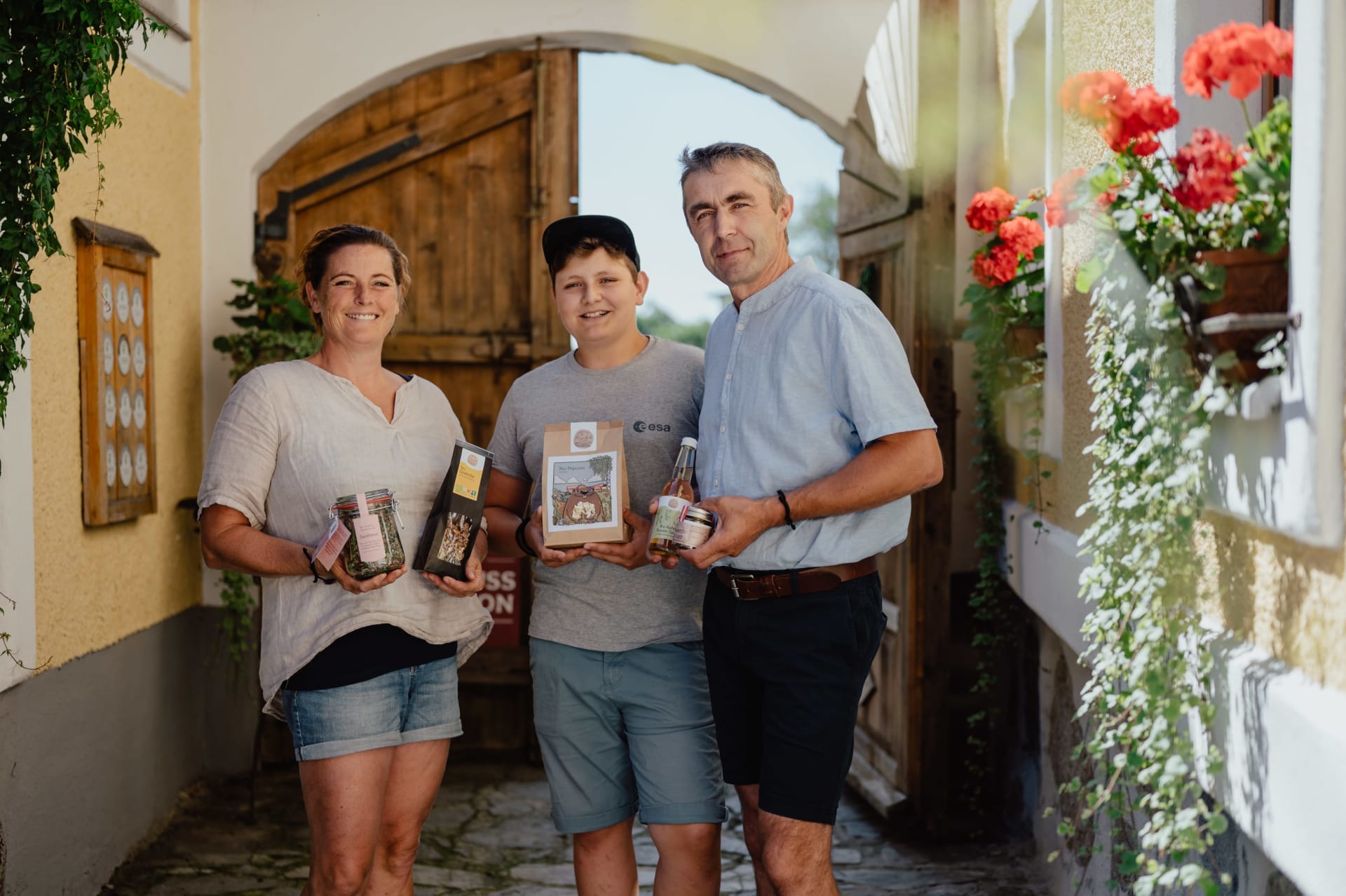 • eigene, am Hof produzierte, Produkte wie Granola-Müsli, Erdbeer- bzw. Himbeermarmelade, Leinsamen, Hanfnüsse, Eier