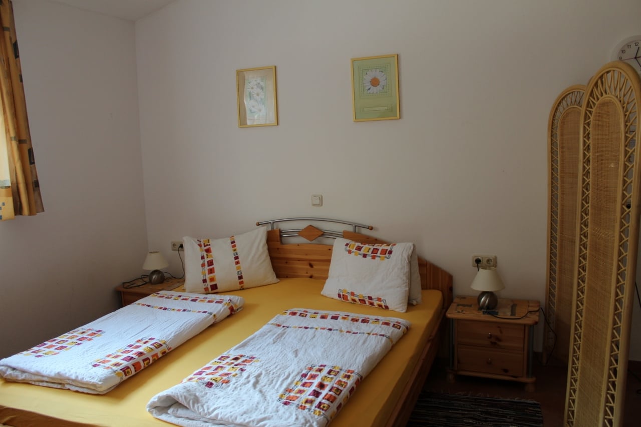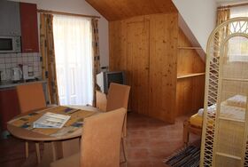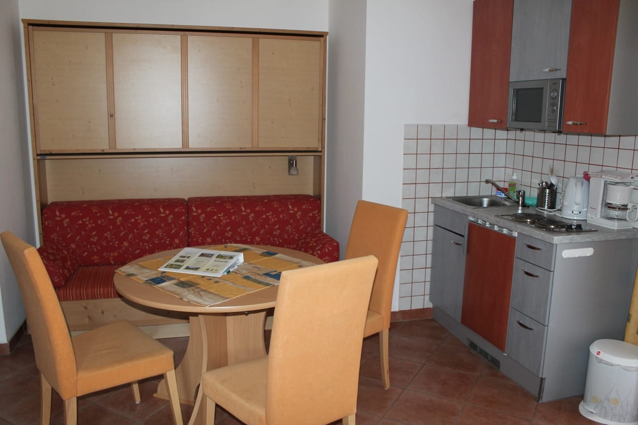 Das Zimmer EFEU hat ein Doppelbett mit freiem Fußende und eine Küchenecke mit 2 Kochplatten, Geschirr, Mikrowelle, Kühlschrank, Wasserkocher, Kaffeemaschine. Es gibt eine bequeme Sitzgelegenheit im Raum. SAT-TV kann vom der Sitzgelegenheit oder vom Bett aus gesehen werden. Radio und Telefon mit Haustür-Sprechanlage und Türöffner ist im Zimmer. Bett und Tischwäsche, Geschirrtücher, Bade-und Handtücher sind vorhanden.