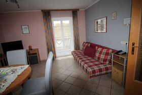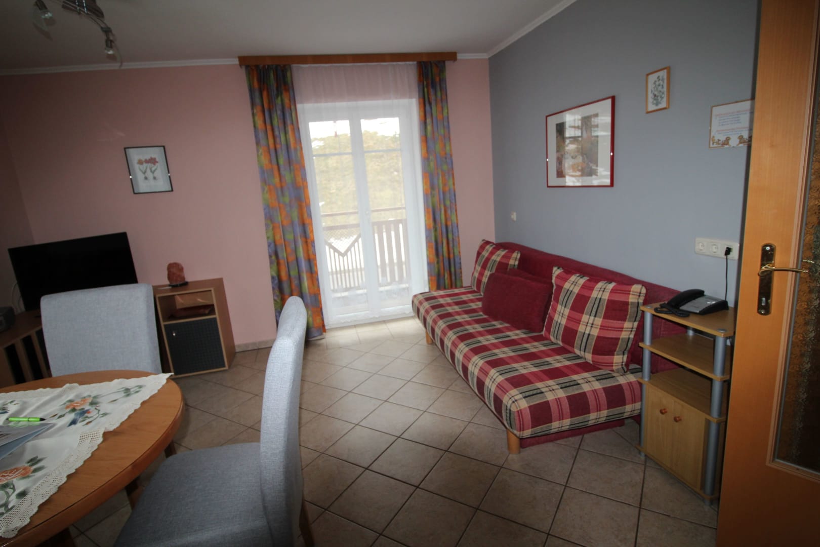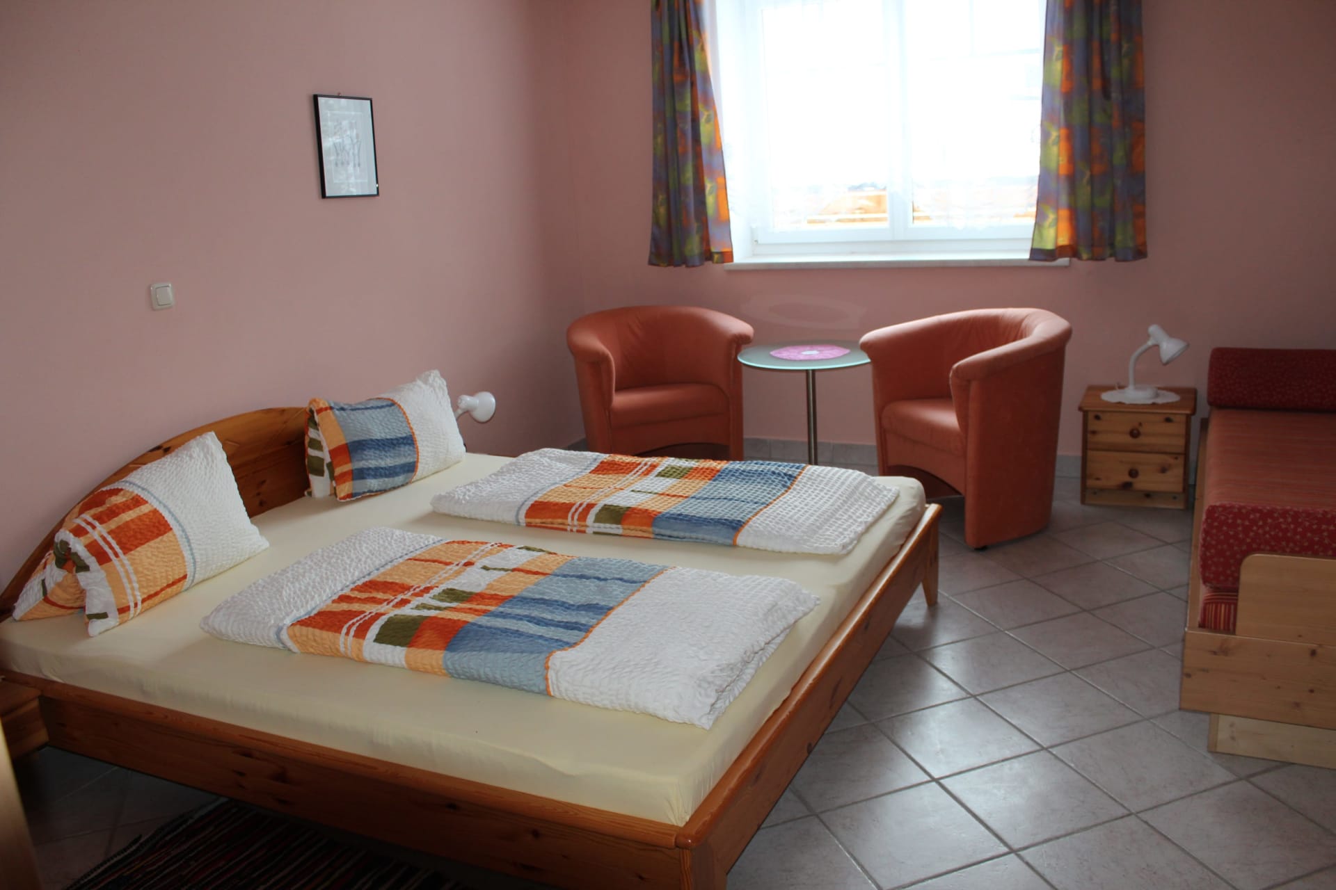 Das Familienzimmer ROSE mit Balkon hat ein Doppelbett mit freiem Fußende. Die Polsterbank kann bei Bedarf zu einem Etagenbett umgewandelt werden.Weiters ist ein abgetrenneter Wohnraun mit Kochgelegenheit vorhanden. SAT-TV, Radio, Telefon mit Haustür-Sprechanlage und Türöffner im Zimmer. Das WC ist von der Dusche getrennt. Bett-und Tischwäsche, Geschirrtücher, Bade-und Handtücher sind vorhanden.