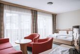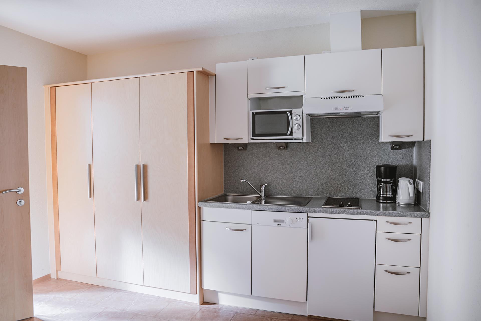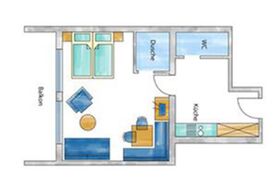 Gemütlich eingerichtetes Studio mit einem Wohn-Schlafraum mit Doppelbett, ausziehbares Schlafsofa und Essbereich. Separate, vollausgestattete Küchenzeile mit Mikrowelle, Kaffeemaschine, Geschirrspülmaschine, Wasserkocher uvm.; Ein Badezimmer mit Dusche und Haarföhn, separates WC. Balkon mit herrlicher Aussicht. Größe ca. 36 m².