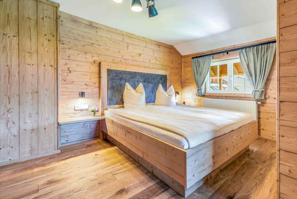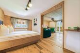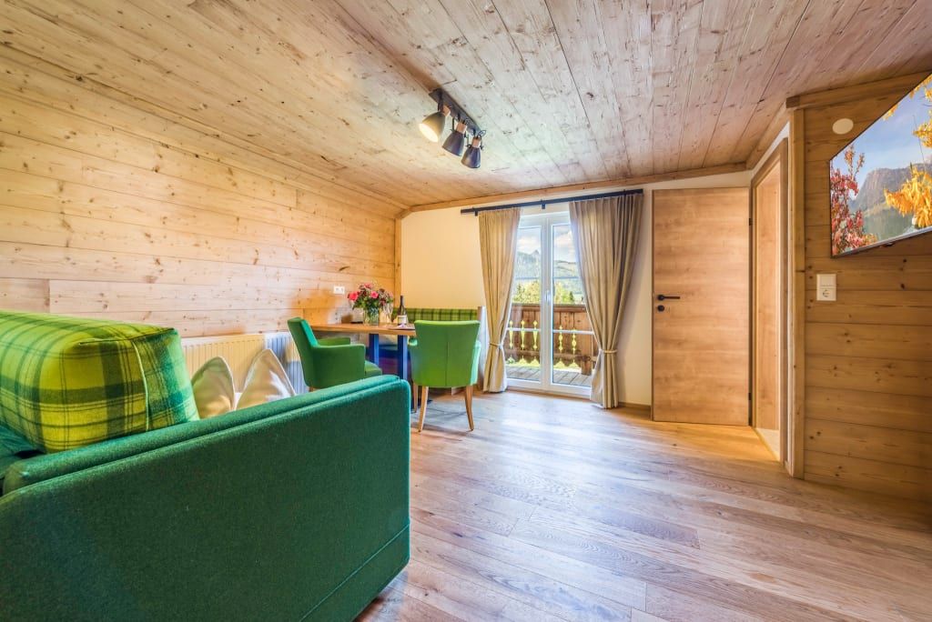 Im ersten Obergeschoss liegt unser Doppelzimmer Rossstall mit knapp 30m², diese Wohneinheiten kann von 2 Personen mit 1 Kind gebucht werden. Sie richten sich mit freiem Blick zum Wolfgangsee und ist ländlich modern eingerichtet. Wie in unseren anderen Gästebereichen gibt es ein gemütliches Doppelbett. Ein großzügiger Wohnbereich mit Tisch/ Sitzgelegenheiten sowie einer ausziehbaren Couch steht jeweils zusätzlich zur Verfügung. Bad und WC sind in dieser Wohneinheiten getrennt begehbar. Fernseher und eine Nespresso Kaffeemaschine sind im Zimmer vorhanden.