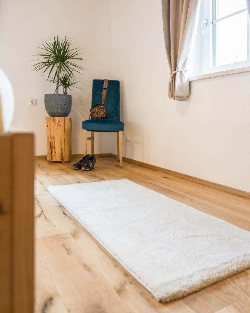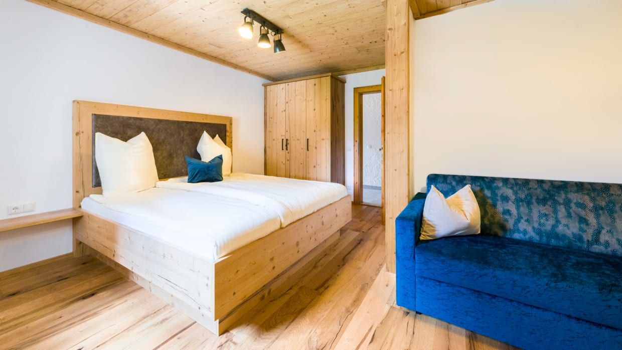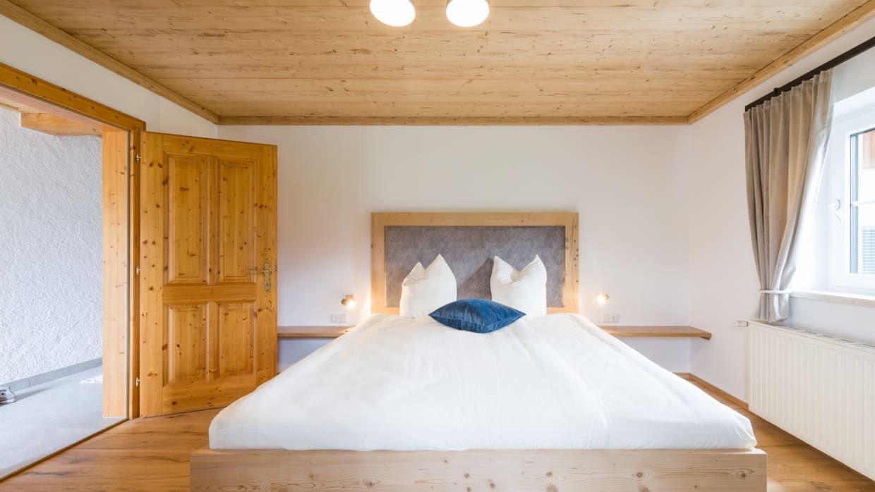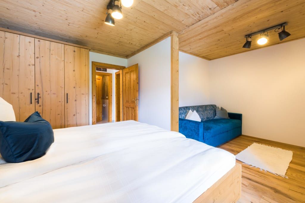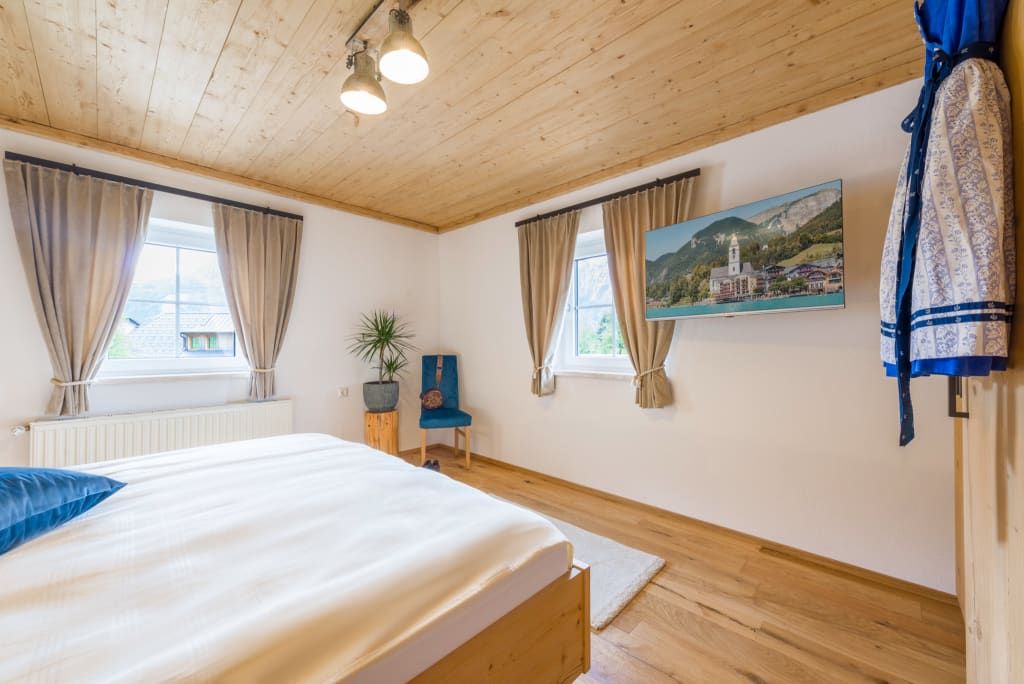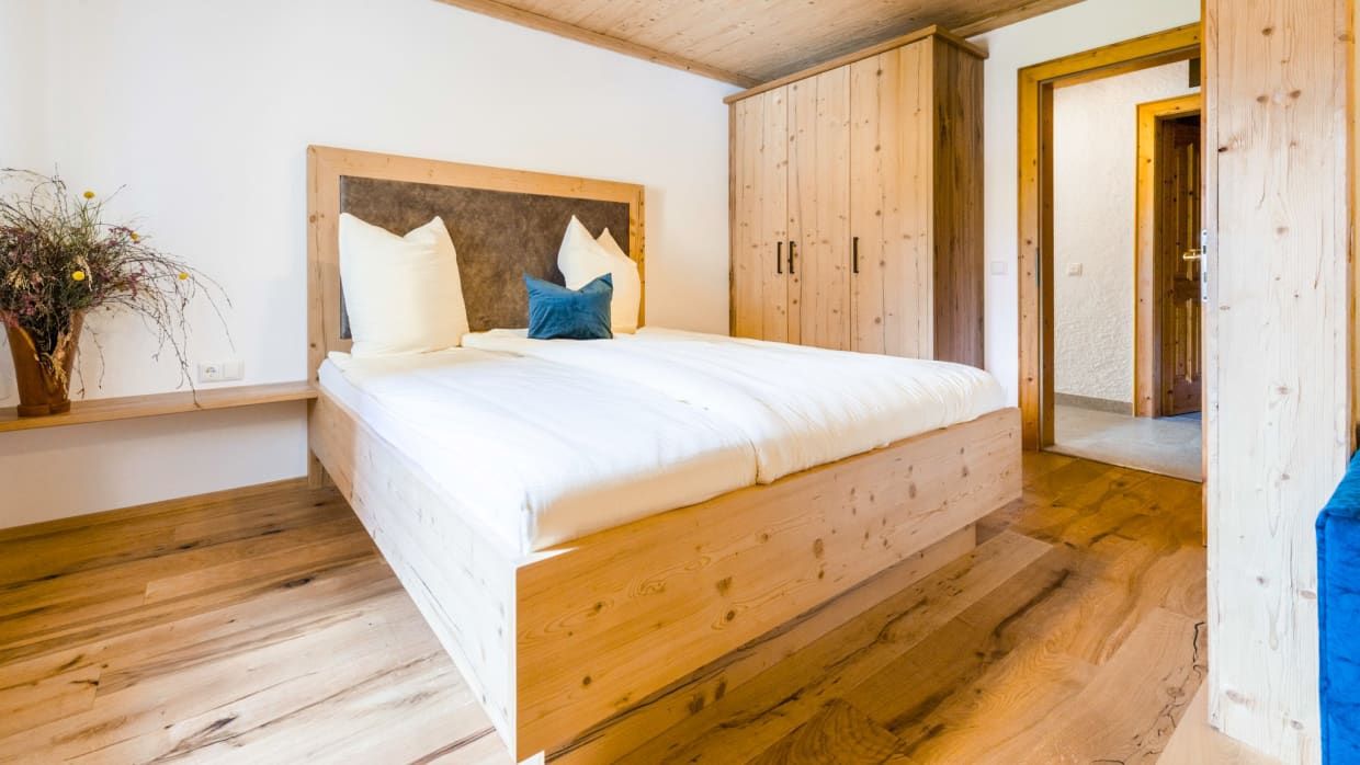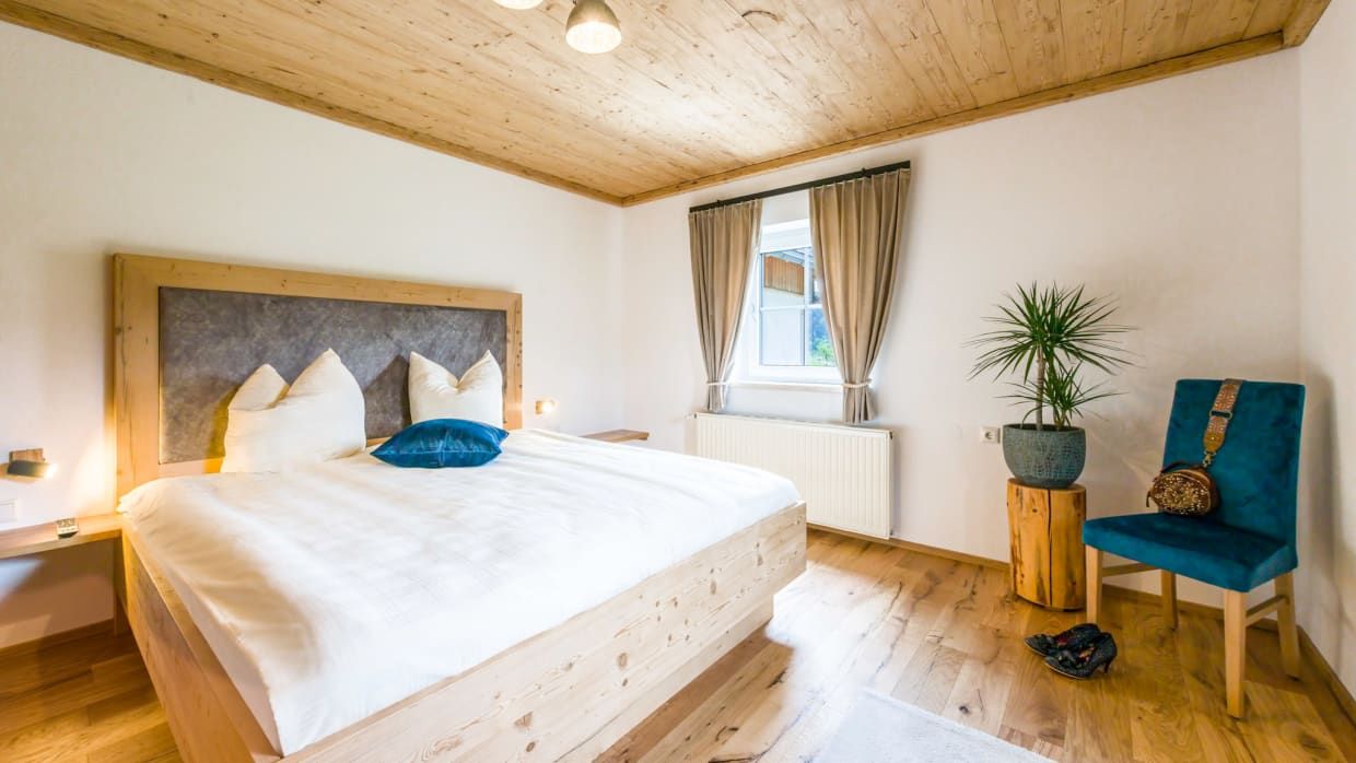 Die 80m² große Ferienwohnung Zur Tenne liegt ebenerdig in Richtung Wolfgangsee. Von einem gemütlichen Eingangsbereich gelangt man in zwei getrennt begehbare Schlafzimmer mit modernen Doppelbetten. Ein Schlafzimmer verfügt zudem über eine ausziehbare Couch und damit kann die Wohnung von bis zu 4 erwachsenen Personen und 1 Kind für erholsame Tage gebucht werden.