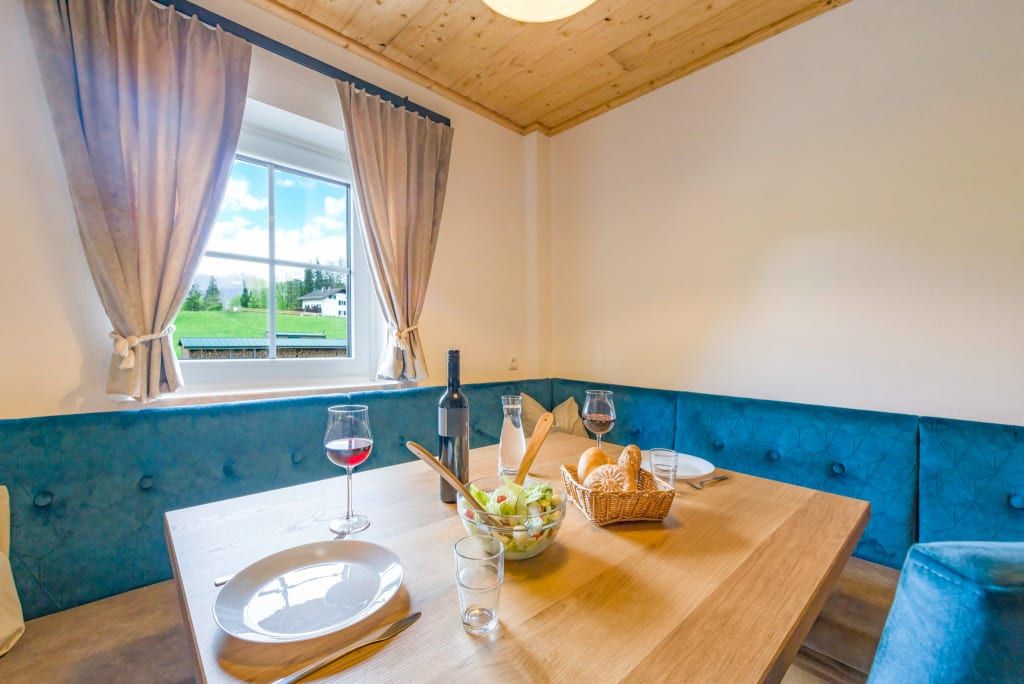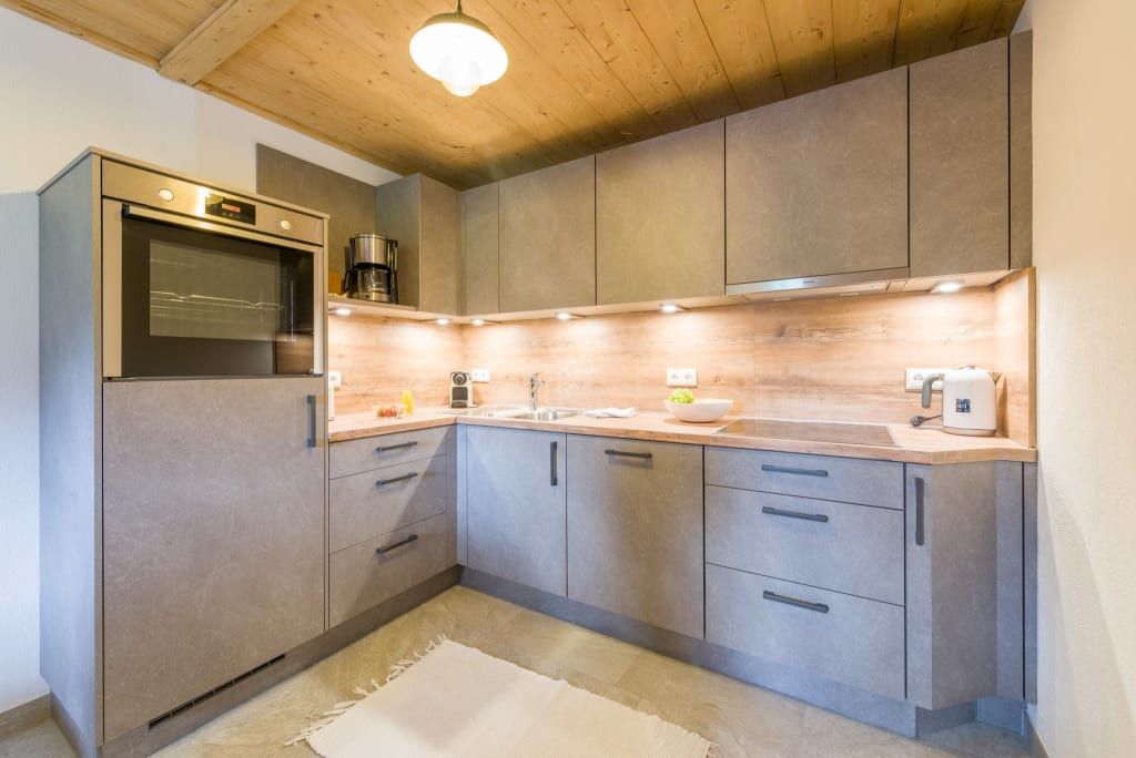Neben einem modernen Bad und getrenntem WC gibt es einen geräumigen Wohn-/ Essbereich, ausgestattet mit einer neuen Küchenzeile sowie einer schicken gepolsterten Sitzecke für unsere Gäste. Die Wohnung ist ländlich modern mit vielen liebevollen Details und klaren Farben eingerichtet. Die Küche ist nach Standard eingerichtet eine Nespresso Kaffeemaschine, Wasserkocher, Geschirrspüler, Backrohr, Kühlschrank mit Gefrierfach.