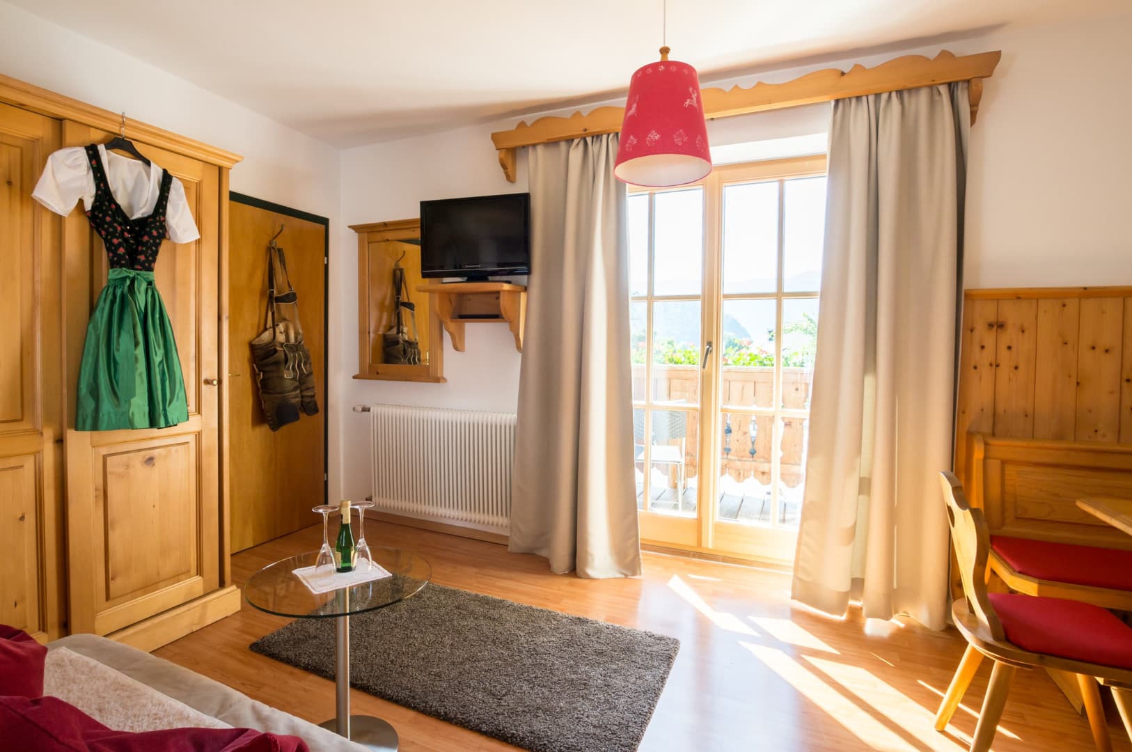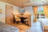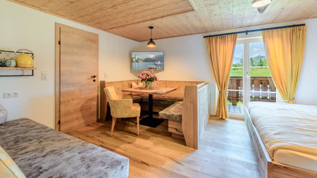 Im ersten Obergeschoss liegt unser Doppelzimmer Zwölferhorn mit knapp30m², diese Wohneinheit kann von 2 Personen gebucht werden. Sie richtet sich mit Blick zu den Bergen Zwölferhorn, Bleckwand, Sparber und Rettenkogel, der Wolfgangsee liegt direkt darunter. Ländlich modern eingerichtet, mit gemütlichen Doppelbett und einem großzügigen Wohnbereich mit Tisch/ Sitzgelegenheit. Bad und WC ist in dieser Wohneinheit getrennt begehbar. Fernseher, Kühlschrank und eine Nespresso Kaffeemaschine sind im Zimmer vorhanden.