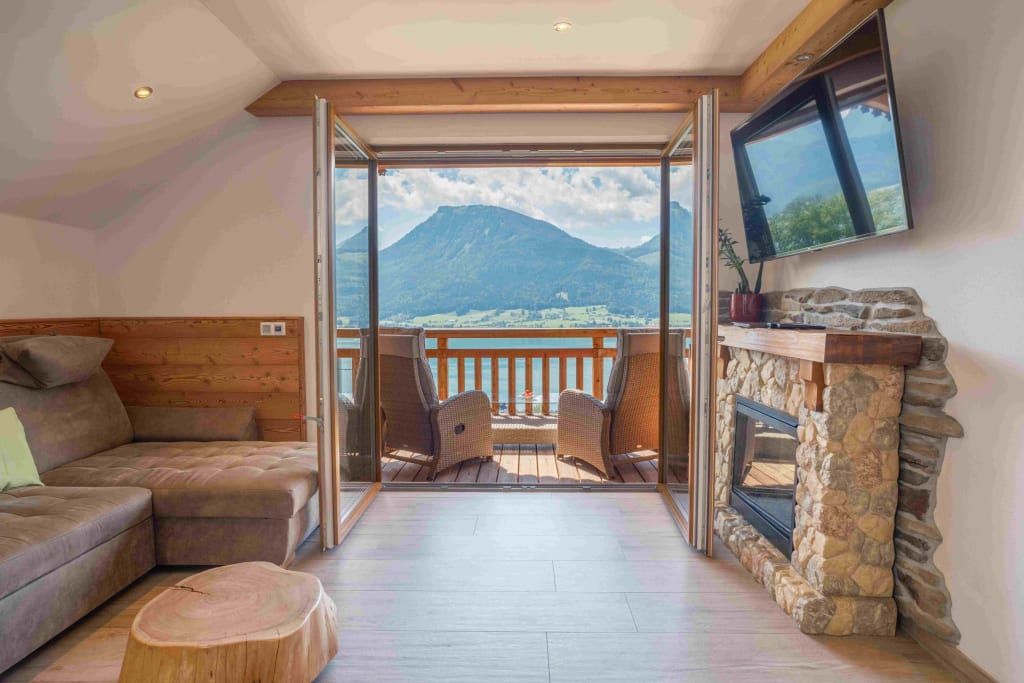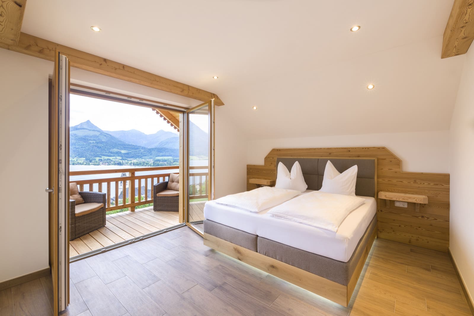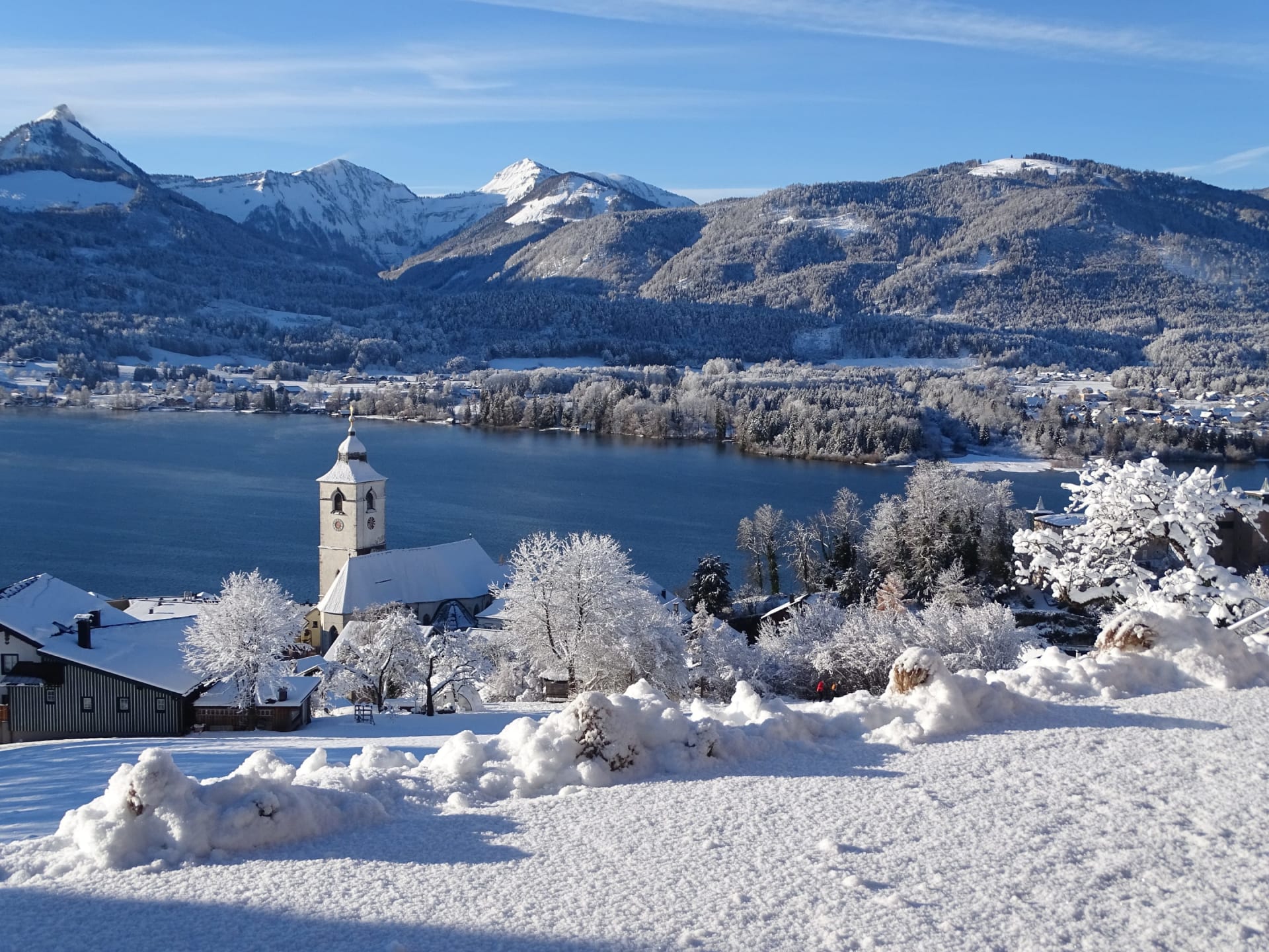 Unser Alleinstellungsmerkmal ist der atemberaubende Blick auf den malerischen Wolfgangsee – nirgendwo sonst können Sie einen derart traumhaften Ausblick auf dieses Juwel des Salzkammergutes genießen. Nehmen Sie auf unserer Panorama-Sonnenterasse auf einer unserer Liegen Platz oder machen Sie es sich am privaten Balkon gemütlich - die unbeschreibliche Kulisse mit der Wallfahrtskirche im Ort, dem anmutigen Wolfgangsee sowie der Gebirgswelt des inneren Salzkammergutes wird sie in Staunen versetzen!