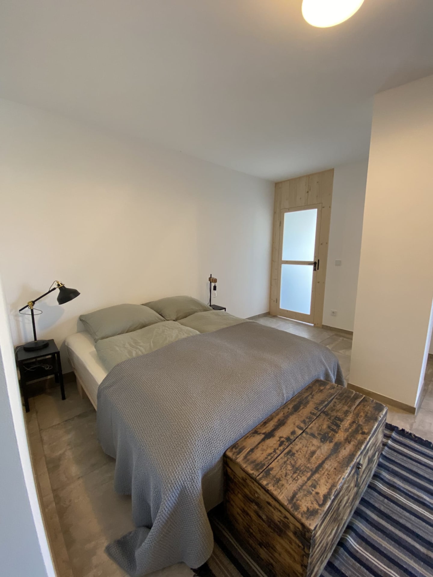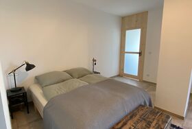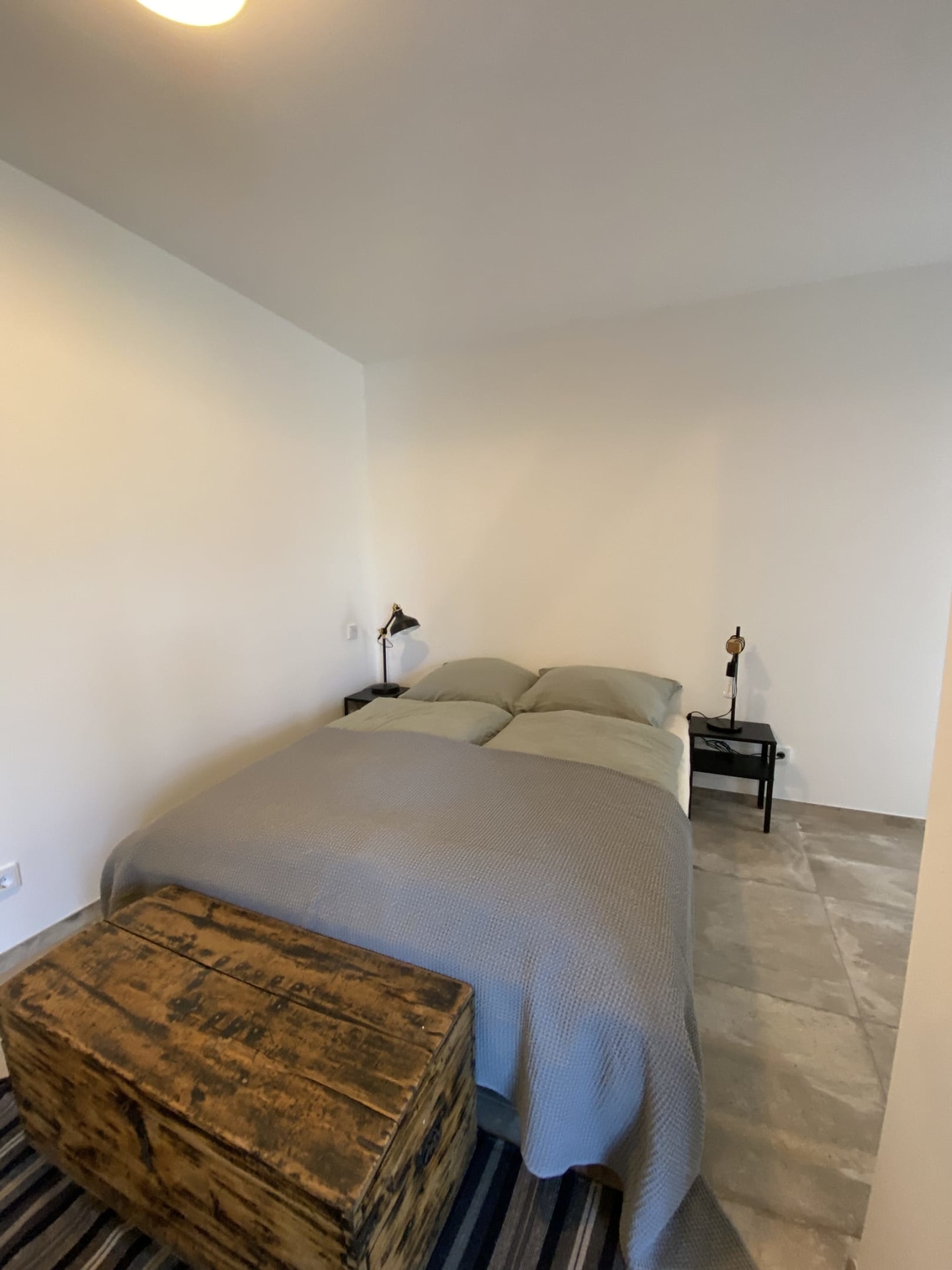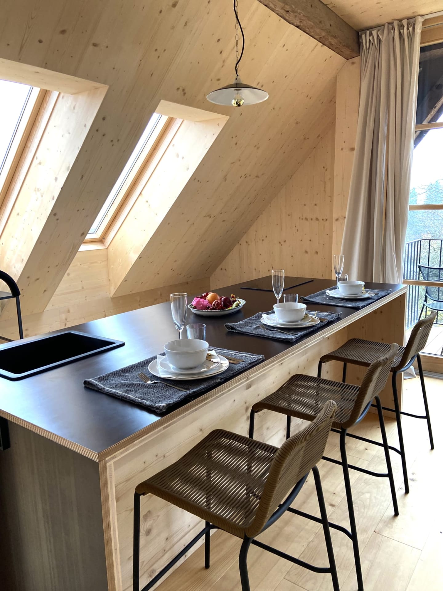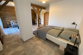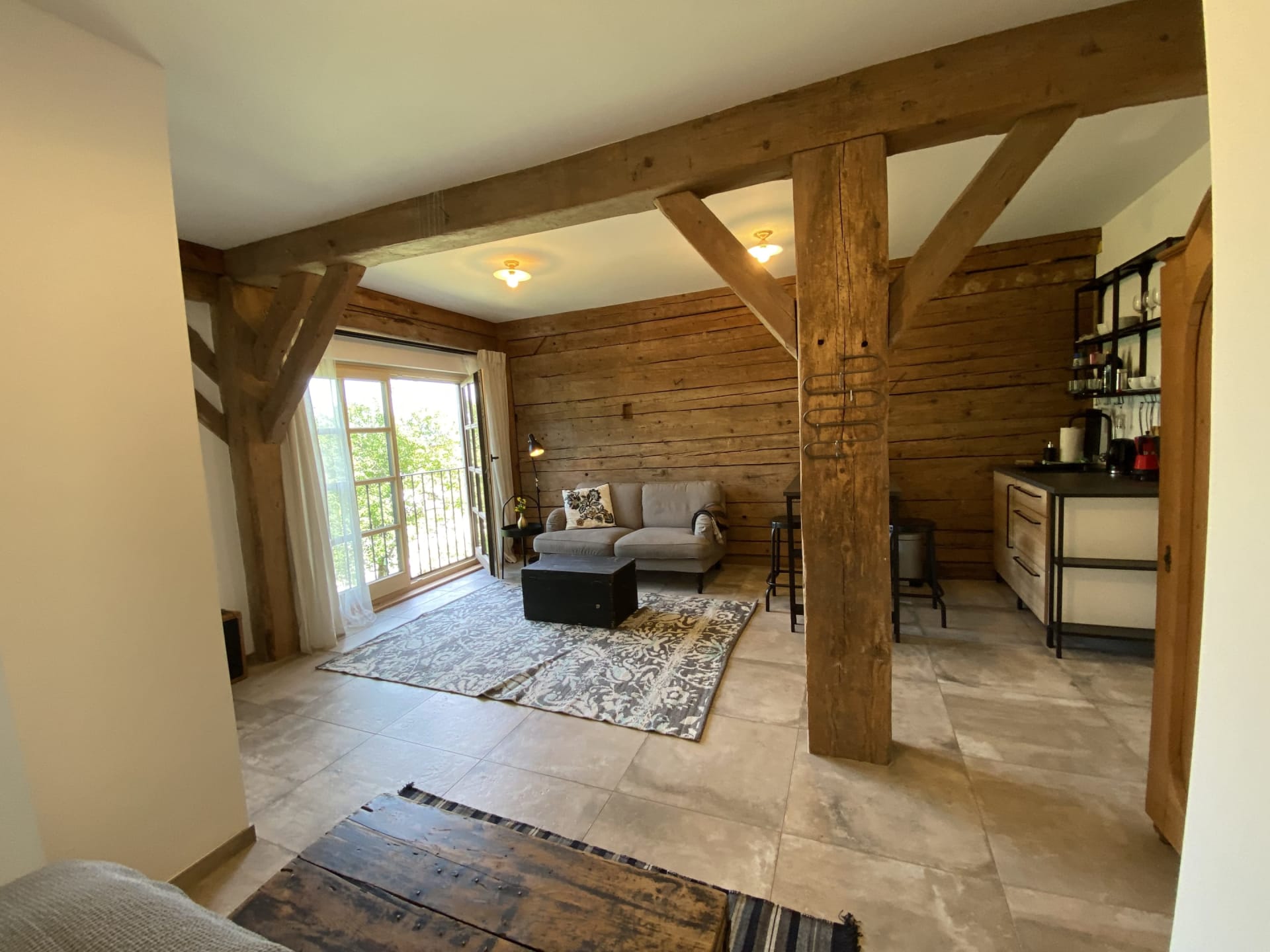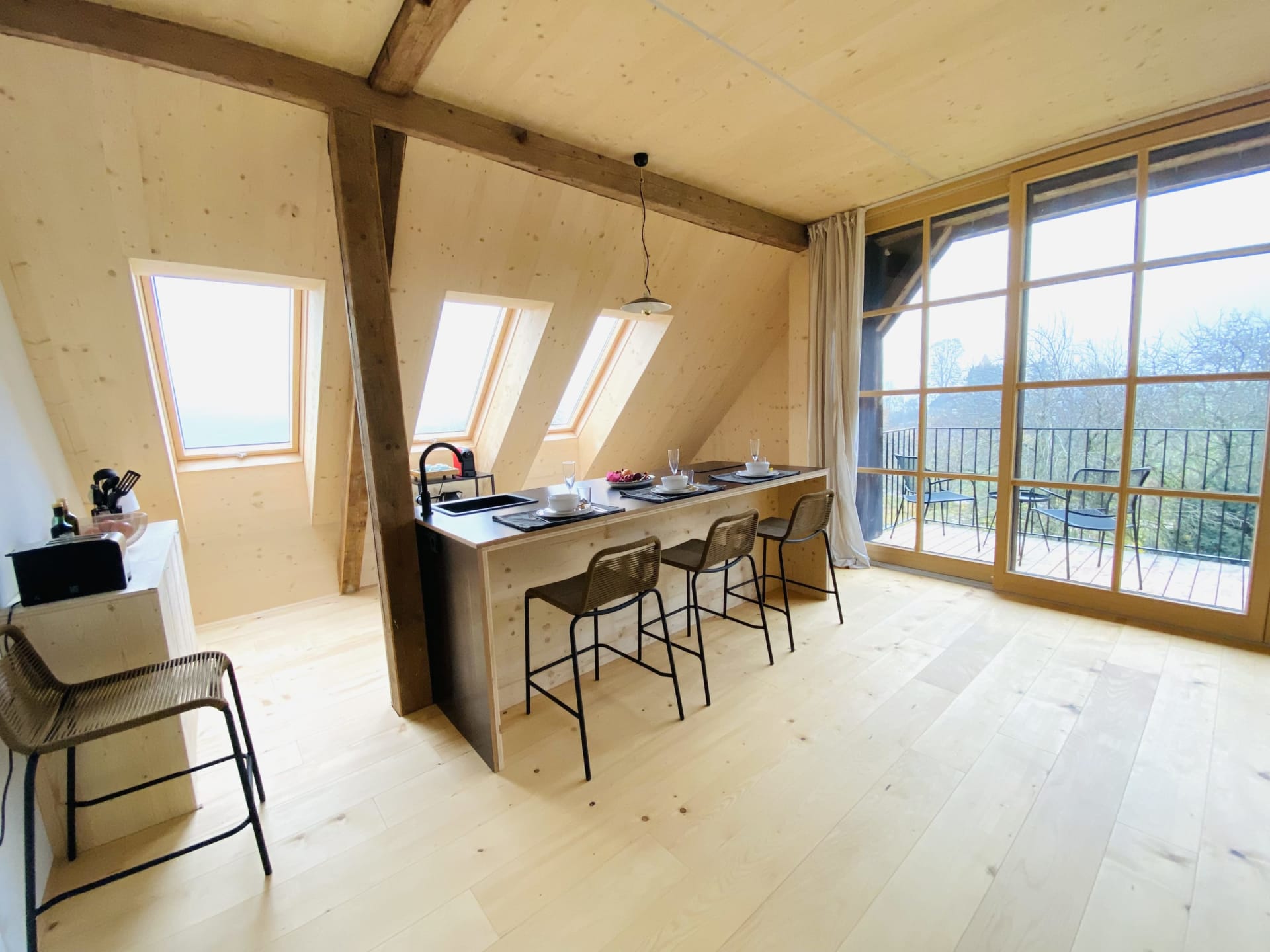 Diese Ferienwohnung ist im Erdgeschoss des Gästetrakts und ist auch für Hundebesitzer geeignet. Sie hat eine kleine Küchezeile mit Bar und Barhockern. Die Geräte sind mobil und zum Verräumen. Vom Sofa kann man den Blick über das Land genießen.
