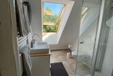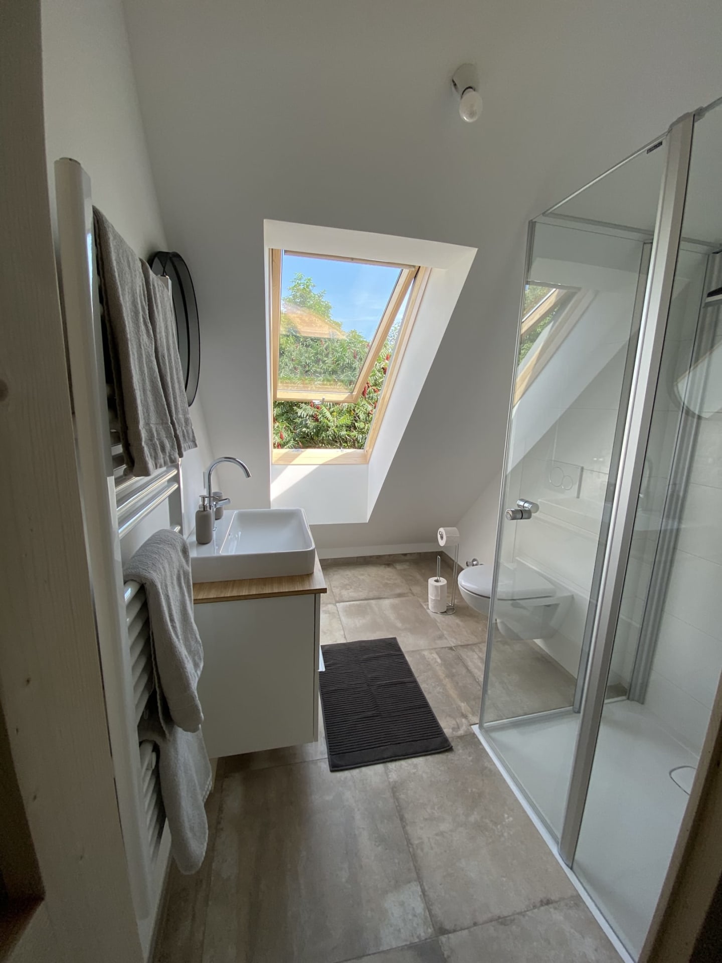 • Badezimmer mit Waschbecken, Dusche, WC, Handtuchtrockner und Aussicht