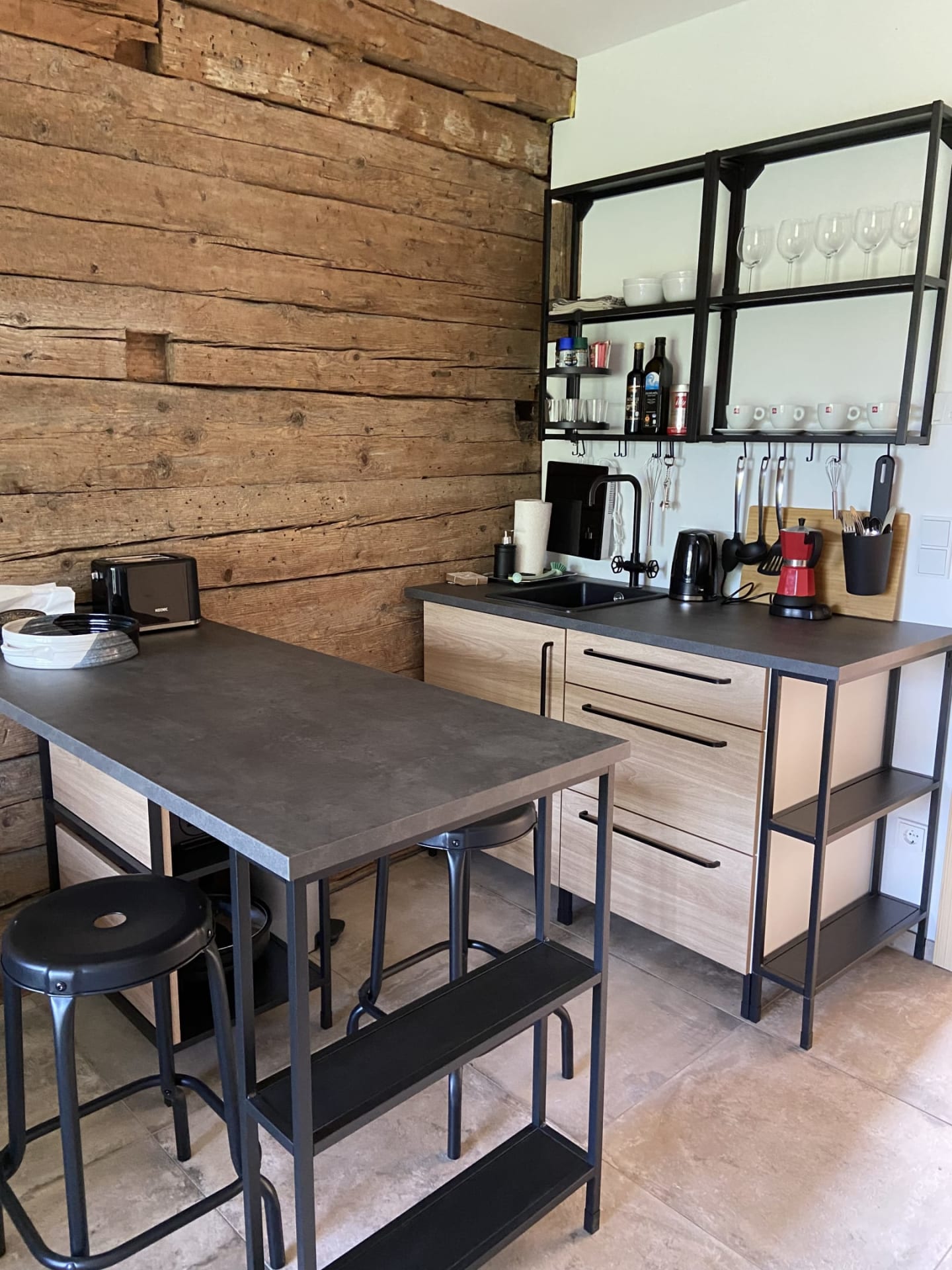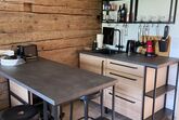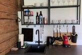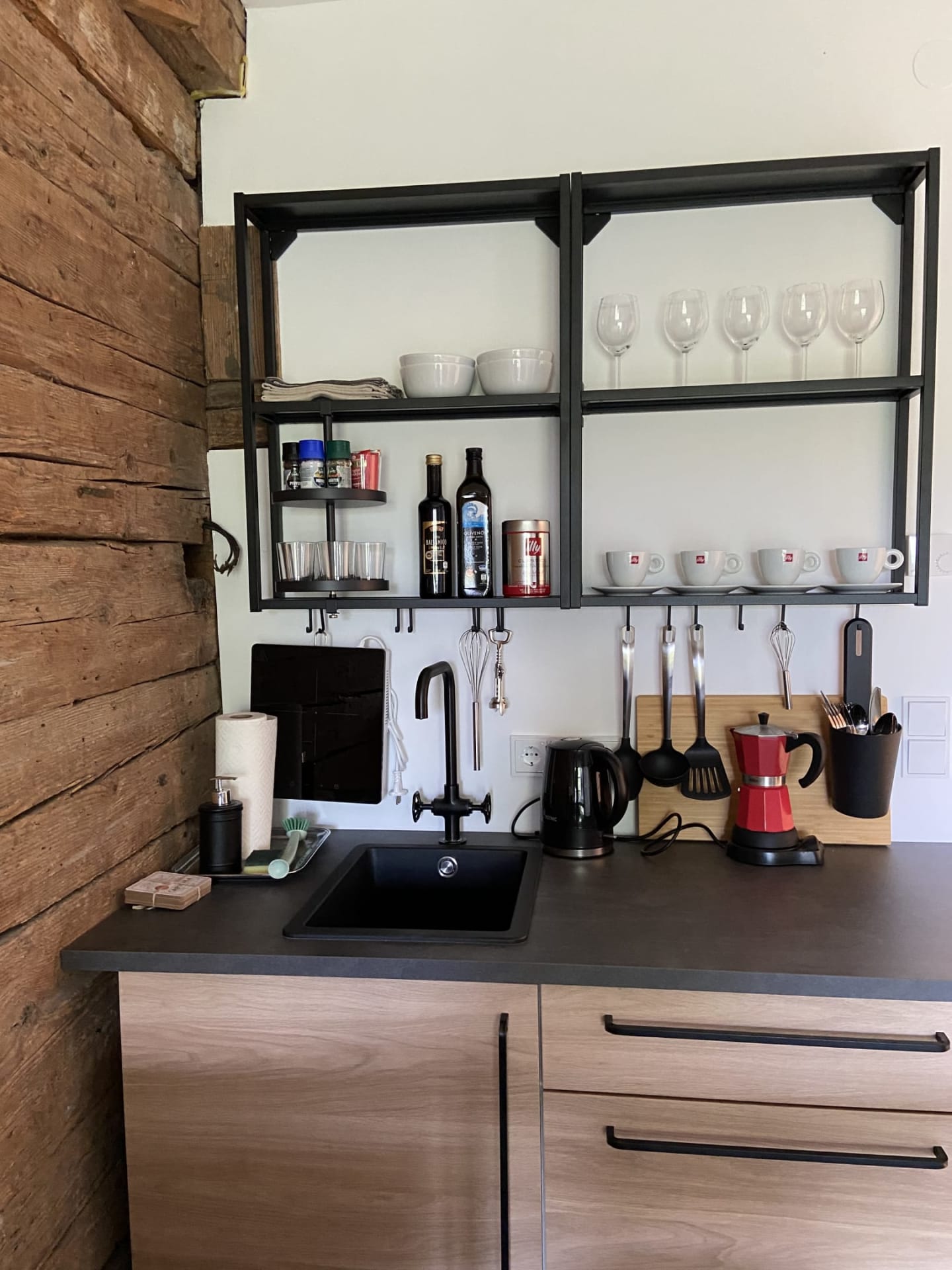 • Küche mit Toaster, Wasserkocher, Induktionsherdplatte, Mikrowelle, Partypfanne, Kaffeemaschine, Kühlschrank, Geschirr