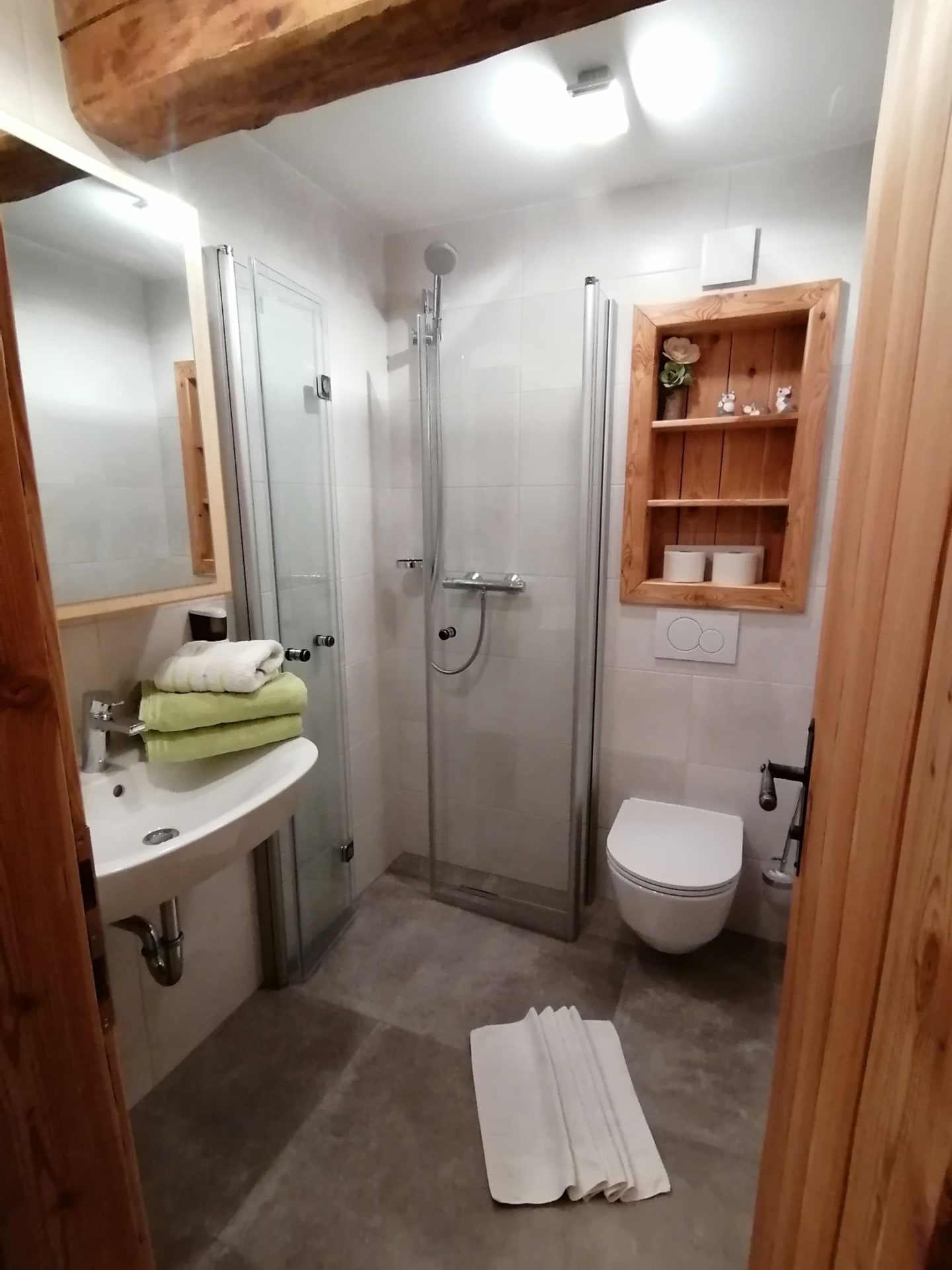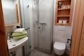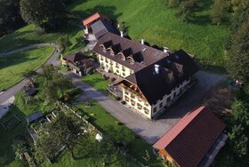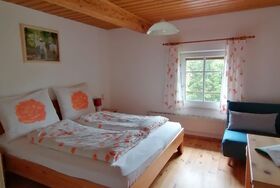 Der Parkplatz ist hinter dem Haus, wo Sie dann fast ebenerdig in den ersten Stock hineingehen (3 Stufen). Hier befindet sich gleich ein Vorhaus mit Informationsständen der Region und Platz für Ihre Schuhe und Jacken. Im ganzen Haus bitten wir Sie, Hausschuhe/saubere Schuhe zu benutzen.