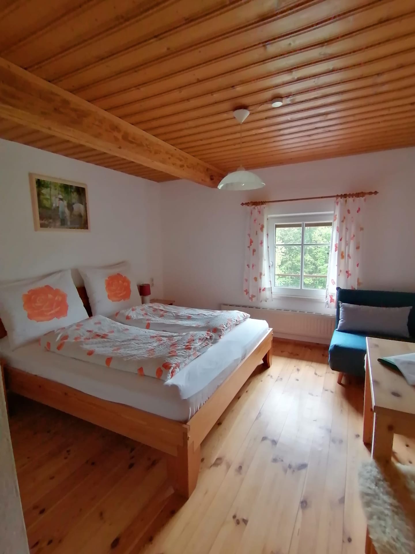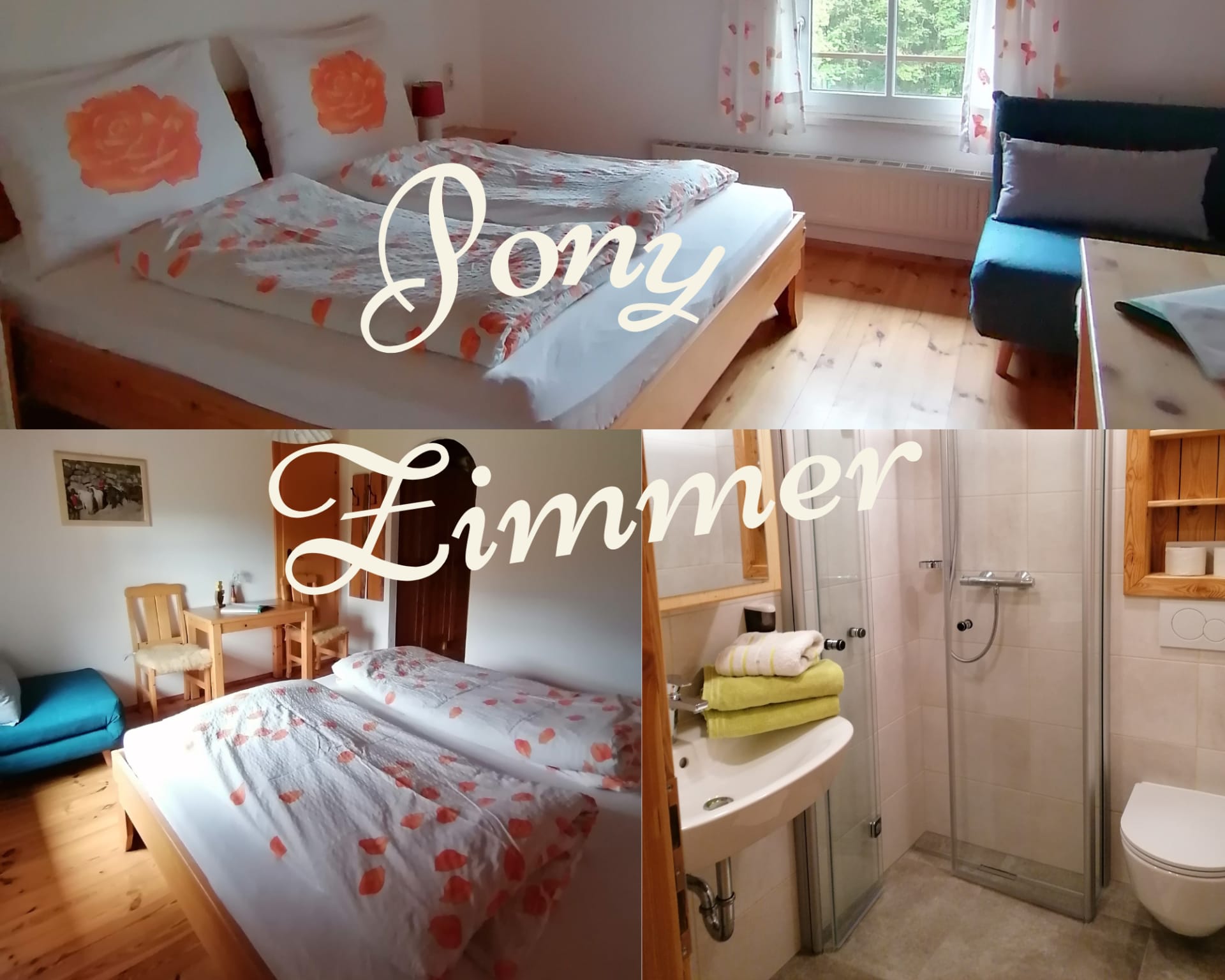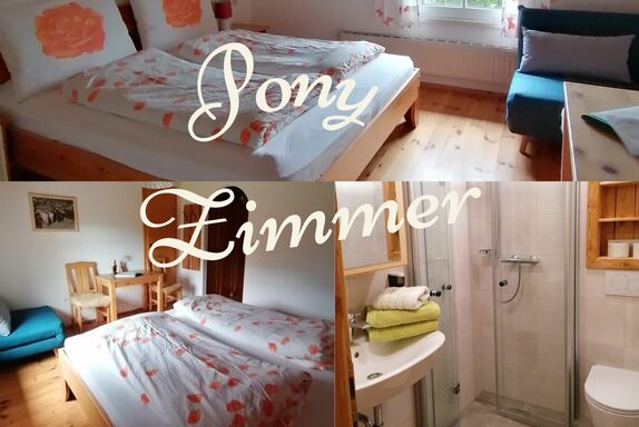 Unser Ponyzimmer ist ideal für Alleinreisende, Paare oder Familien mit Kleinkindern bis 8 Jahre. Das Zimmer hat ein Doppelbett, Tisch, 2 Stühle, 2 Nachttischkästchen und Kleiderschrank. Gerne stellen wir Ihnen ein Reisegitterbett dazu. Dusche/WC. Im Zimmer befindet sich kein Fehrnseher.