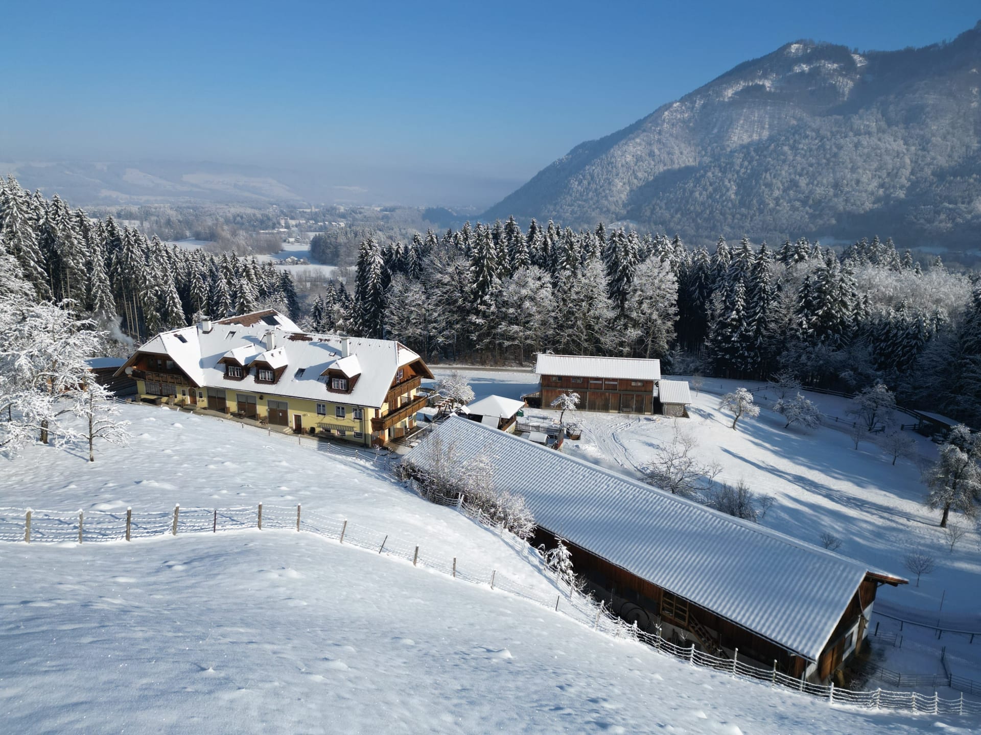 Unser Hof liegt auf 580 m Seehöhe. Da kann es schon mal vorkommen, dass im Winter Schnee liegt. Dann kann man vor der Haustüre mit dem Schlitten, Bob oder dem Strohsack den Hügel hinunter sausen - das macht Spaß!