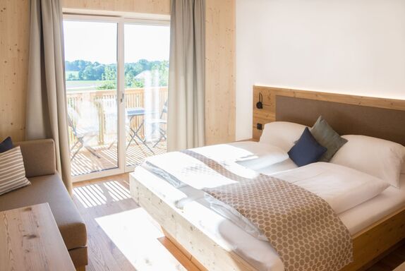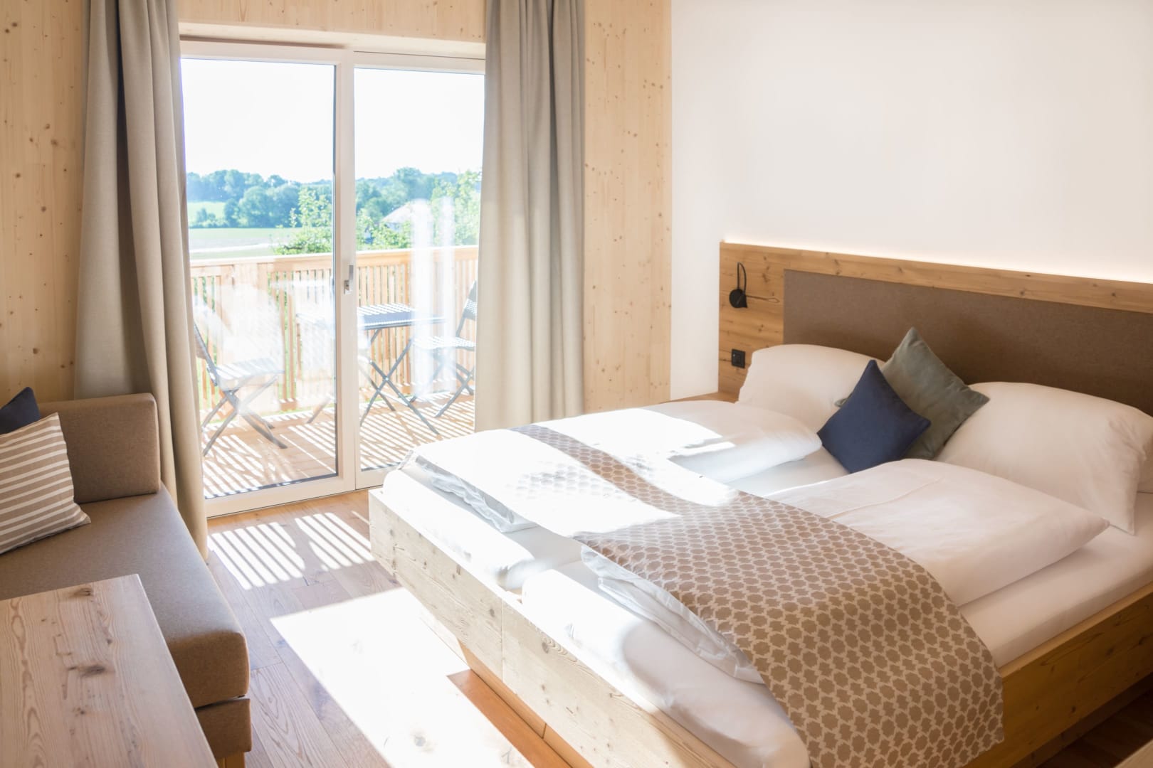 Bei uns am Hof befinden sich Zimmer und Ferienwohnungen für bis zu 8 Personen, die mit Vollholzmöbeln ausgestattet sind. Es wurde viel Wert auf die Verwendung natürlicher Materialien gelegt. Die Auszeichnungen mit 5 Blumen und 4 Hotelsternen zeigen, dass wir dem höchsten Anspruch gerecht werden.