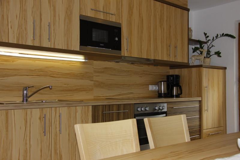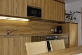 Küche mit Geschirrspüler, Backrohr mit Ceranfeld, Mikrowelle, Toaster, Wasserkocher, Kaffeemaschine sowie integrierter Wohnbereich mit Flachbildschirm, gemütlichem Sofa & Essbereich.
