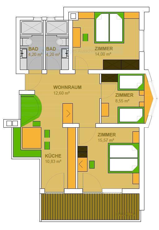 Gemütliches Appartement mit 2 Doppelzimmern (Betten trennbar) und 1 kleines Zweibettzimmer (Betten können zusammengeschoben werden) und 2 Badezimmer mit Dusche/WC.