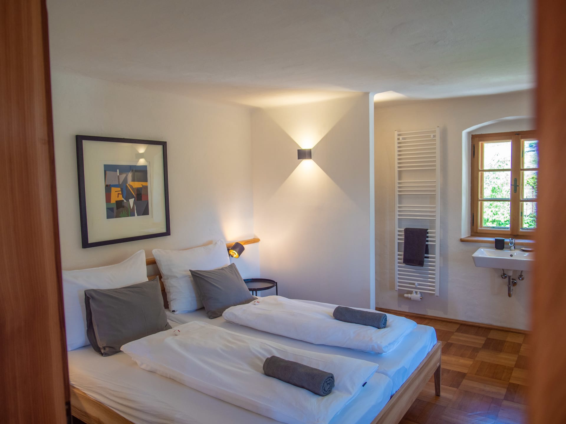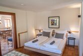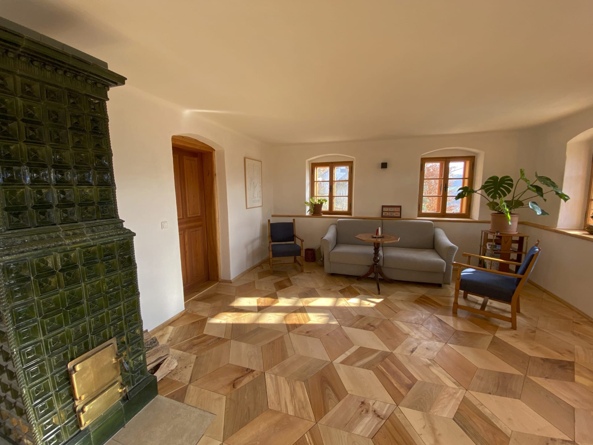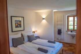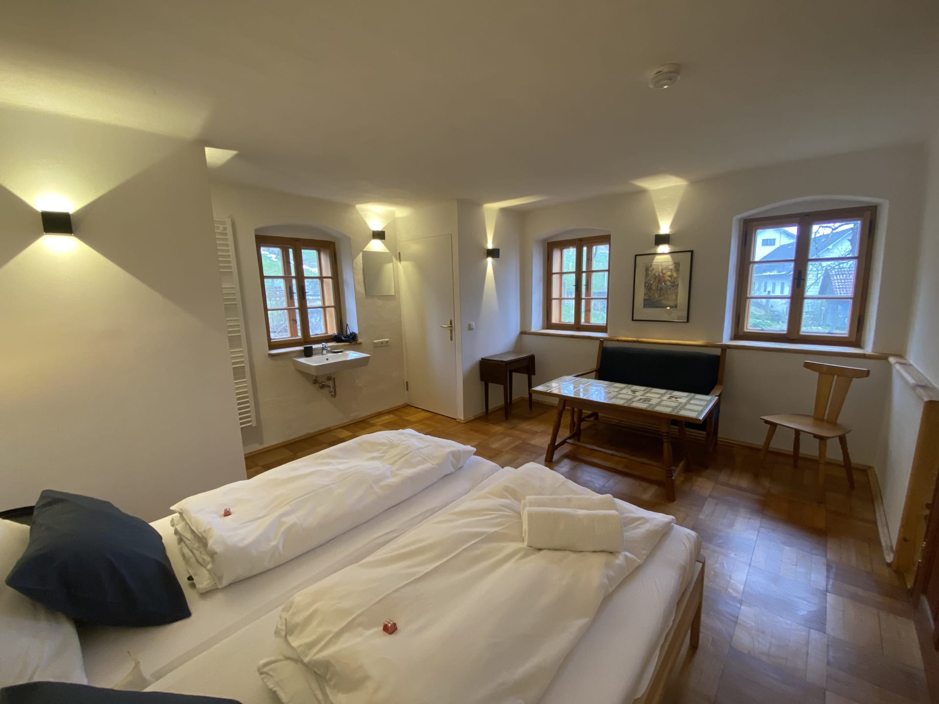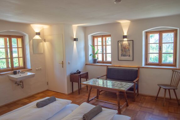 Zimmer III befindet sich im 1. Stock des Hauses und verfügt - wie auch alle anderen Zimmer - über ein abgetrenntes WC, eine Dusche und einen Waschtisch direkt im Zimmer. Der Boden ist ausgelegt mit einem wunderschönen gut erhaltenen Parkettboden aus dem Haus vor dem Umbau. Schlafen werden Sie in einem hochwertigen Grüne Erde Doppelbett und Bettwäsche aus 100% Baumwolle. Zusätzlich hat dieses Zimmer eine gemütliche Sitzgarnitur im Landhaus Stil zum Verweilen im Zimmer. In all unseren Zimmern finden Sie zusätzlich auserwählte Kunstwerke und Stoffe aus der Leinenmanufaktur Leitner im Mühlviertel. Die Fenster des Zimmers bieten Ihnen einen malerischen Blick direkt in die Zeilen des Weingartens.