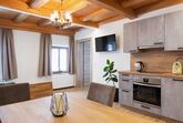 Die Ferienwohnung bietet Platz für 4-5 Personen und ist sehr geräumig. Sie verfügt über eine Küche mit gemeinsamem Wohn-Essbereich, zwei Schlafzimmer (miteinander verbunden) und ein Badezimmer.