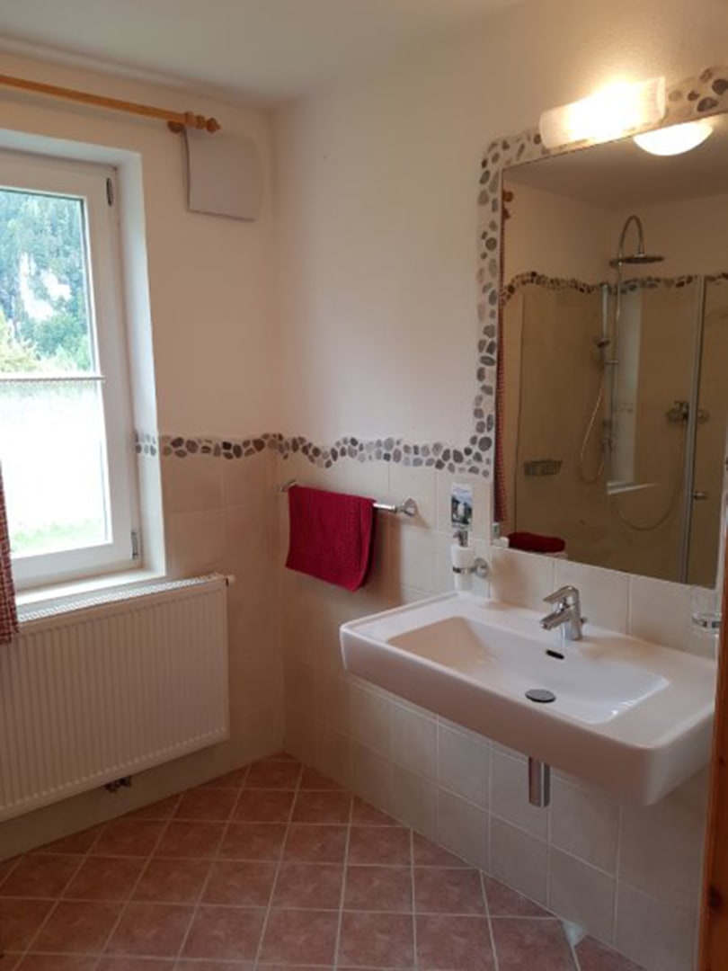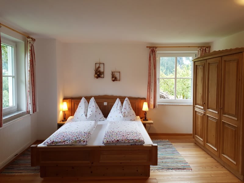 Das Doppelzimmer im bäuerlichen, rustikalen Stil ist mit Dusche, WC und Fernseher ausgestattet. Das sehr helle Zimmer mit Holzfußboden ist ca. 36 m² groß und bietet eine tolle Aussicht (z.B. zum Wasserfall).