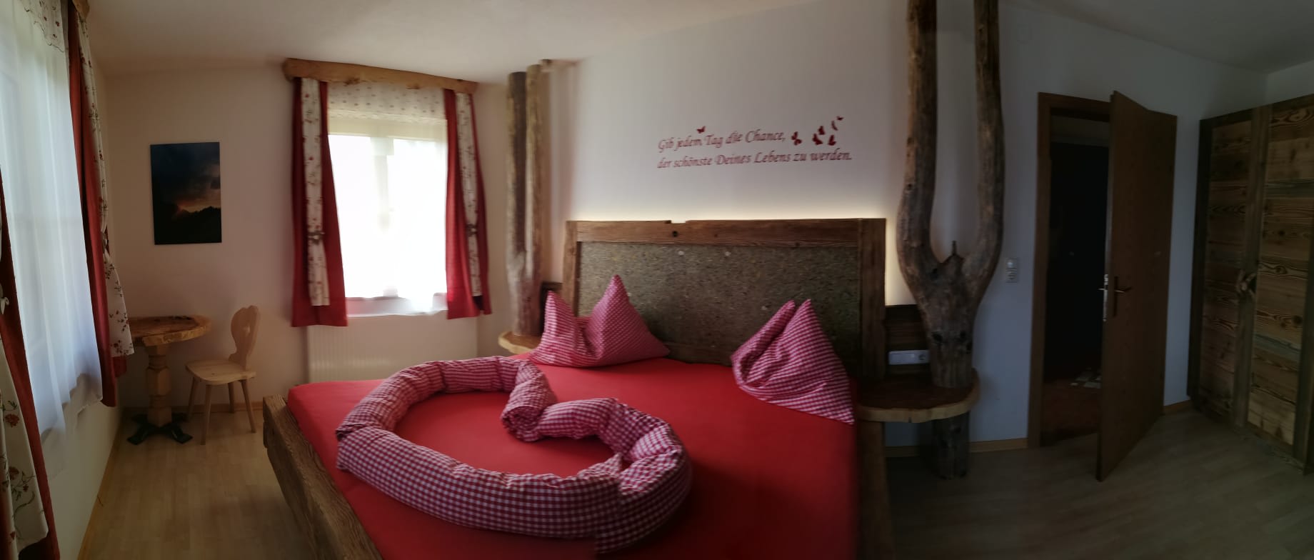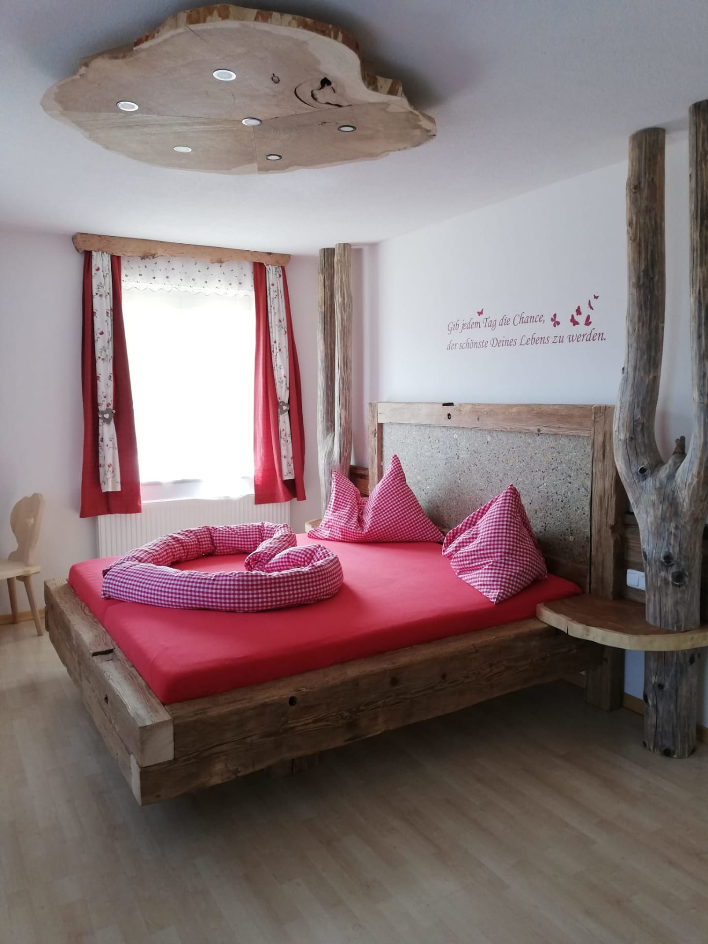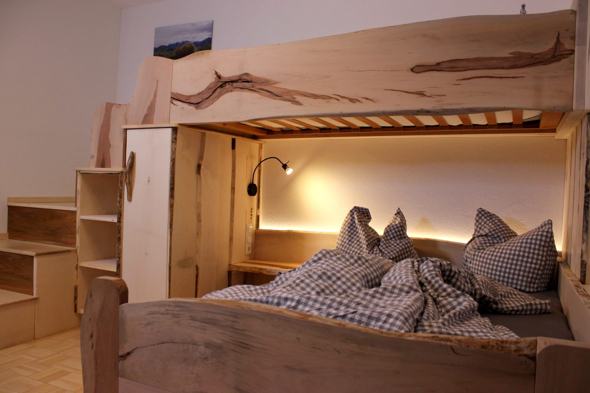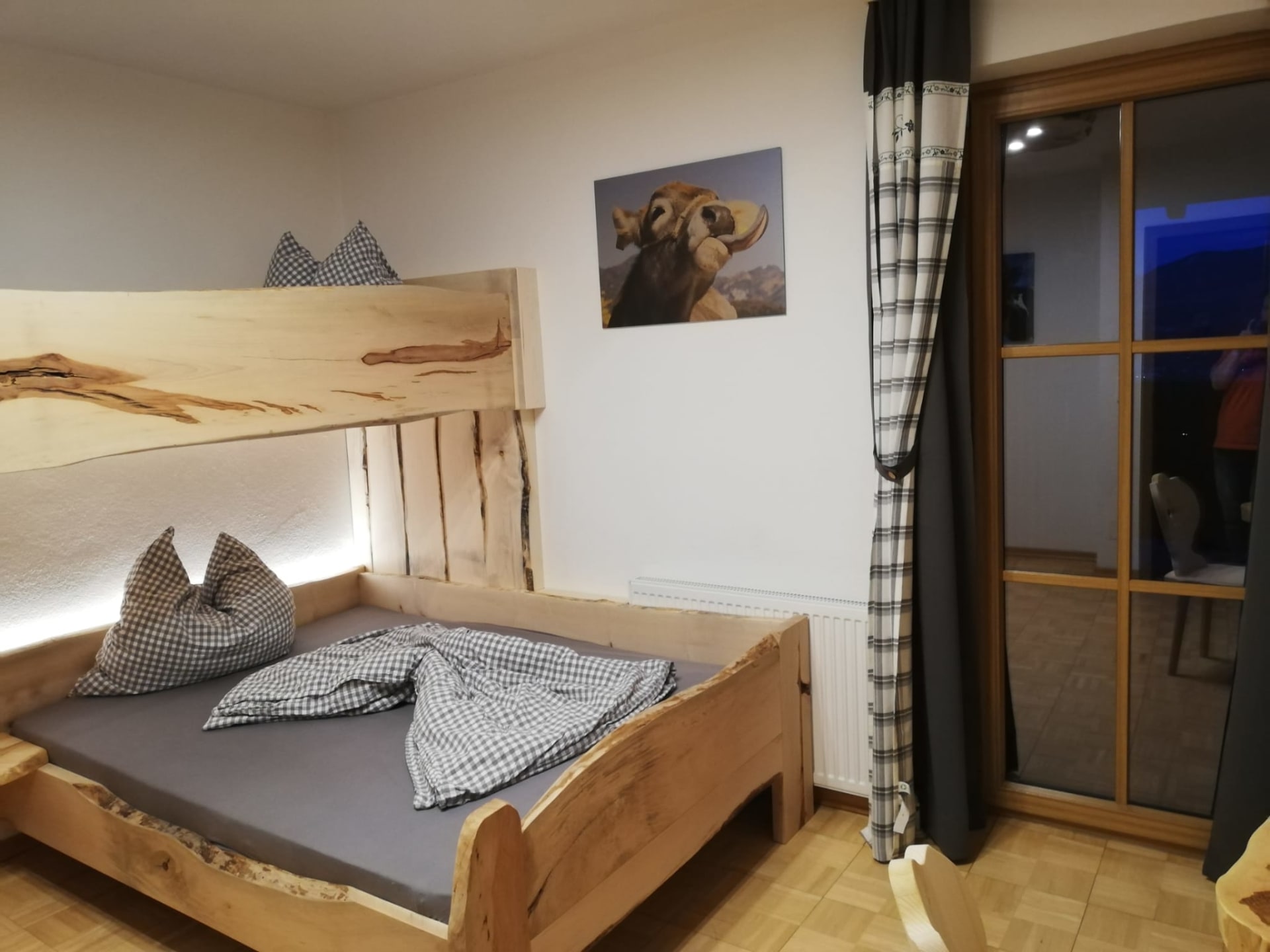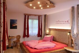 Willkommen in der Ferienwohnung Seespitz für 2 bis 4 Personen, die Bauernhofcharme und modernen Komfort perfekt verbindet. Tischlerarbeiten aus Holz unseres eigenen Waldes verleihen der Wohnung eine besondere Note: Im Elternschlafzimmer wacht ein besonderer Baum über euren Schlaf, und das Kopfende des Bettes ist liebevoll mit duftendem Heu und Heublumen verziert. Auch im Kinderzimmer gibt es ein tolles Stockbett aus heimischem Holz, das kleinen Kletterfans sicher gefällt und Platz für bis zu drei Kinder bietet.