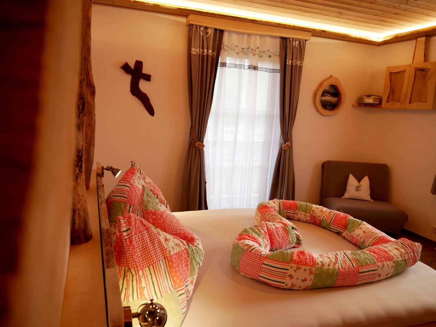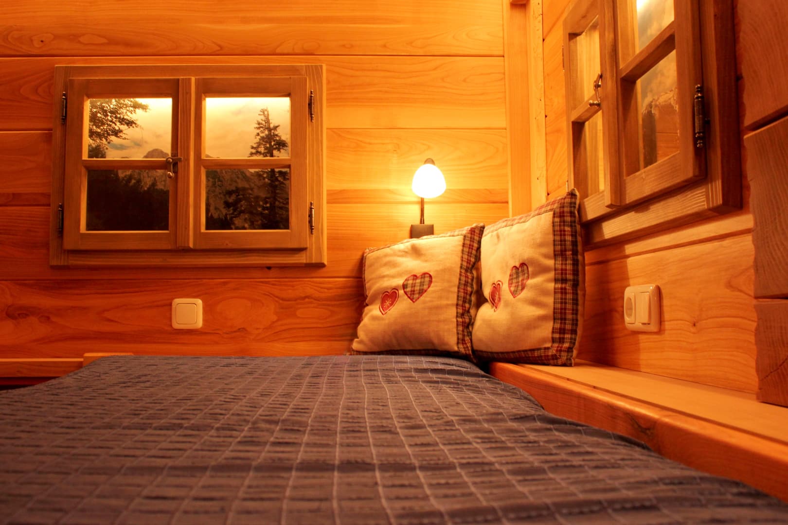 Euer persönlicher Rückzugsort im Almhüttenstil! Das Zimmer Hohe Nock für 1 bis 3 Personen bringt echtes Almfeeling ins Haus: Das liebevoll gestaltete Bett, gefertigt von einem Tischler, erinnert mit seinem Design an eine stilisierte Almhütte – rustikal, charmant und einfach gemütlich. Auch das zusätzliche Couchbett fügt sich perfekt in das alpine Ambiente ein.