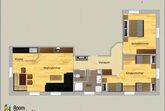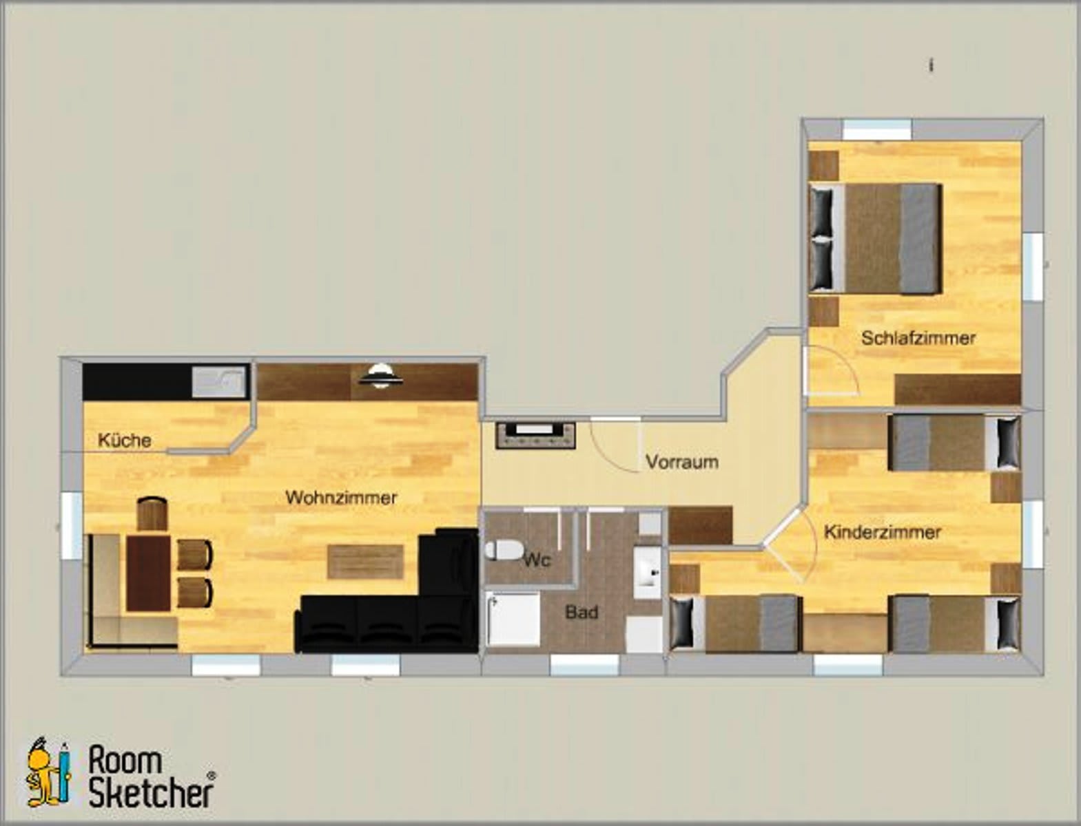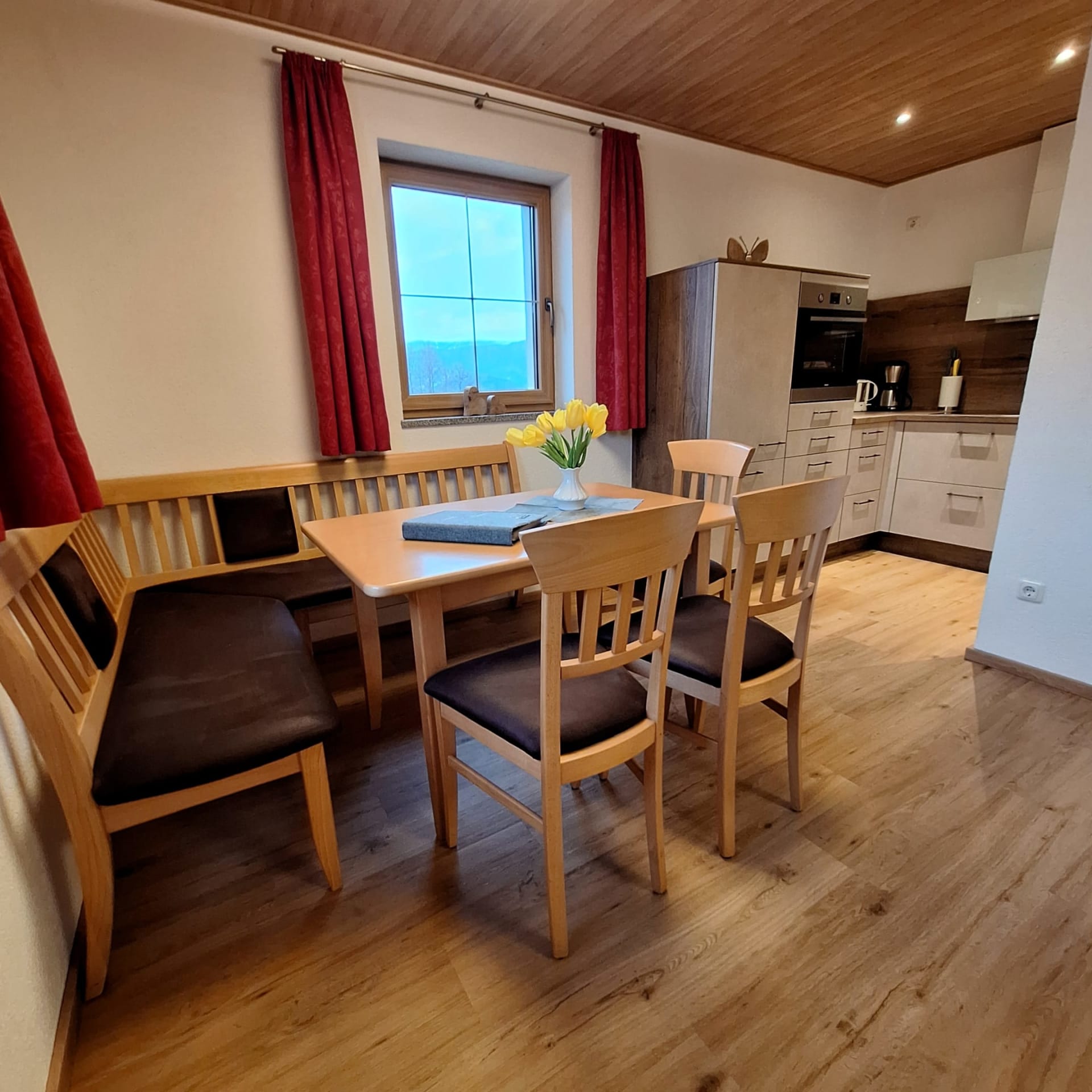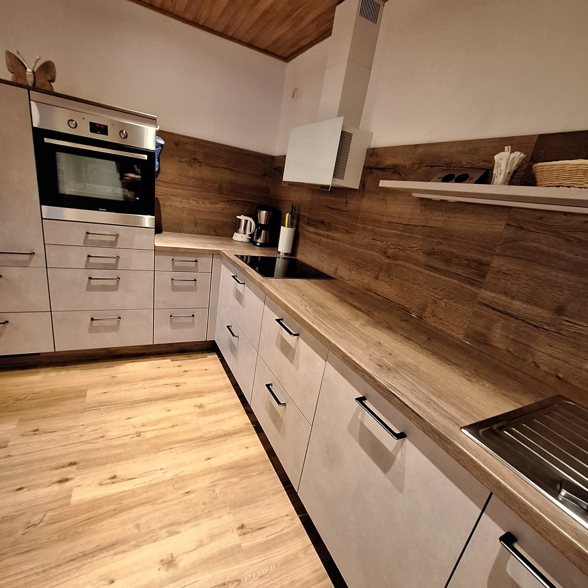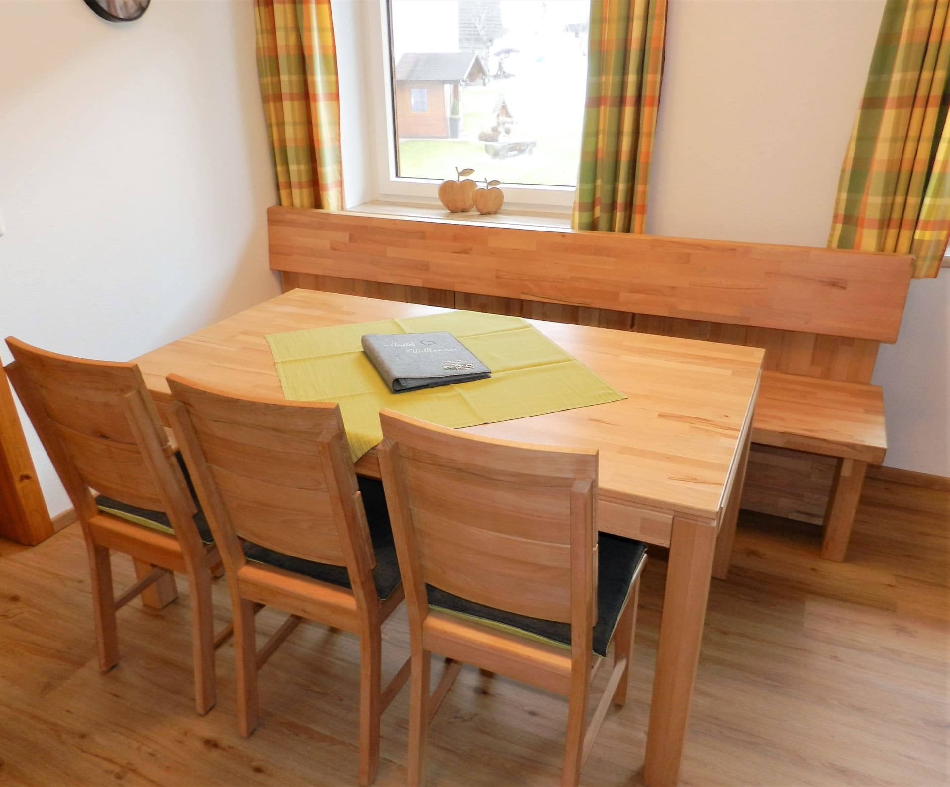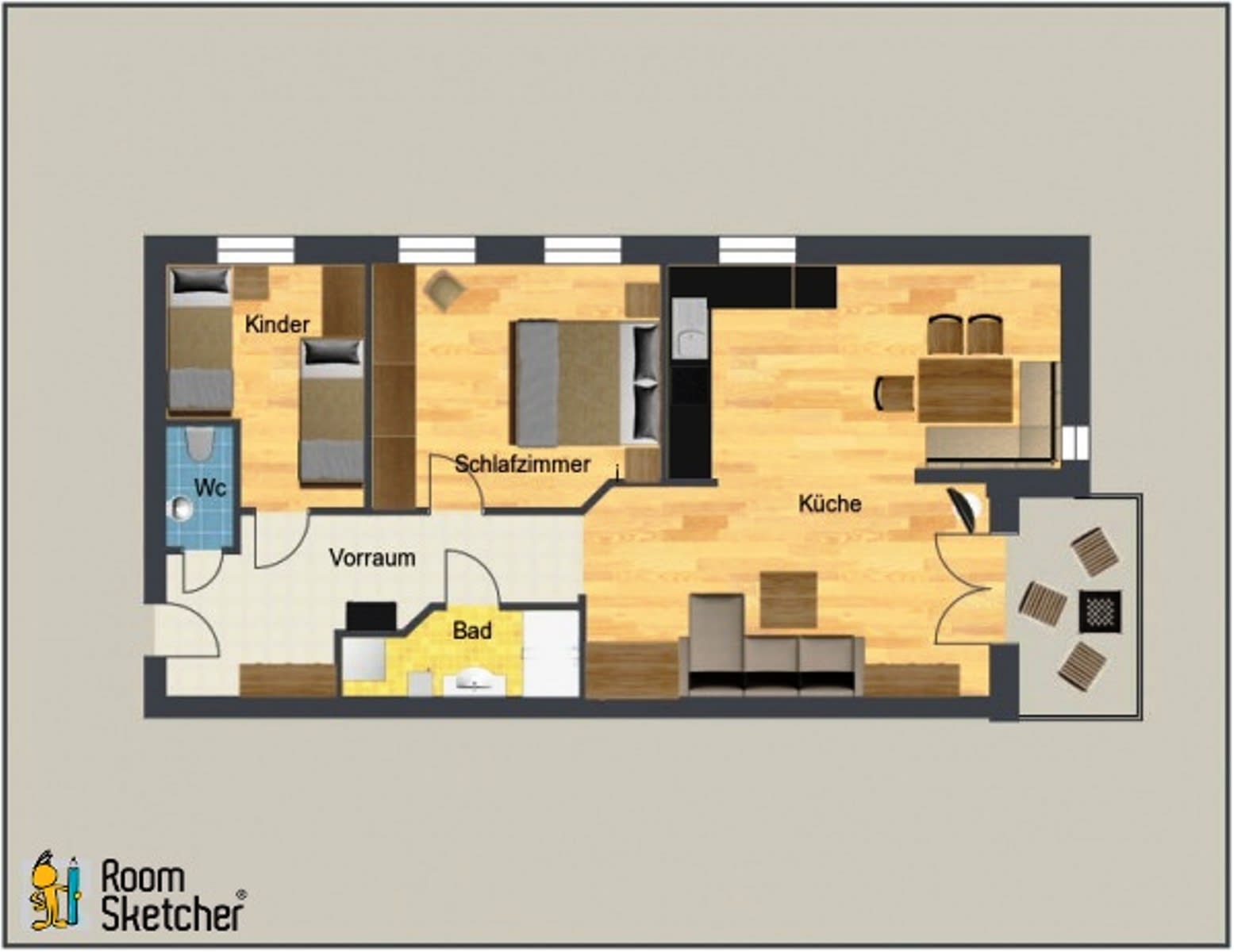 Geräumige Ferienwohnung mit 80 m² für bis zu 7 Personen mit einem Vorraum, Dusche, WC getrennt, einen großen Wohnraum mit Essecke, eine Küche mit Geschirrspüler, ein Doppelbettzimmer und ein Kinderzimmer mit 3 Einzelbetten. Babyausstattung ist jederzeit möglich.