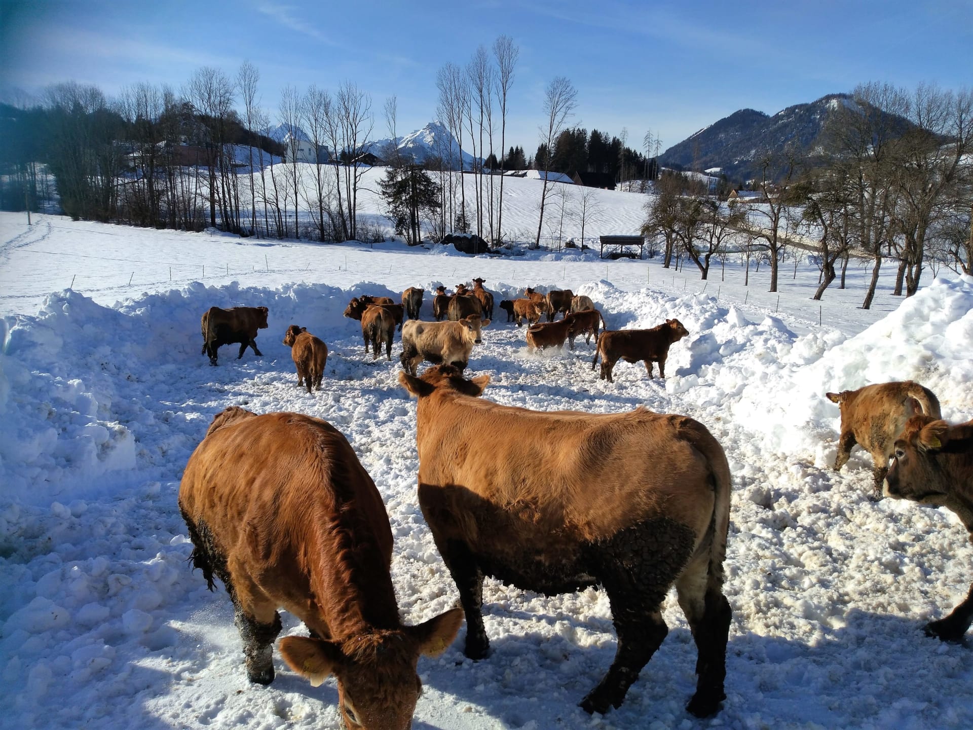 Unsere Stalltüre steht auch im Winter für Sie offen. Speziell zum Beobachten der Tiere, wie gemütlich sich das Kälbchen zu seiner Mama kuschelt.
