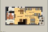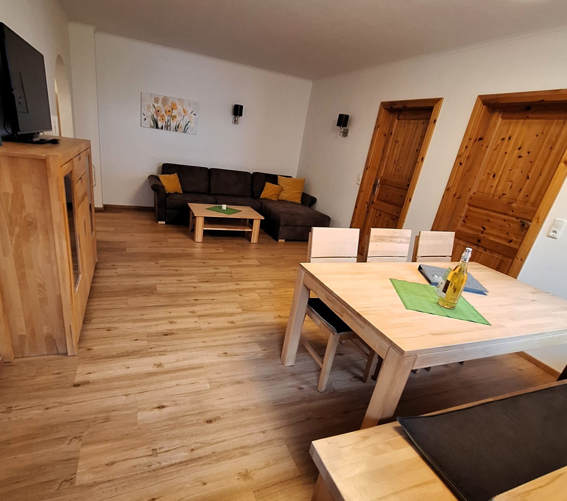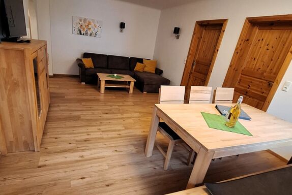 Sehr geräumige Ferienwohnung für bis zu 7 Personen mit einem Vorraum, Dusche/ WC getrennt, einen großen Wohnraum mit Essecke, eine Küche mit Geschirrspüler und Mikrowelle, ein Doppelbettzimmer mit Balkon und ein Kinderzimmer mit 3 Einzelbetten. Babyausstattung ist jederzeit möglich.