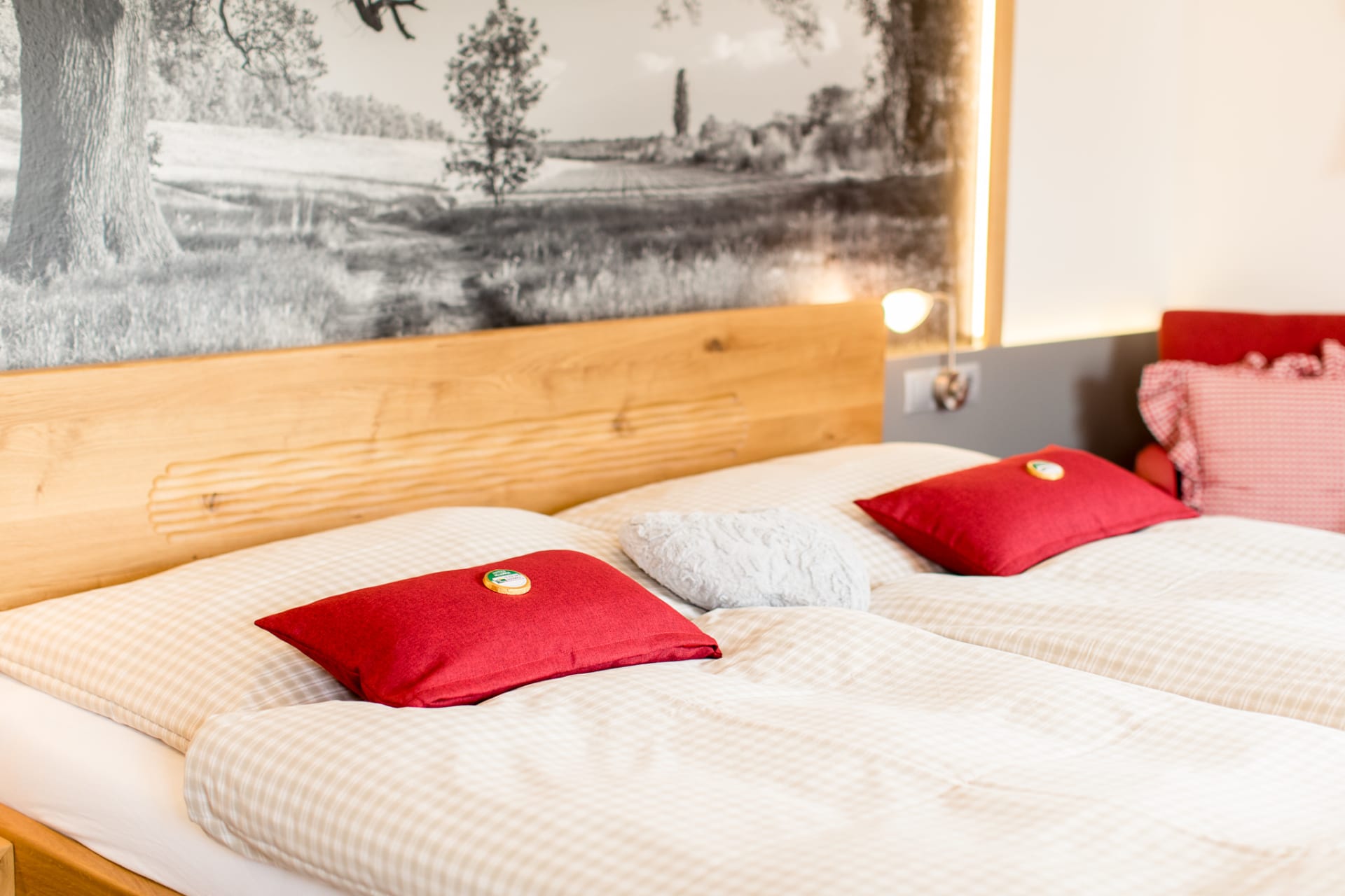 Sich Zeit nehmen. Tagträumen. Energie tanken. Und sich neu entdecken in unseren gemütlichen Ferienwohnungen für 2 Erwachsene zum Wohlfühlen und Kuscheln im Eichen-Vollholzbett. Heimelige Rückzugsorte für schöne Träume.