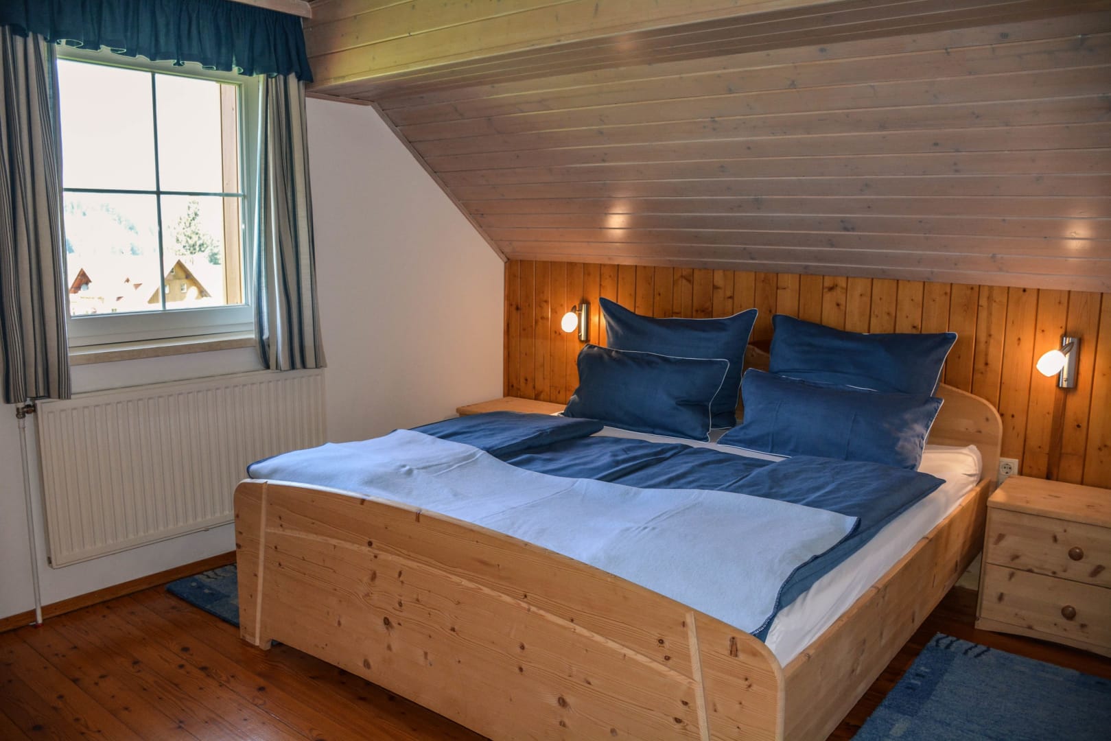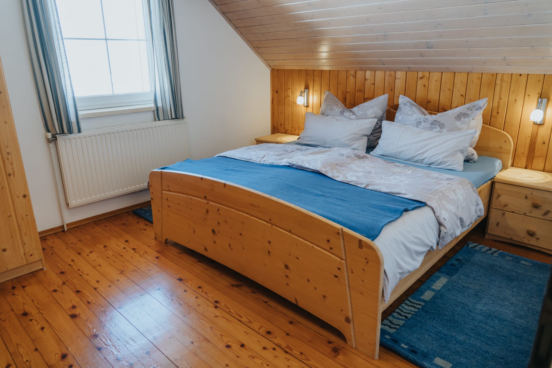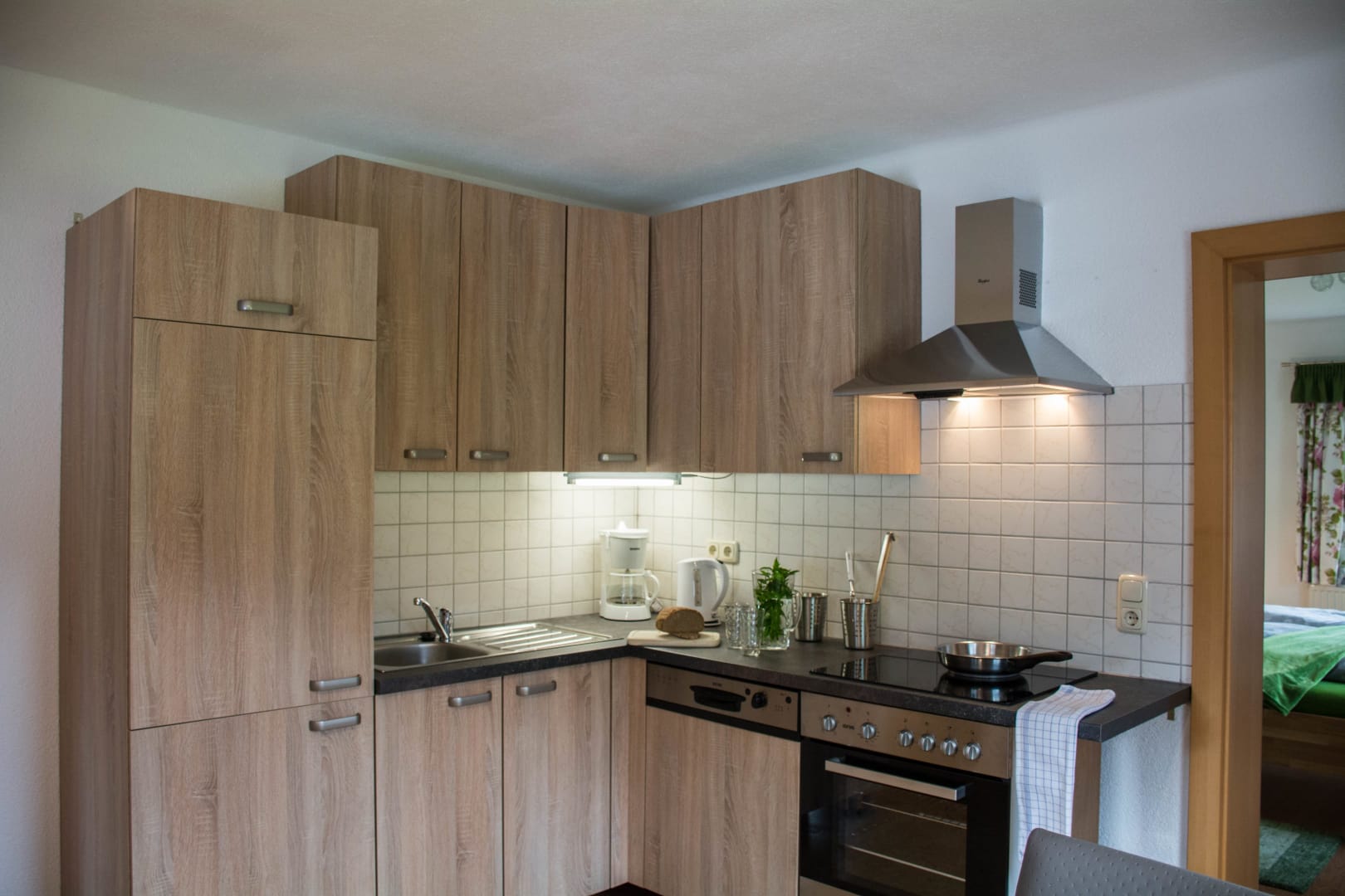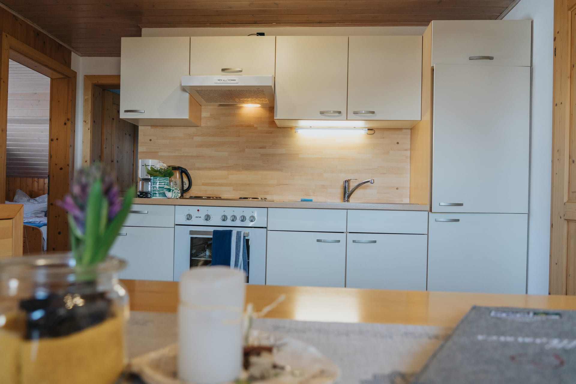 Eine geräumige Wohnküche mit sehr gemütlicher Sitzecke heißt Sie in dieser Ferienwohnung willkommen. Es gibt zwei seperate Schlafzimmer mit Doppelbetten und ein Bad mit Tageslicht, wo Platz genug für alle ist. Die Küche in dieser Ferienwohnung ist voll ausgestattet und bietet neben einem Backrohr und einer Kühl-Gefriermöglichkeit auch eine Kaffeemaschine und einen Wasserkocher. Es gibt einen Flachbildferneher und Wlan im ganzen Haus. Am Balkon können Sie am Morgen schon die Sonne genießen.