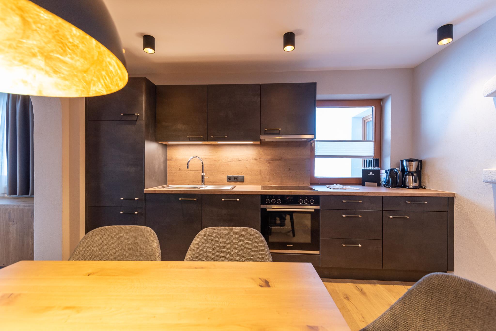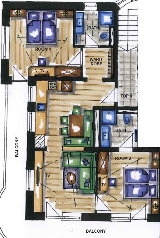 Appartement (ca. 80m²); voll ausgestattete Küche mit Backrohr, Microwelle, Geschirrspül- und Kaffeemaschine, gemütlicher Esstisch, Kabel TV, großer Wohnraum mit ausziehbarer Sofalandschaft, 2 Schlafzimmer mit Doppelbett, großer Kleiderschrank, 2 Badezimmer mit Dusche/WC, Balkon.