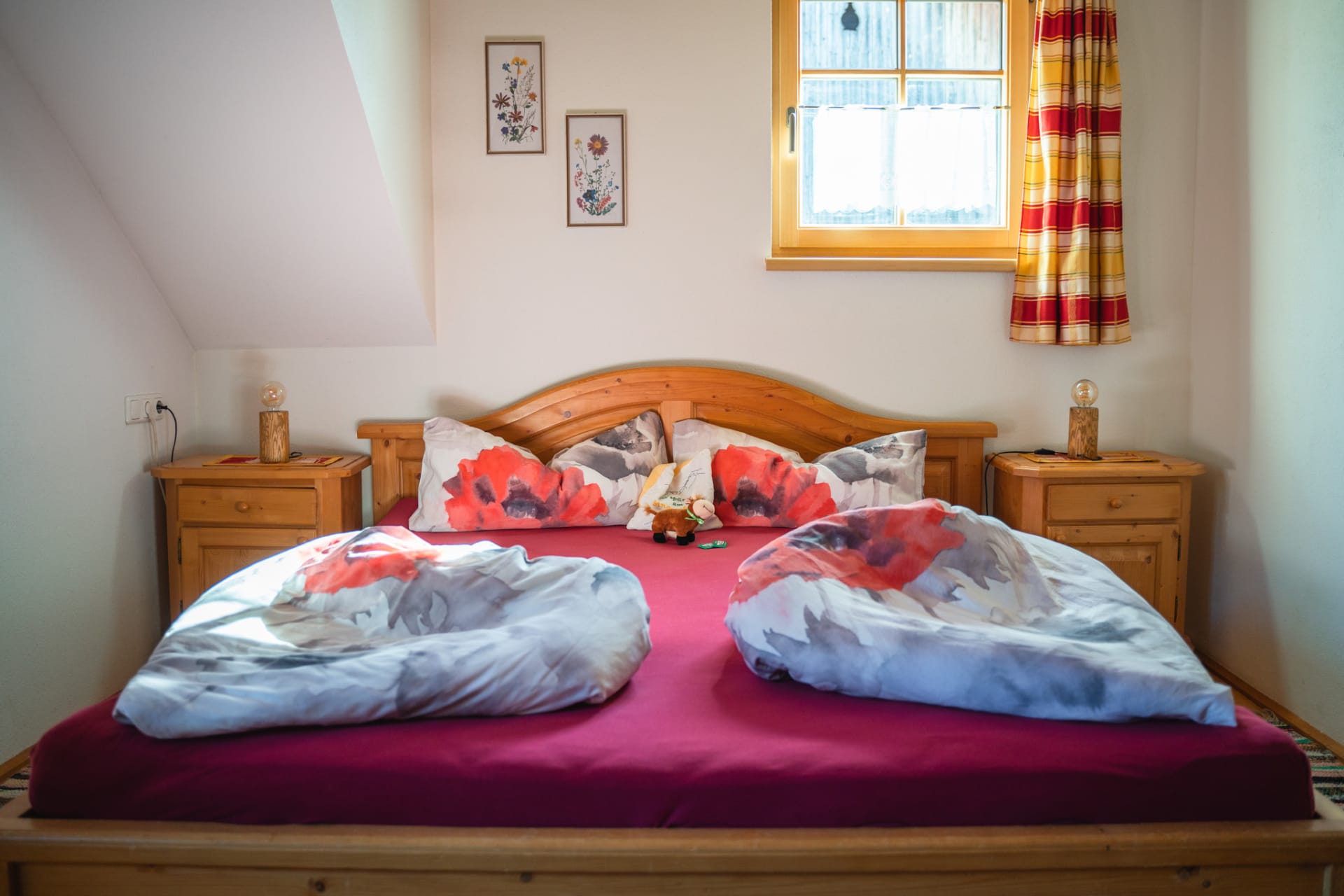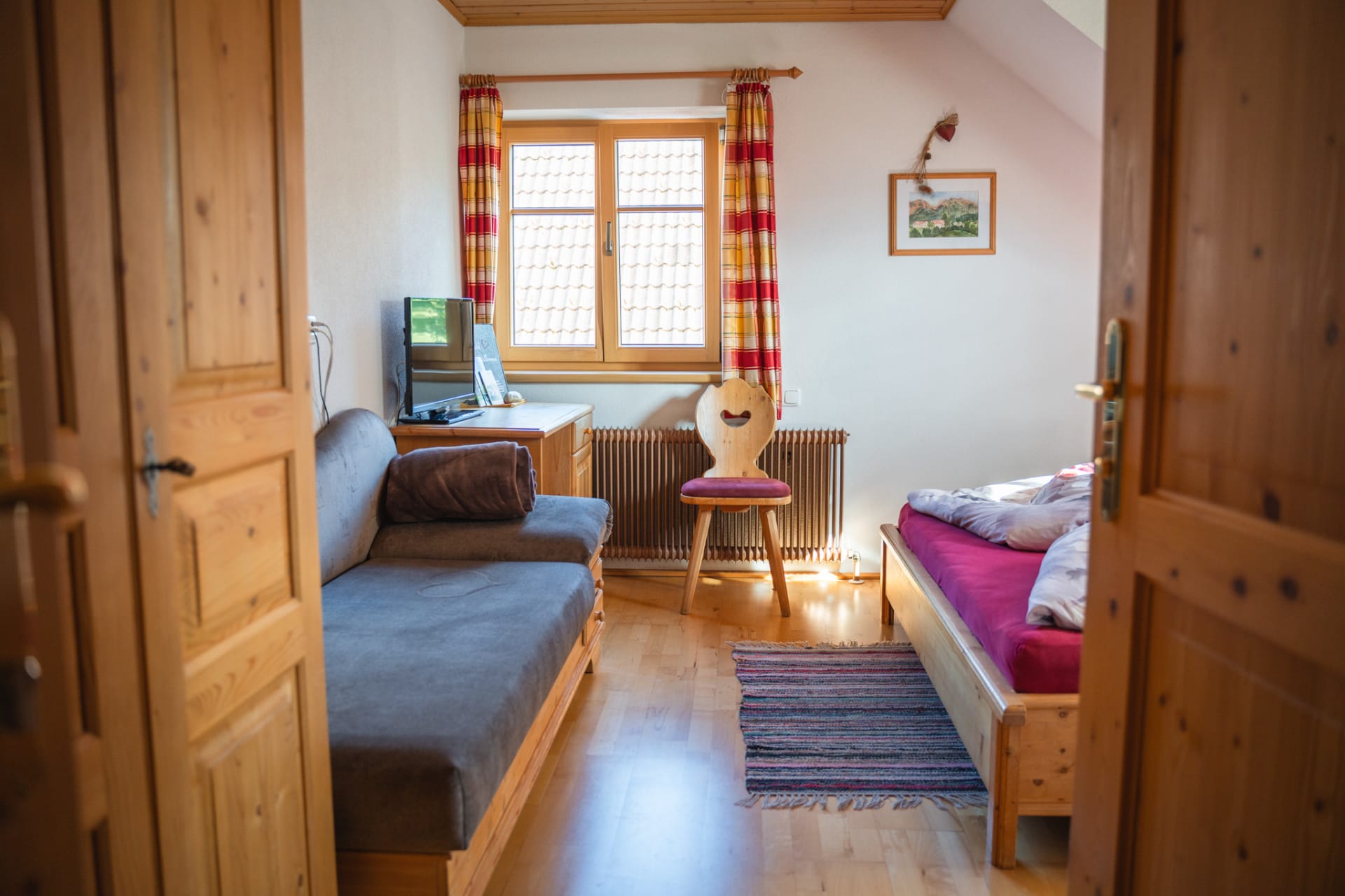 Jedes Jahr ist die Freude groß, wenn die Natur blüht mit ihren bunten Farben. Erleben Sie dieses Gefühl in unserem Doppelzimmer „Sommer“. Es lädt mit den kräftigen Farben des Sommers zum Wohlfühlen ein. Genießen und spüren Sie, wie unsere erdigen Holzmöbel die Natur hineinholen. Der Sommer ist im 2. Stock im Bauernhaus daheim und wartet auf Sie.