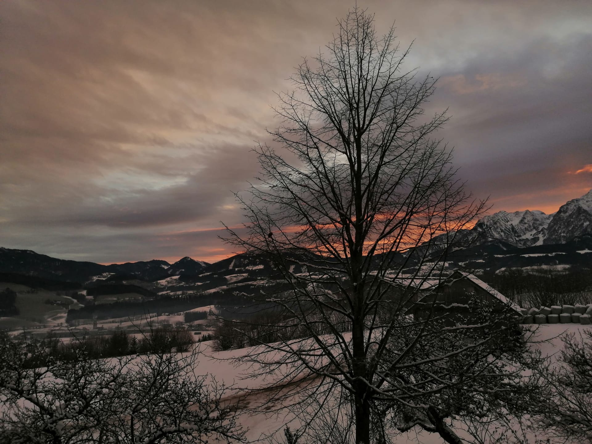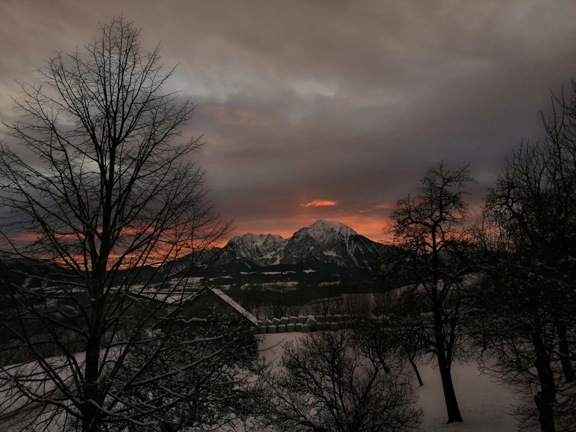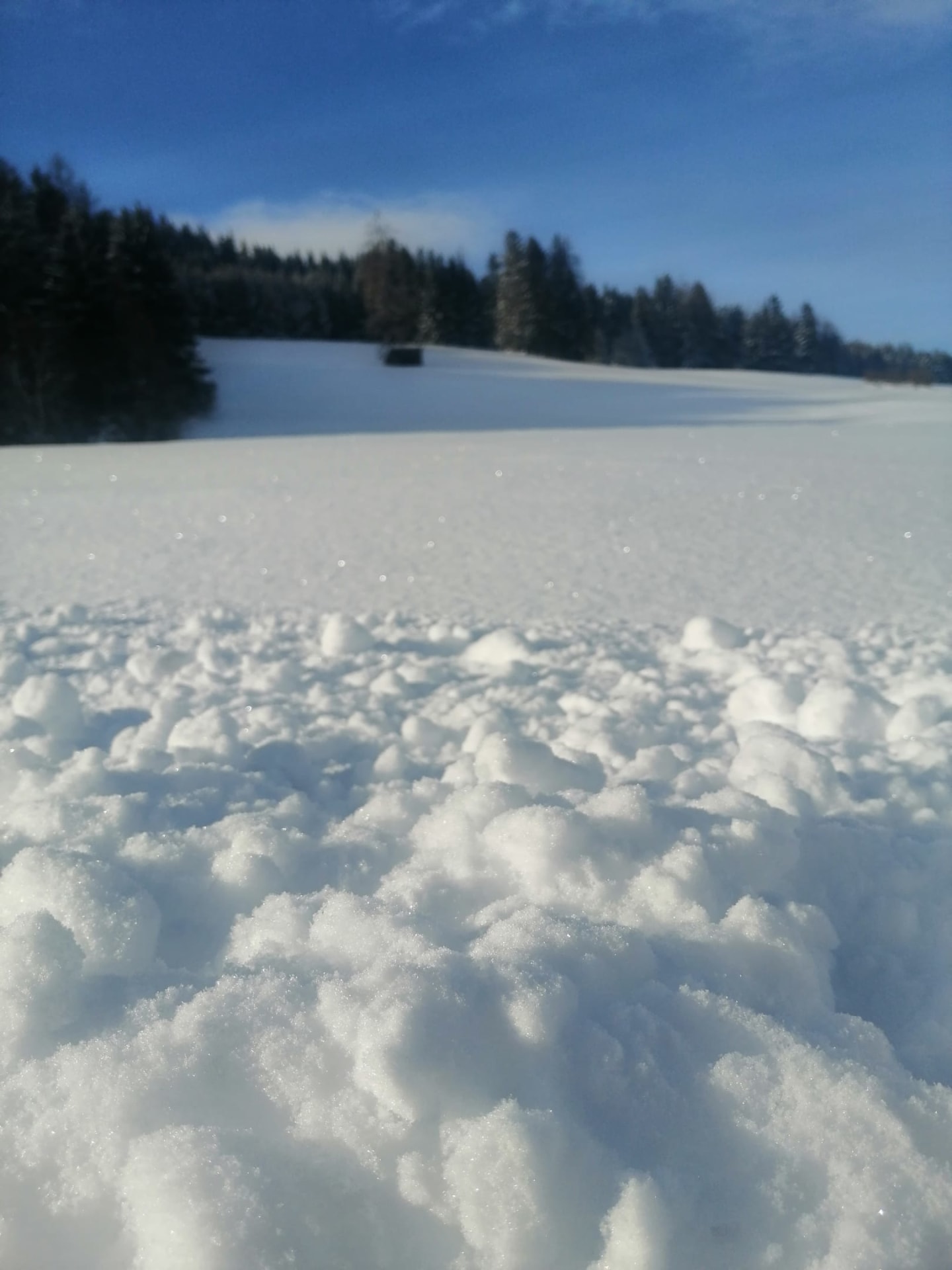 Nah am Waldrand inmitten verschneiter Wiesen können Sie
