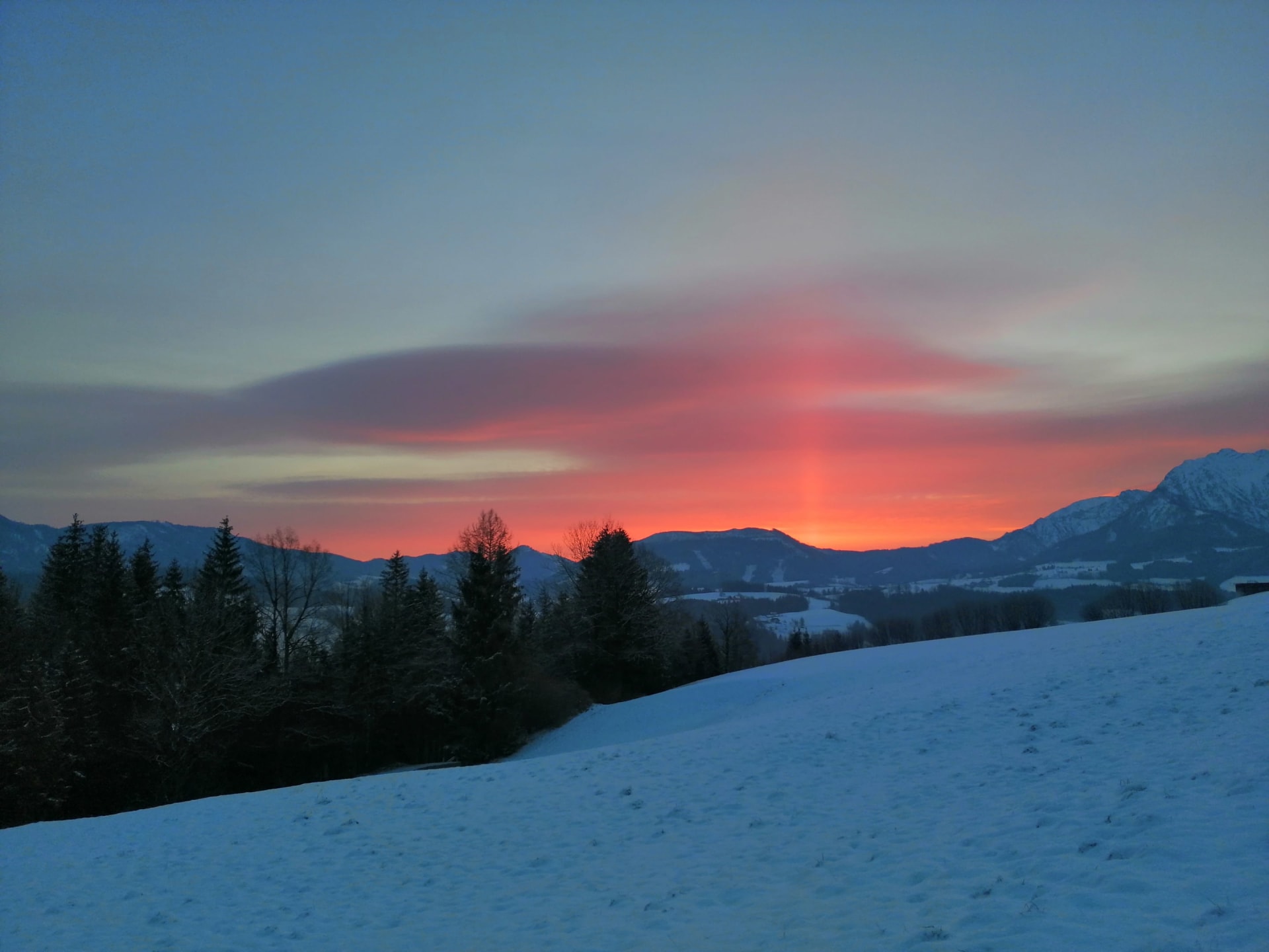 Nah am Waldrand inmitten verschneiter Wiesen können Sie