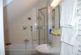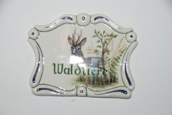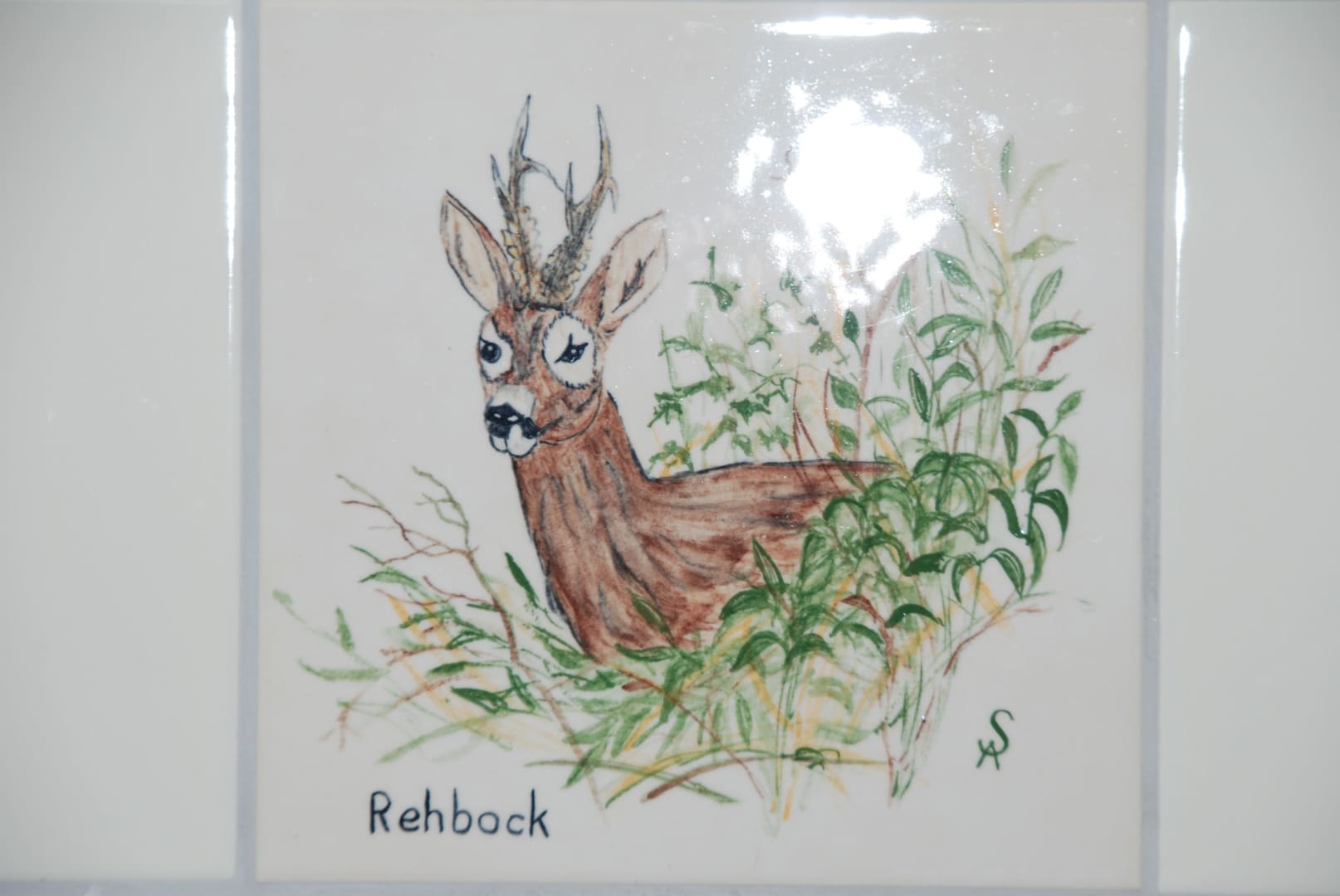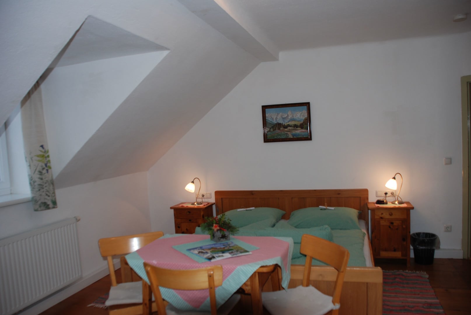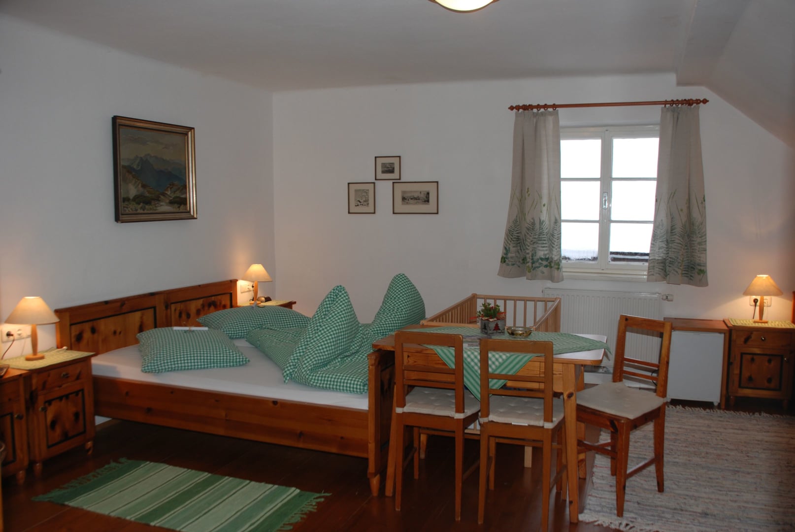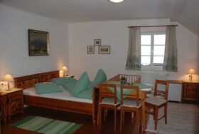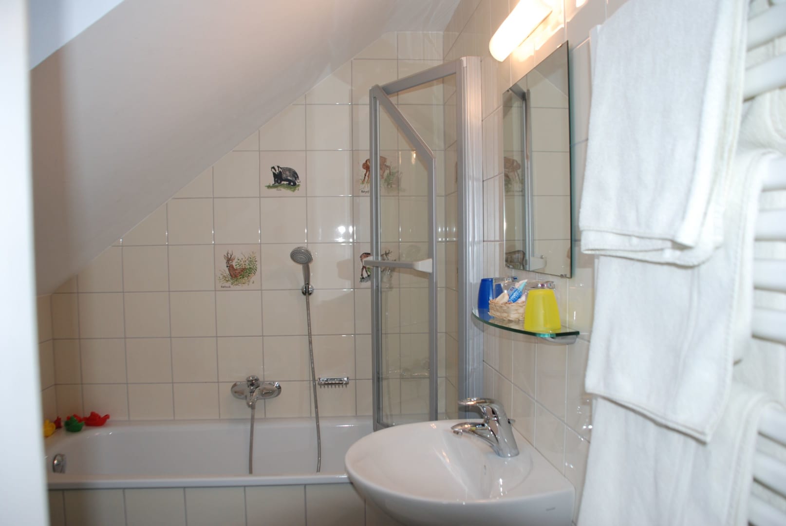 Das sehr geräumige Zimmer ist in rustikaler, bäuerlicher Einrichtung gehalten. Es ist das optimale Zimmer für Familien mit kleinen Kindern. Das Badezimmer ist hell. Die handbemalten Fliesen zeigen viele Tiere aus Wald und Gebirge.