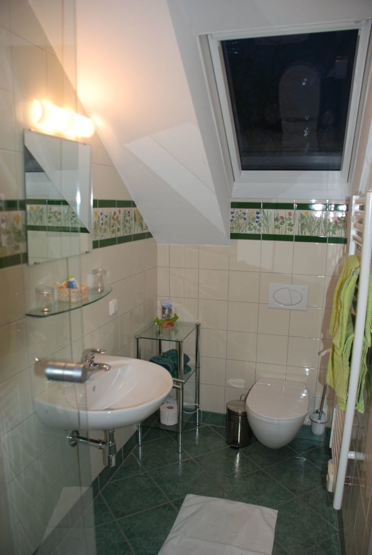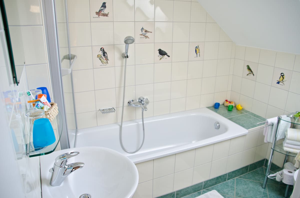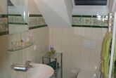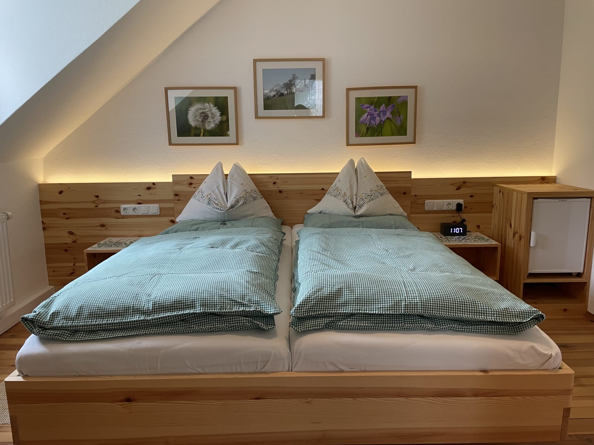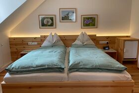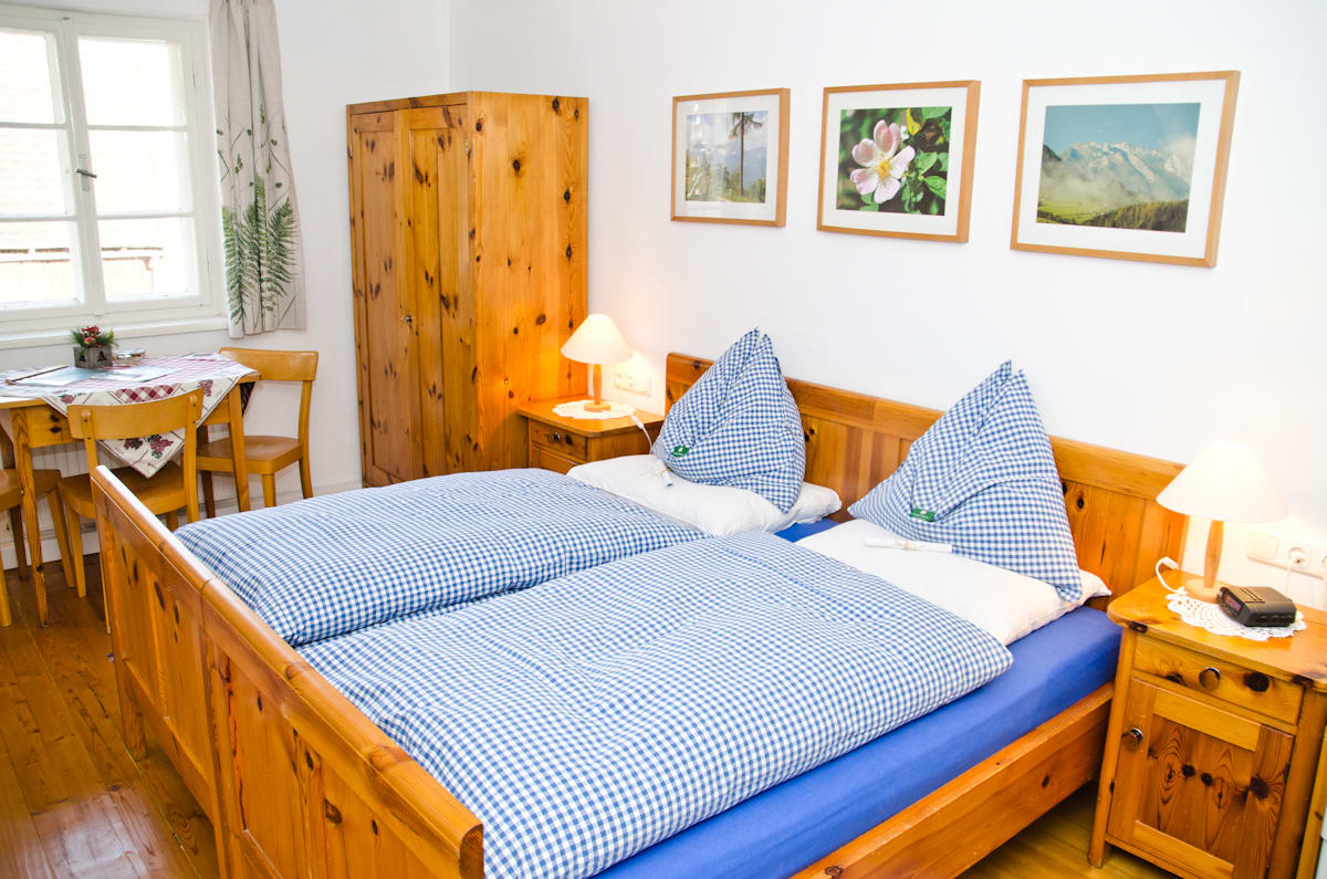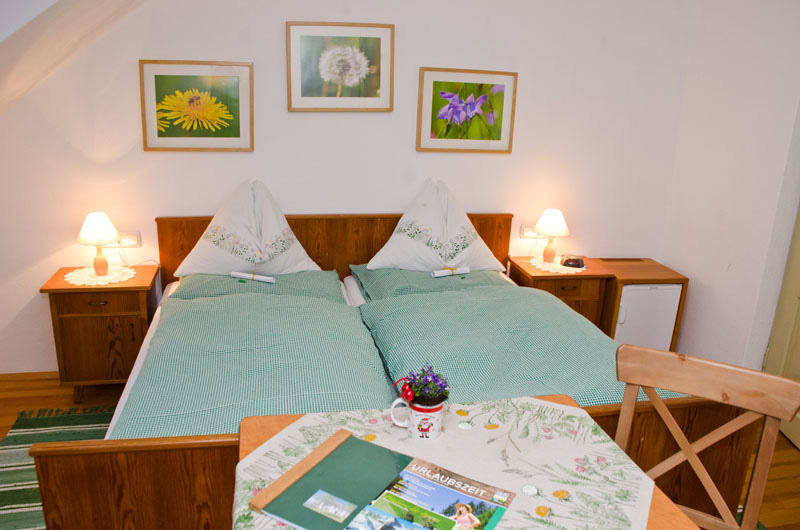 Blickt man bei diesem Zweibettzimmer beim Fenster hinaus, so ist das Dorf mit seiner Kirche zu sehen. Es ist hell und freundlich. Die rustikale Vollholzeinrichtung und die selbstbedruckten Vorhänge unterstreichen den bäuerlichen Stil. Im Badezimmer sieht man eine Borte und ein Bild mit selbstbemalten Fliesen, welche verschiedene Blumen der Wiesen zeigt.