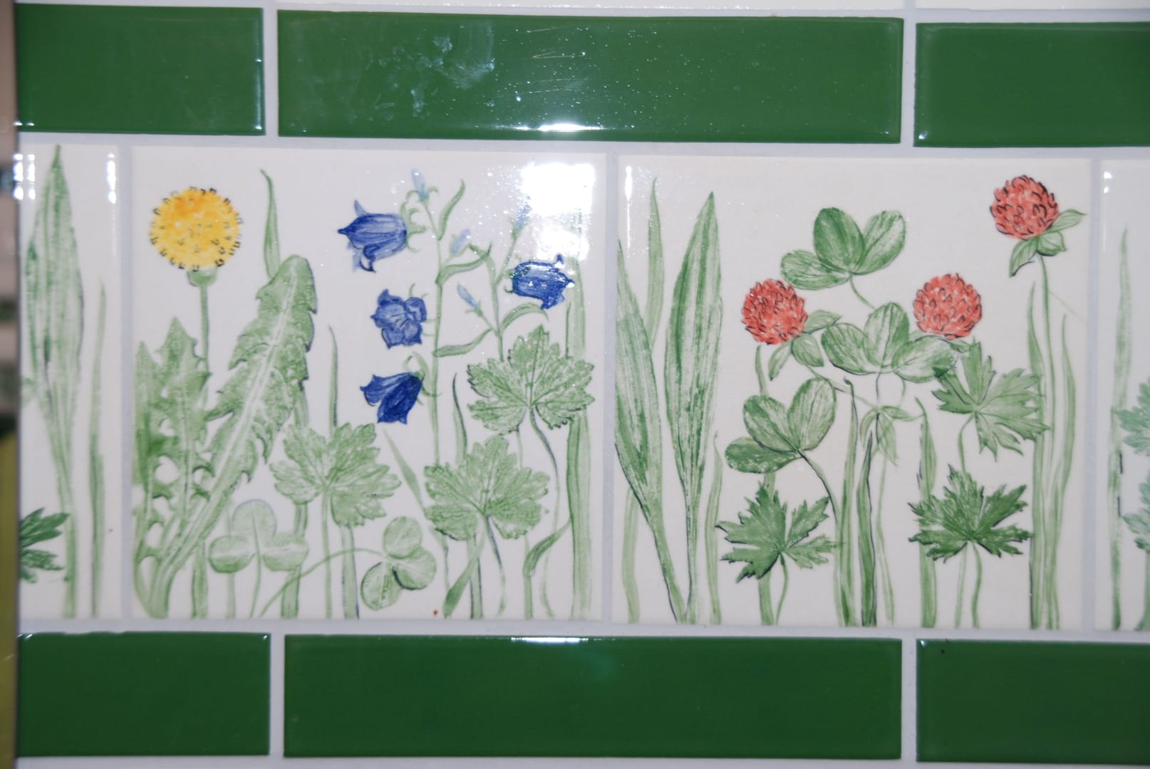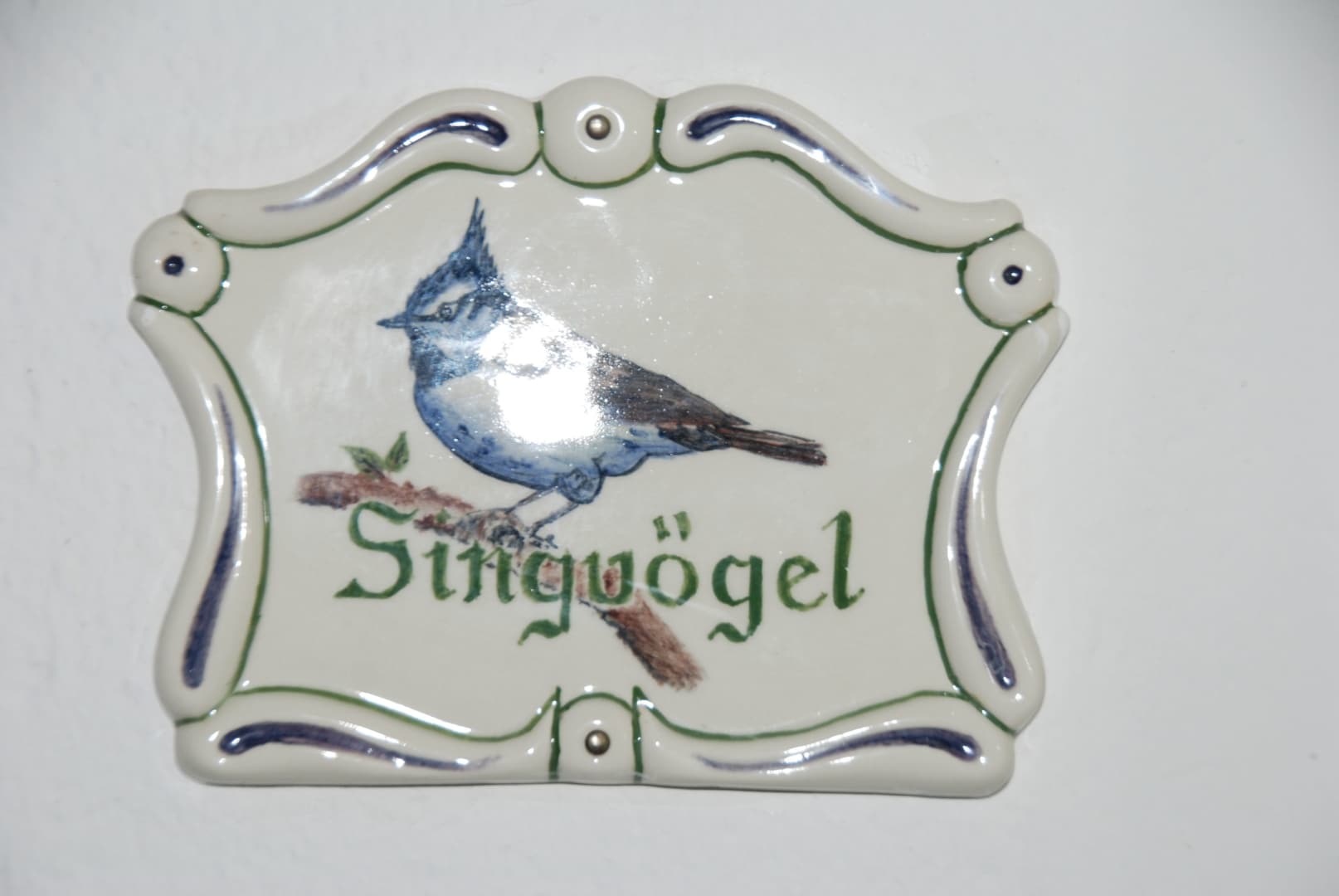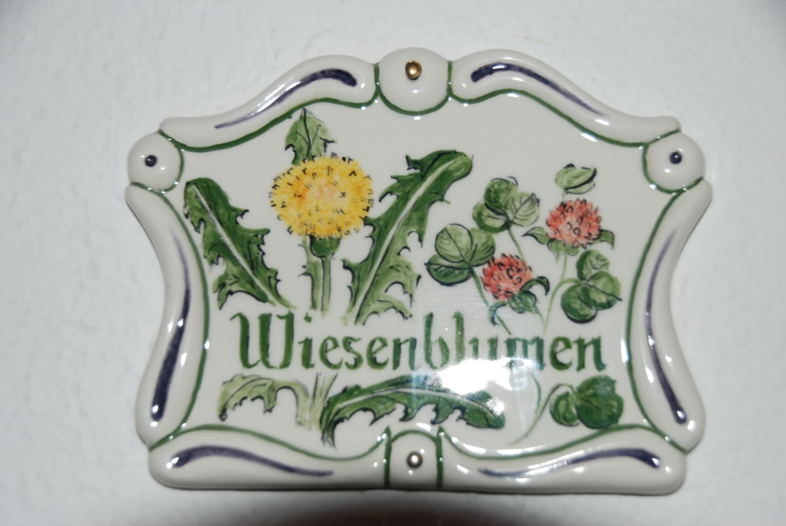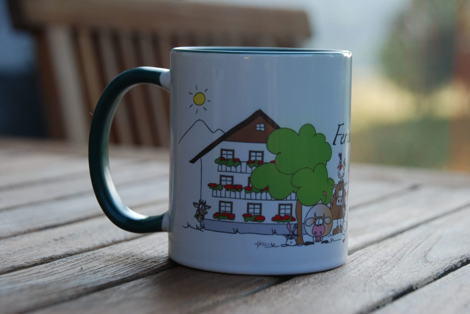 Blickt man bei diesem Zweibettzimmer beim Fenster hinaus, so ist das Dorf mit seiner Kirche zu sehen. Es ist hell und freundlich. Die rustikale Vollholzeinrichtung und die selbstbedruckten Vorhänge unterstreichen den bäuerlichen Stil. Im Badezimmer sieht man eine Borte und ein Bild mit selbstbemalten Fliesen, welche verschiedene Blumen der Wiesen zeigt.