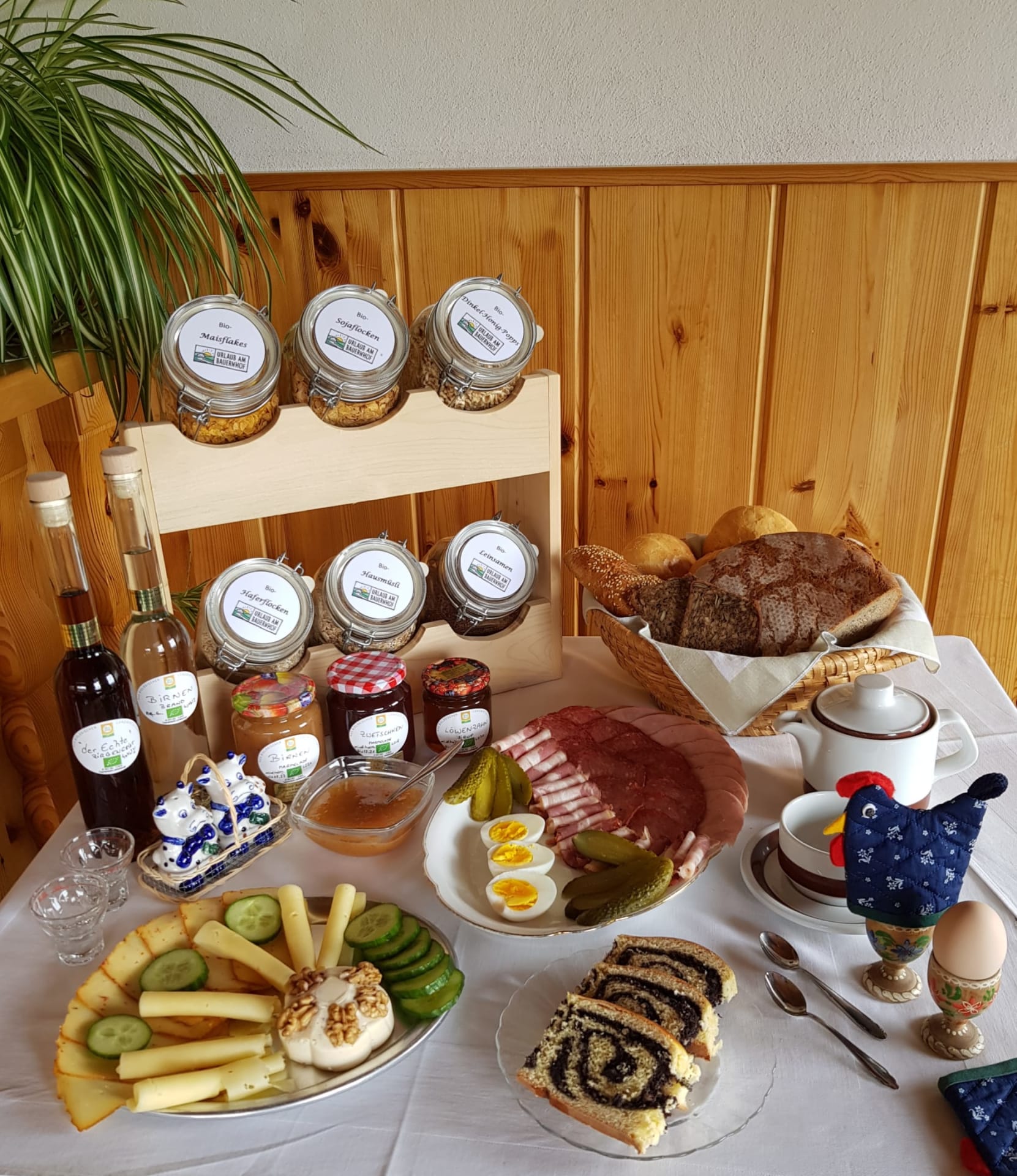 • Wir bieten folgende Verpflegung am Betrieb: Bio- Gutsherrenfrühstück, Produkte vom eigenen Hof (Brot, Joghurt, Marmeladen, Säfte, Schnäpse, Liköre, je nach Jahreszeit Kräuter)