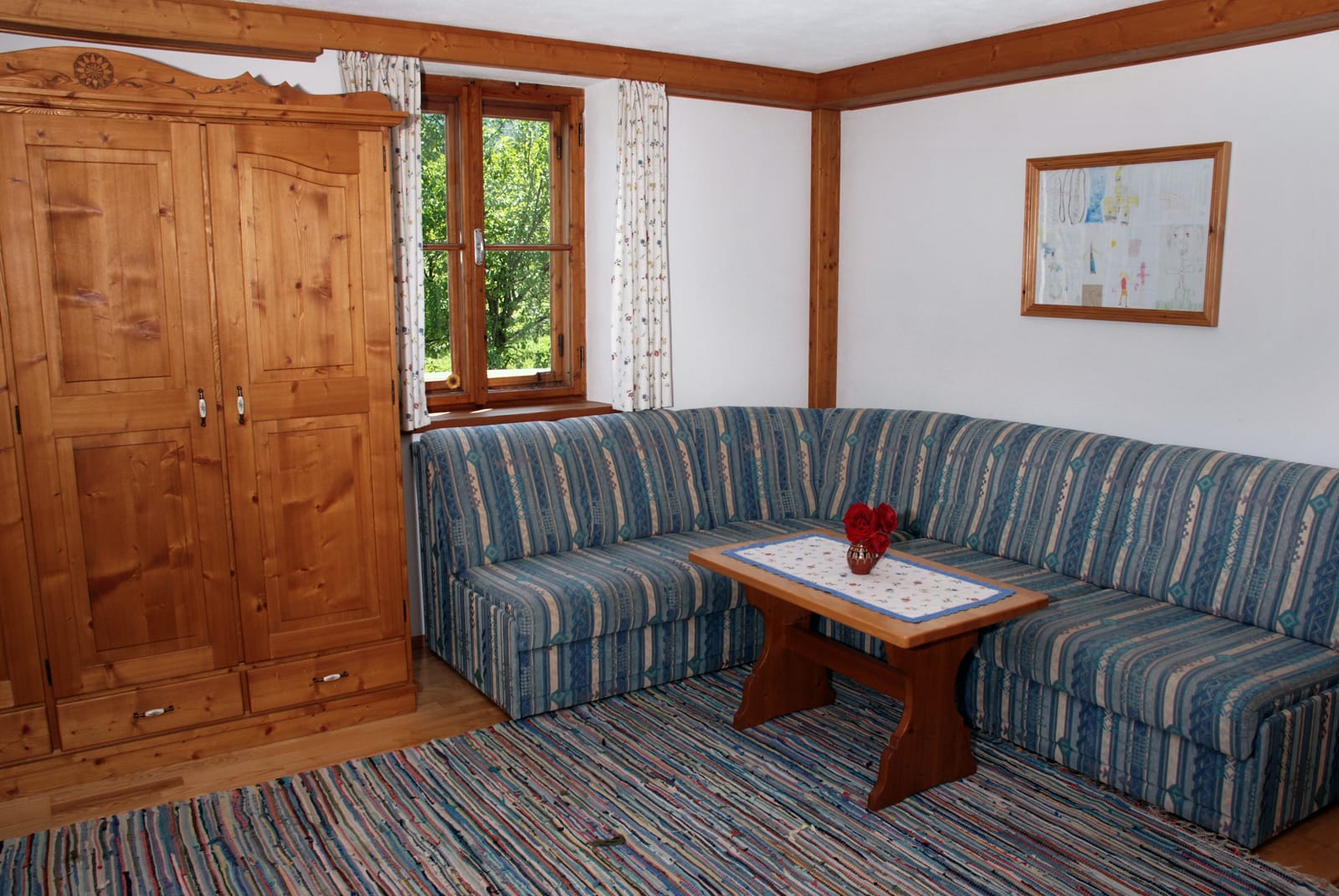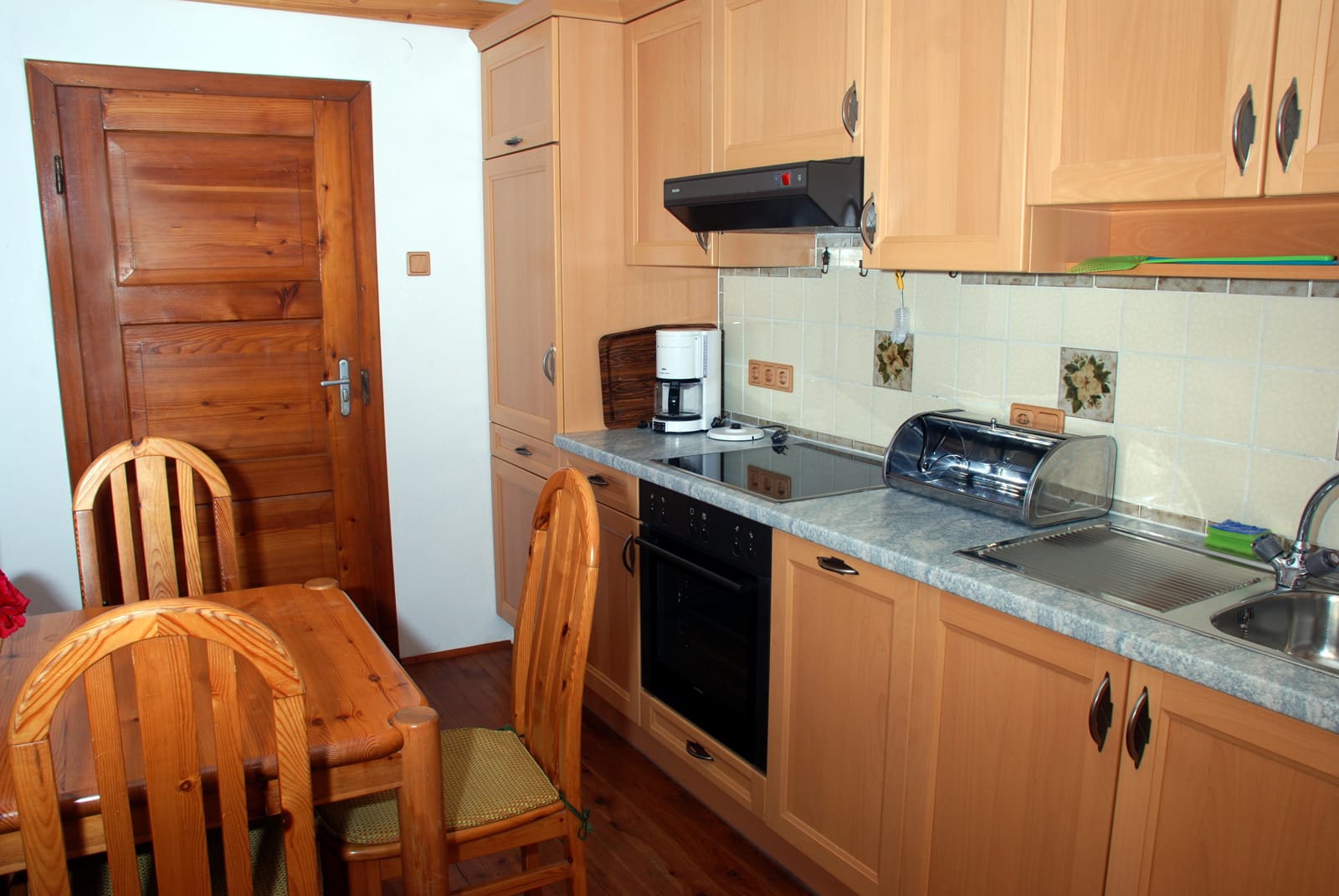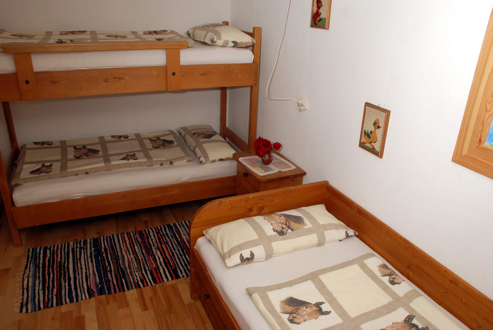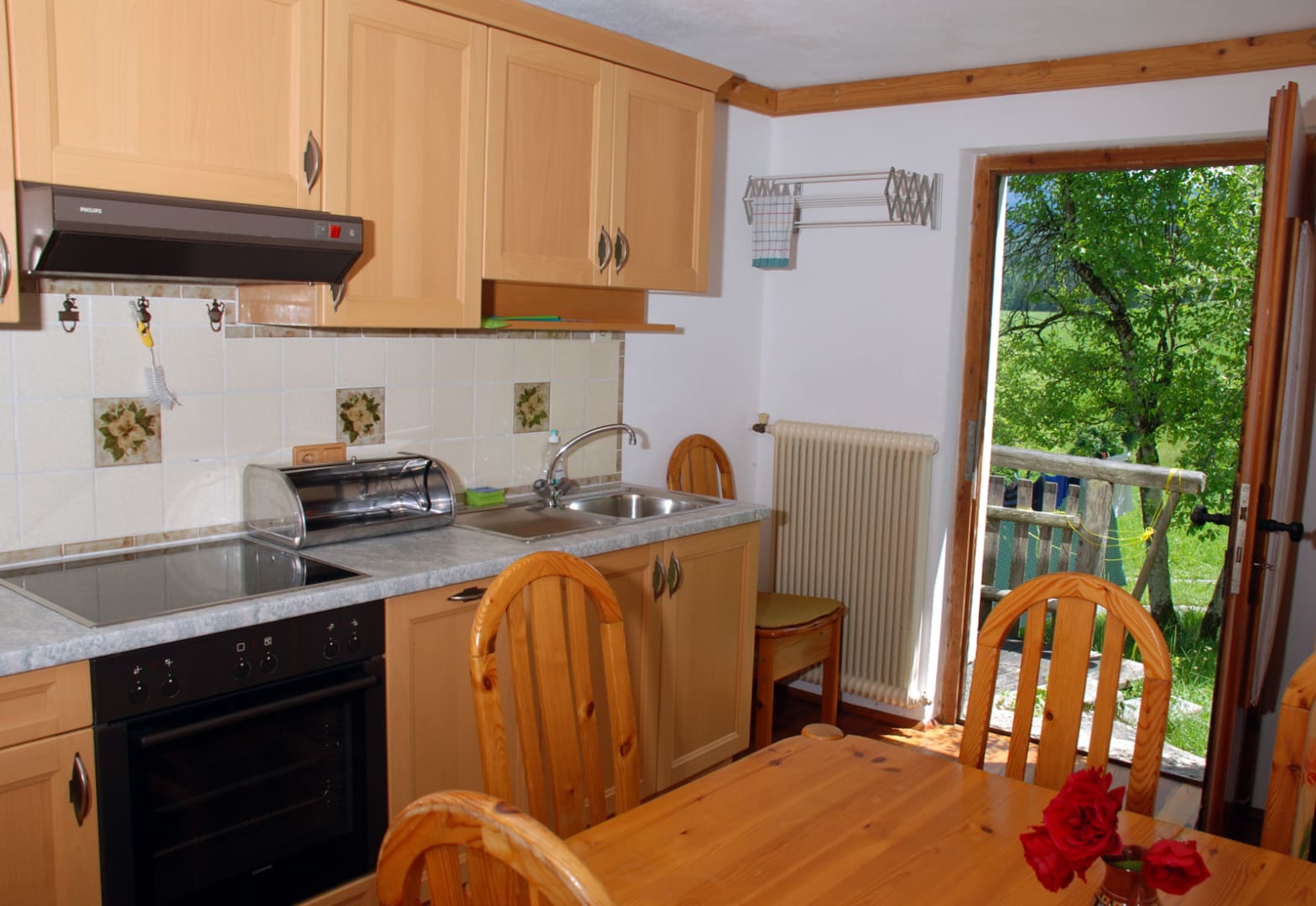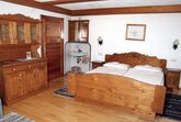 Ebenerdige Wohnung, bestehend aus einem Vorraum, Dusche und WC getrennt, Kinderzimmer mit einem Einzel- und einem Stockbett, Wohnschlafzimmer mit extragroßem Doppelbett (2,10 m) und einer gemütlichen Kuschelecke, die zu einem Doppelbett ausziehbar ist, Küche (mit Geschirrspüler, E-Herd mit Ceranfeld und Backrohr, Filterkaffeemaschine, Wasserkocher, Toaster, Kühlschrank mit Gefrierfach), Sitzecke und Sonnenterasse. Rustikale Massivholzmöbel, gebürstet, geölt. Fliesenböden in Vorraum, Bad und WC, Eschen- und Lärchenholzböden in den Wohnräumen.