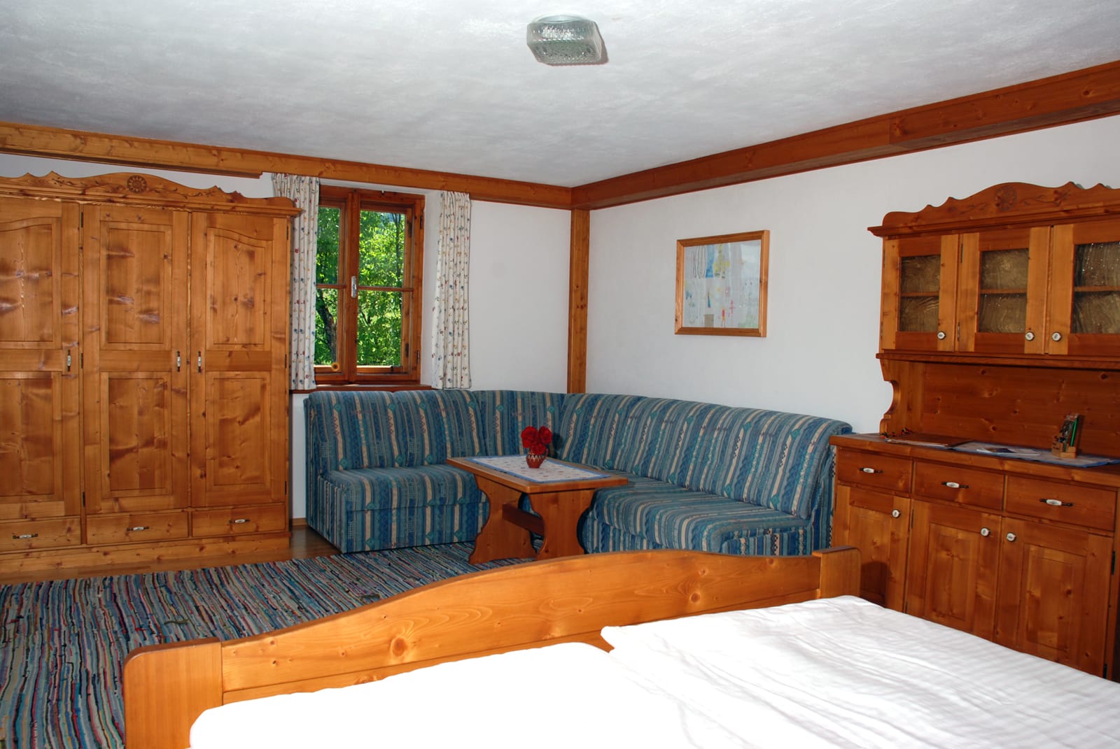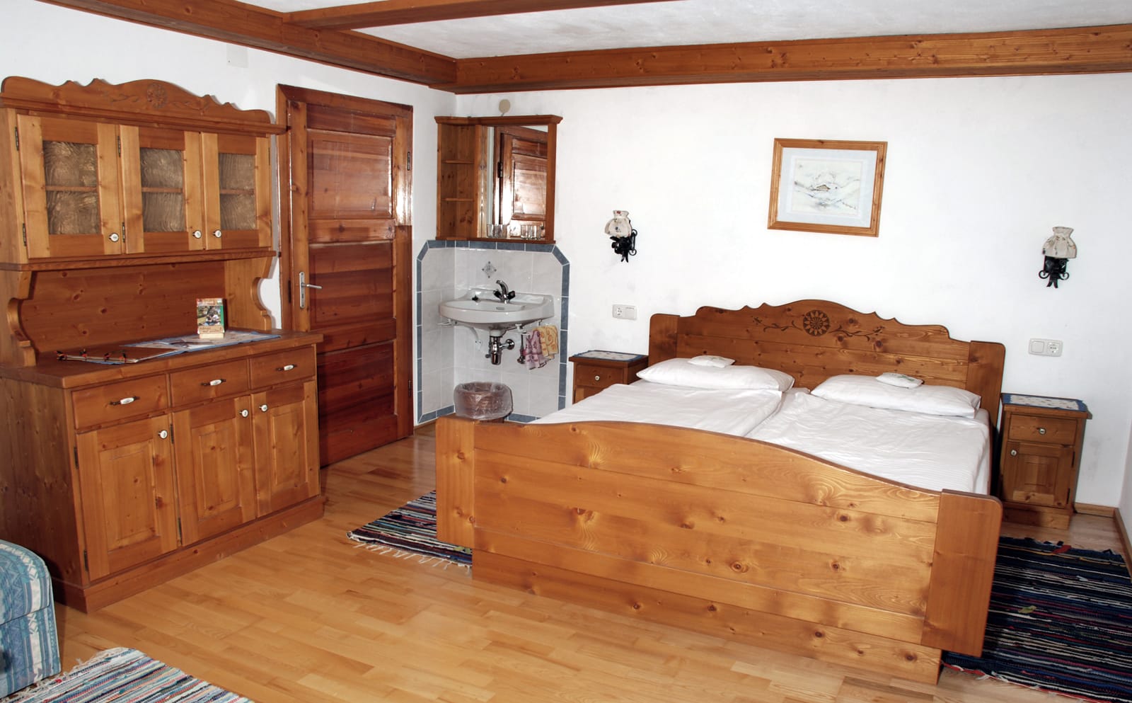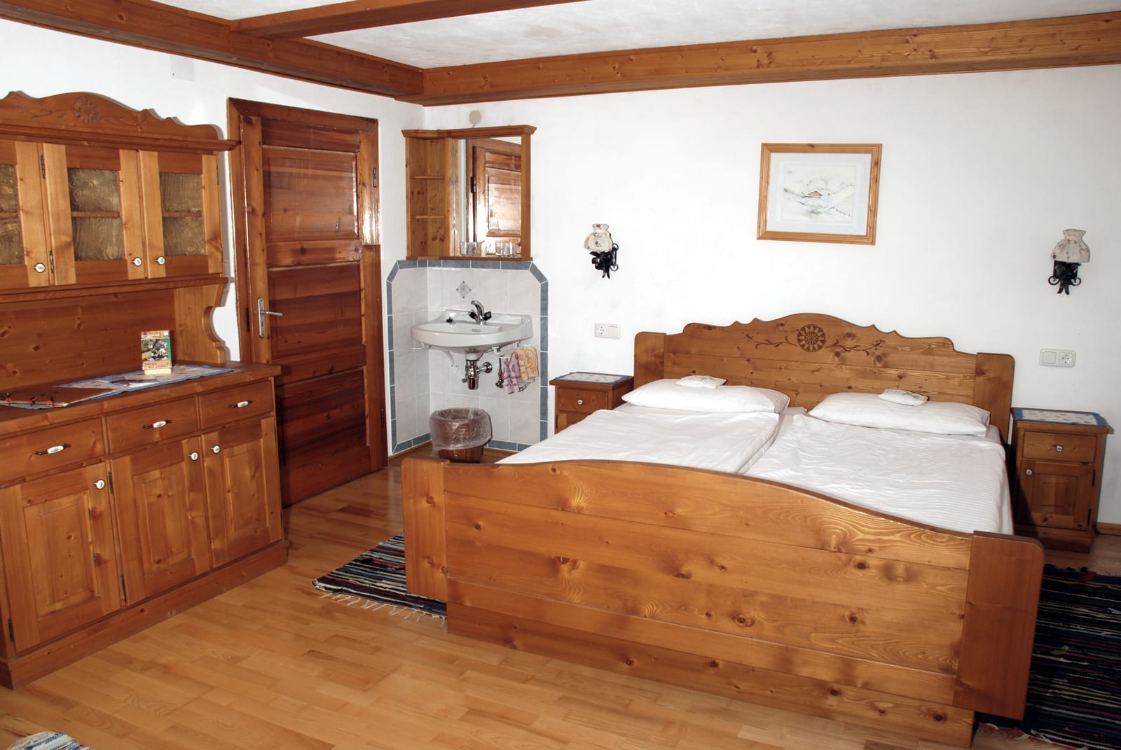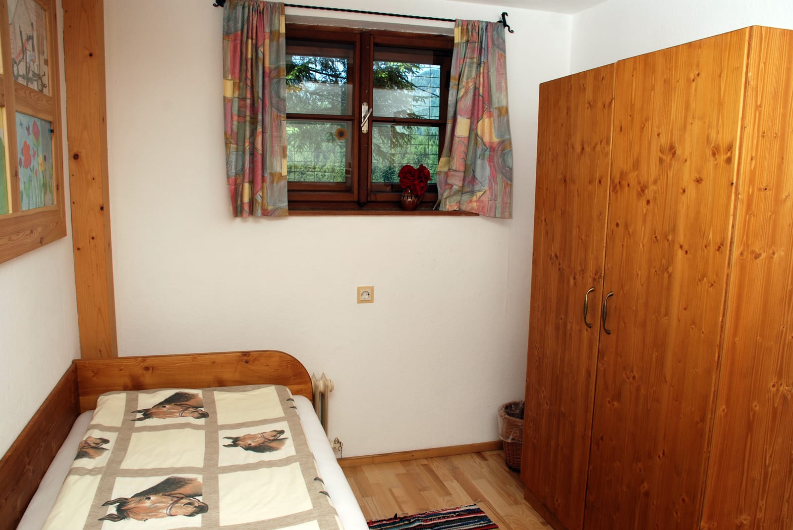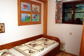 Ebenerdige Wohnung, bestehend aus einem Vorraum, Dusche und WC getrennt, Kinderzimmer mit einem Einzel- und einem Stockbett, Wohnschlafzimmer mit extragroßem Doppelbett (2,10 m) und einer gemütlichen Kuschelecke, die zu einem Doppelbett ausziehbar ist, Küche (mit Geschirrspüler, E-Herd mit Ceranfeld und Backrohr, Filterkaffeemaschine, Wasserkocher, Toaster, Kühlschrank mit Gefrierfach), Sitzecke und Sonnenterasse. Rustikale Massivholzmöbel, gebürstet, geölt. Fliesenböden in Vorraum, Bad und WC, Eschen- und Lärchenholzböden in den Wohnräumen.