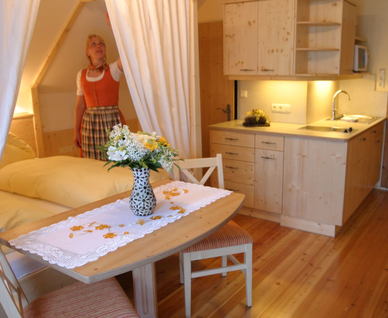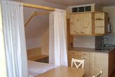 2. Stock Helles Mansarden-Appartment in Fichten-Vollholz für 2 - 3 Personen. Holzeinbauküche mit Kühlschrank+Gefrierfach, 2 Ceran-Kochplatten, Micro, Kaffeemaschine, Wasserkocher. Badezimmer mit Dusche / WC. Himmel-Doppelbett, Kleiderschrank, Sat-TV, Couch, Esstisch mit Stühlen. Holzbalkon mit Bergpanoramablick zum Toten Gebirge.
