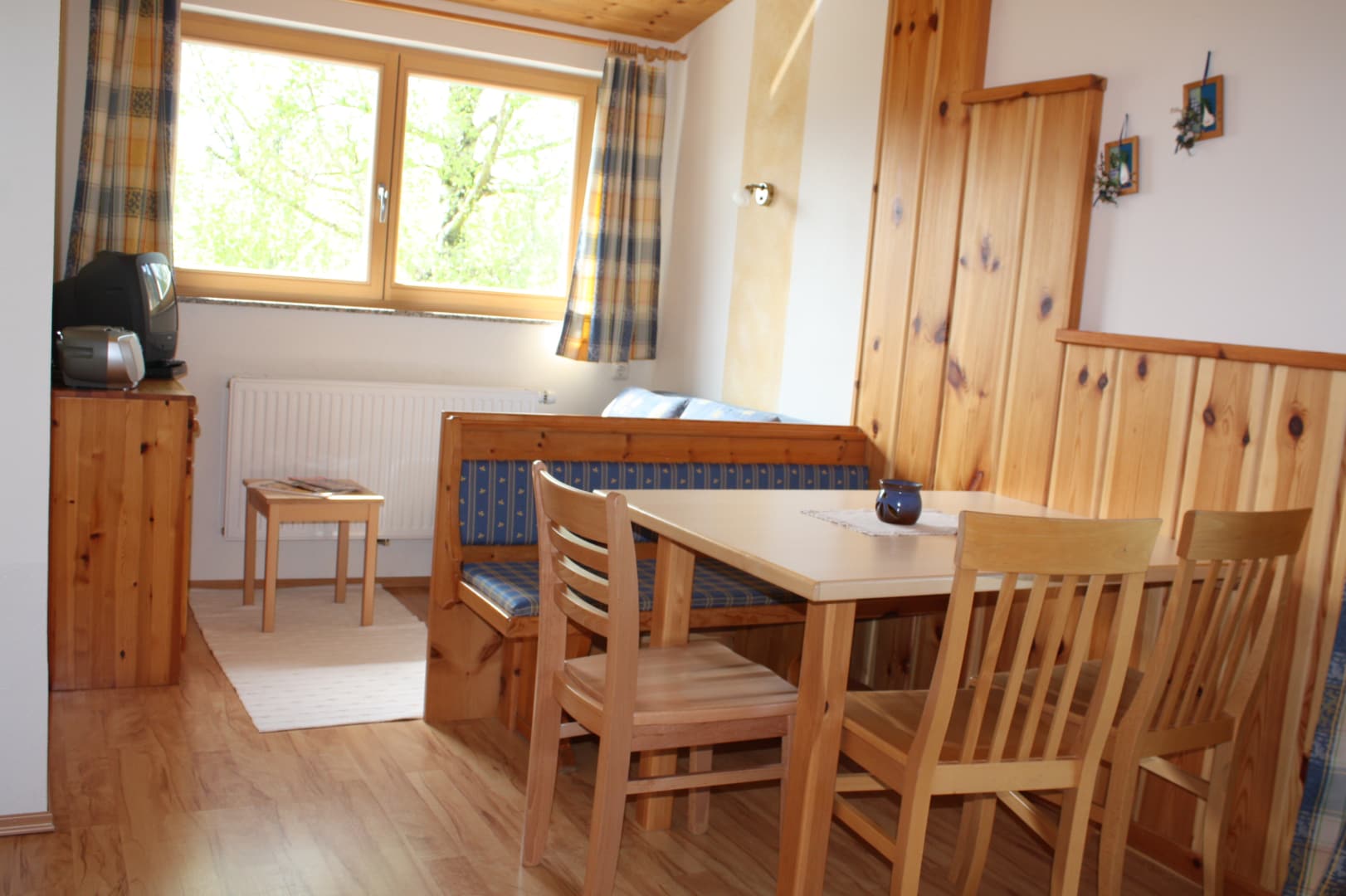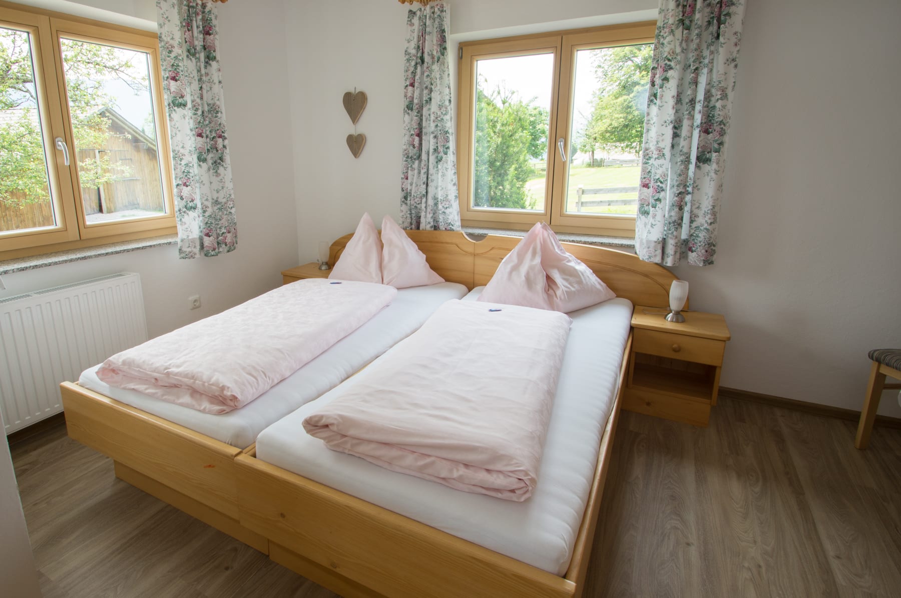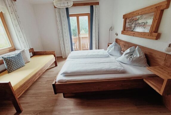 • einem Elternschlafzimmer mit Doppelbett, Massivholzmöbeln aus Fichten-Altholz vom Hof, Sofa und Zugang zum Balkon (ostseitig),