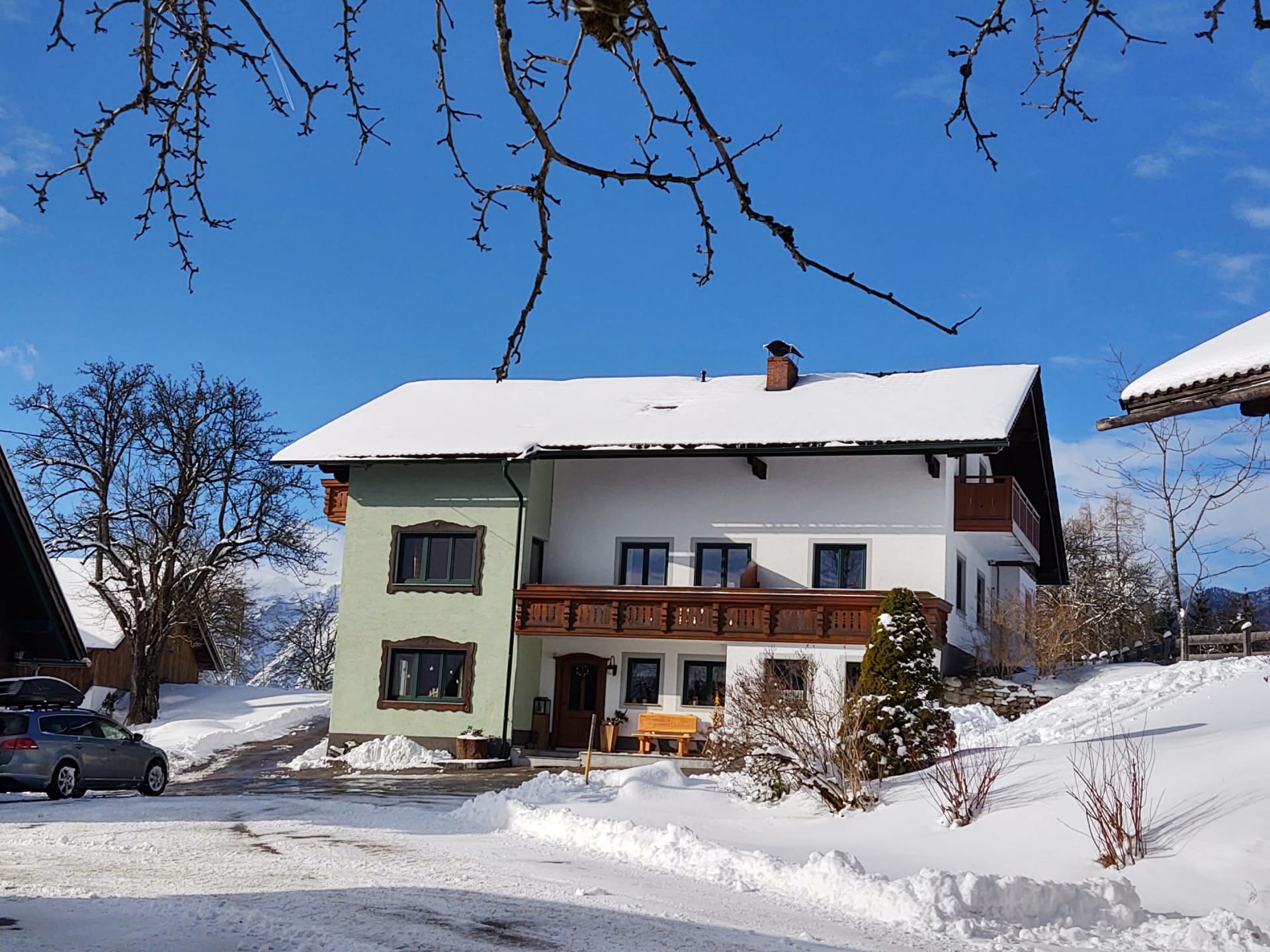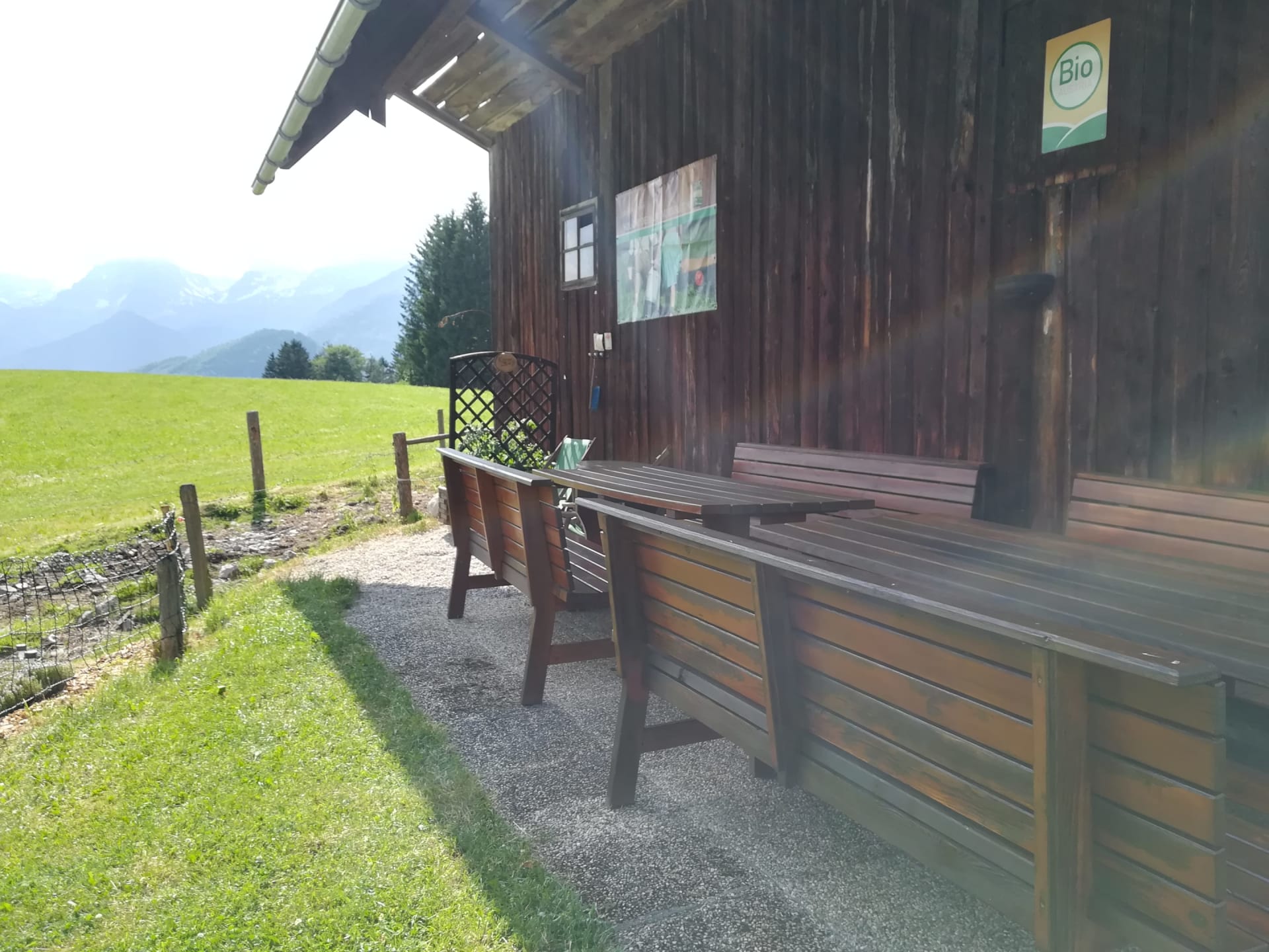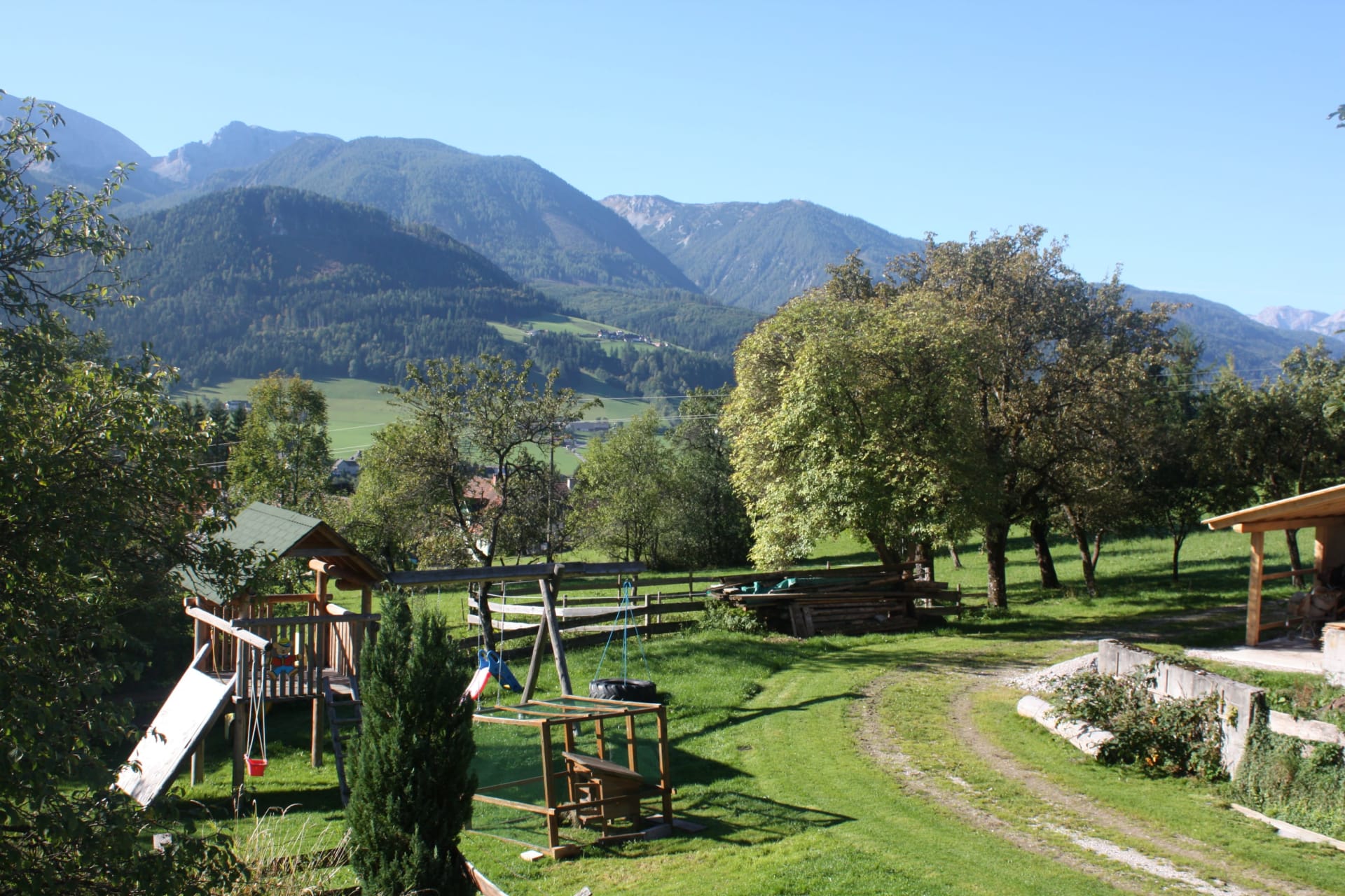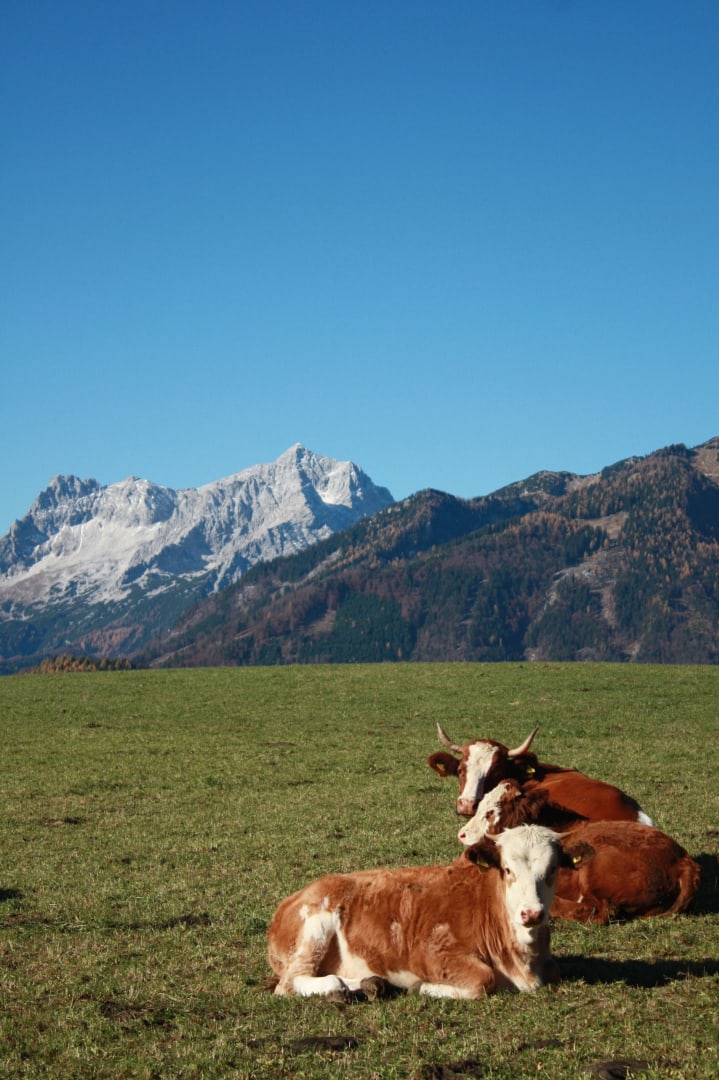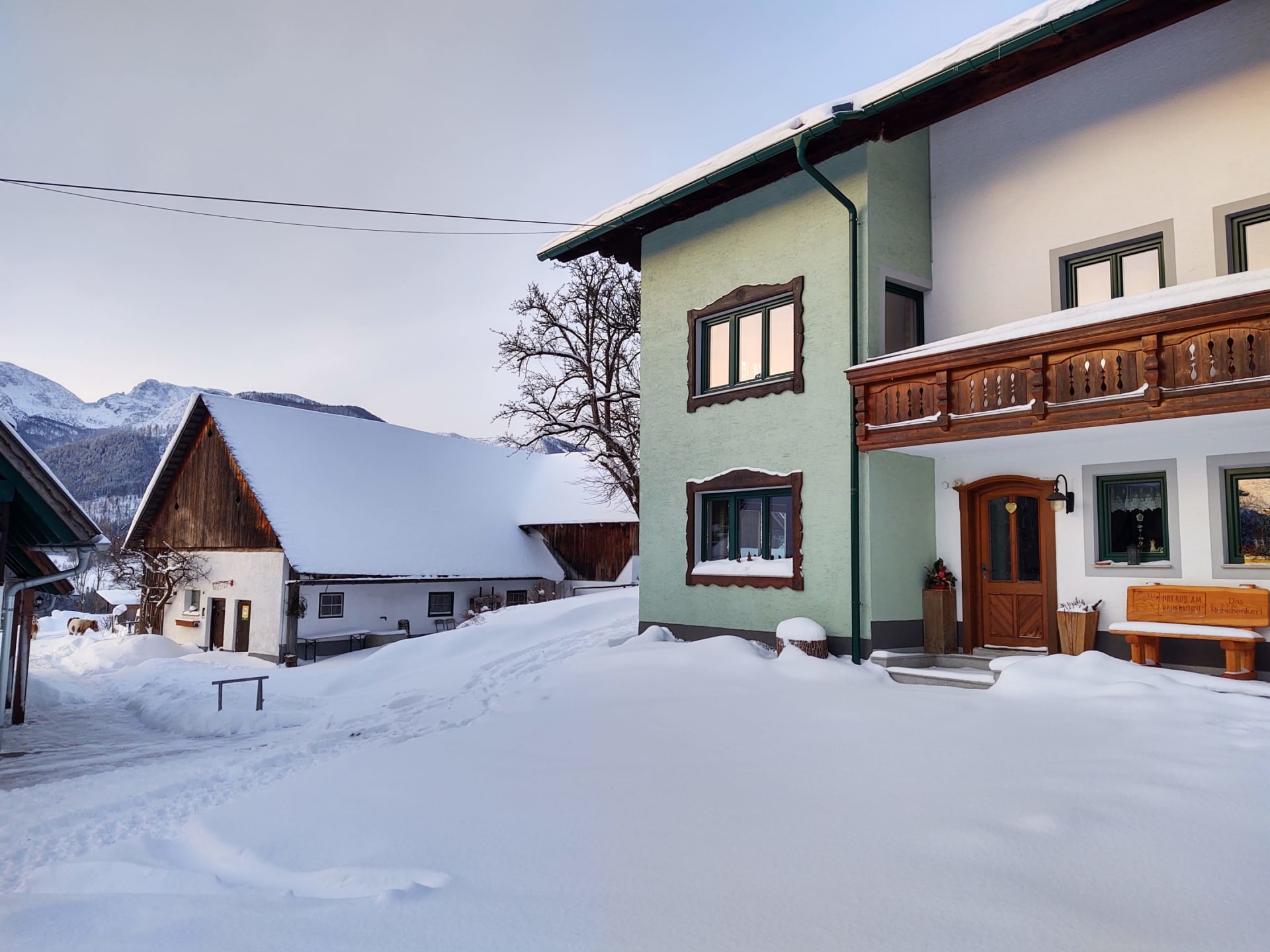 • einem Balkon mit Aussicht auf die Berge Bosruck, Pyhrgas und Scheiblingstein und unserem Hof.