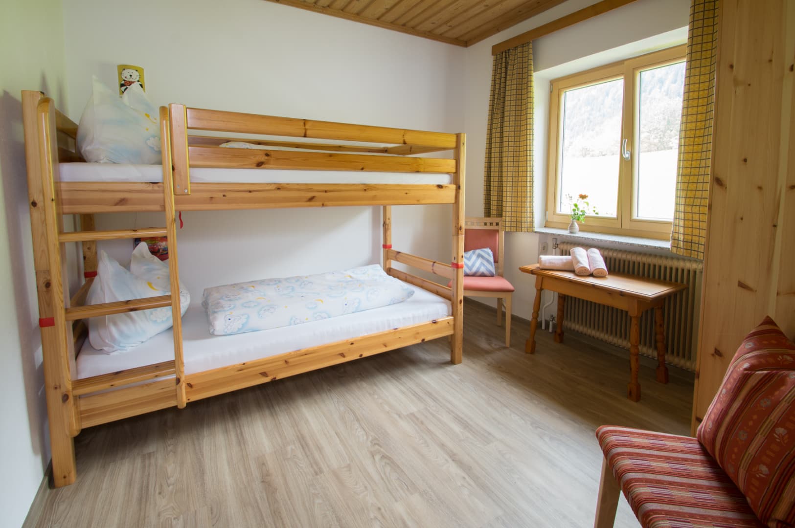• einem getrennt begehbaren Schlafzimmer für zwei Kinder (Stockbett aus hellem Vollholz),