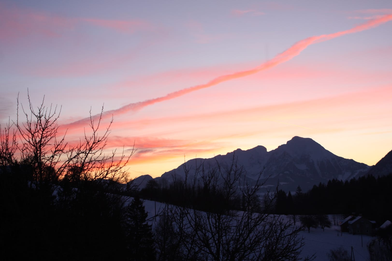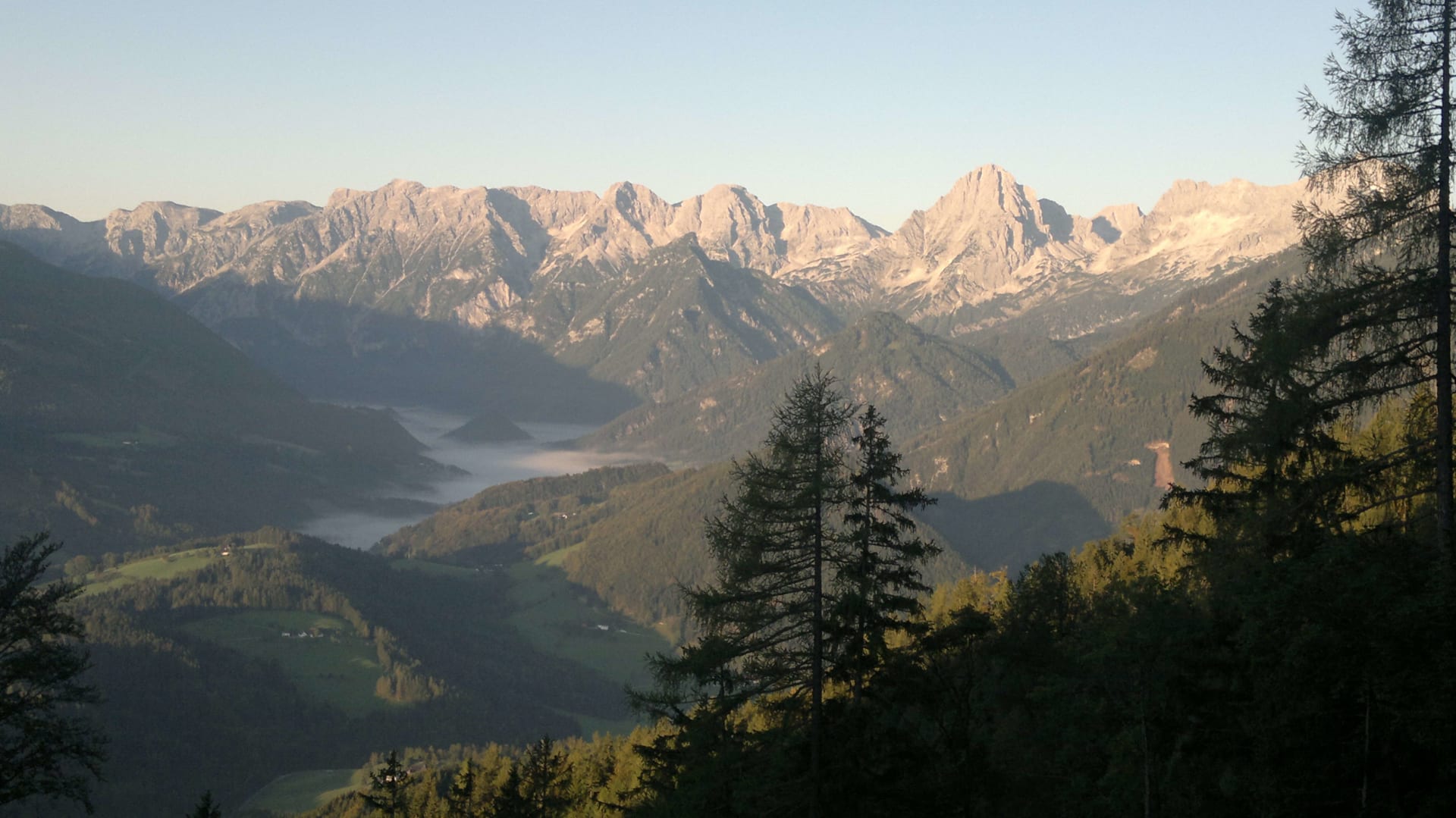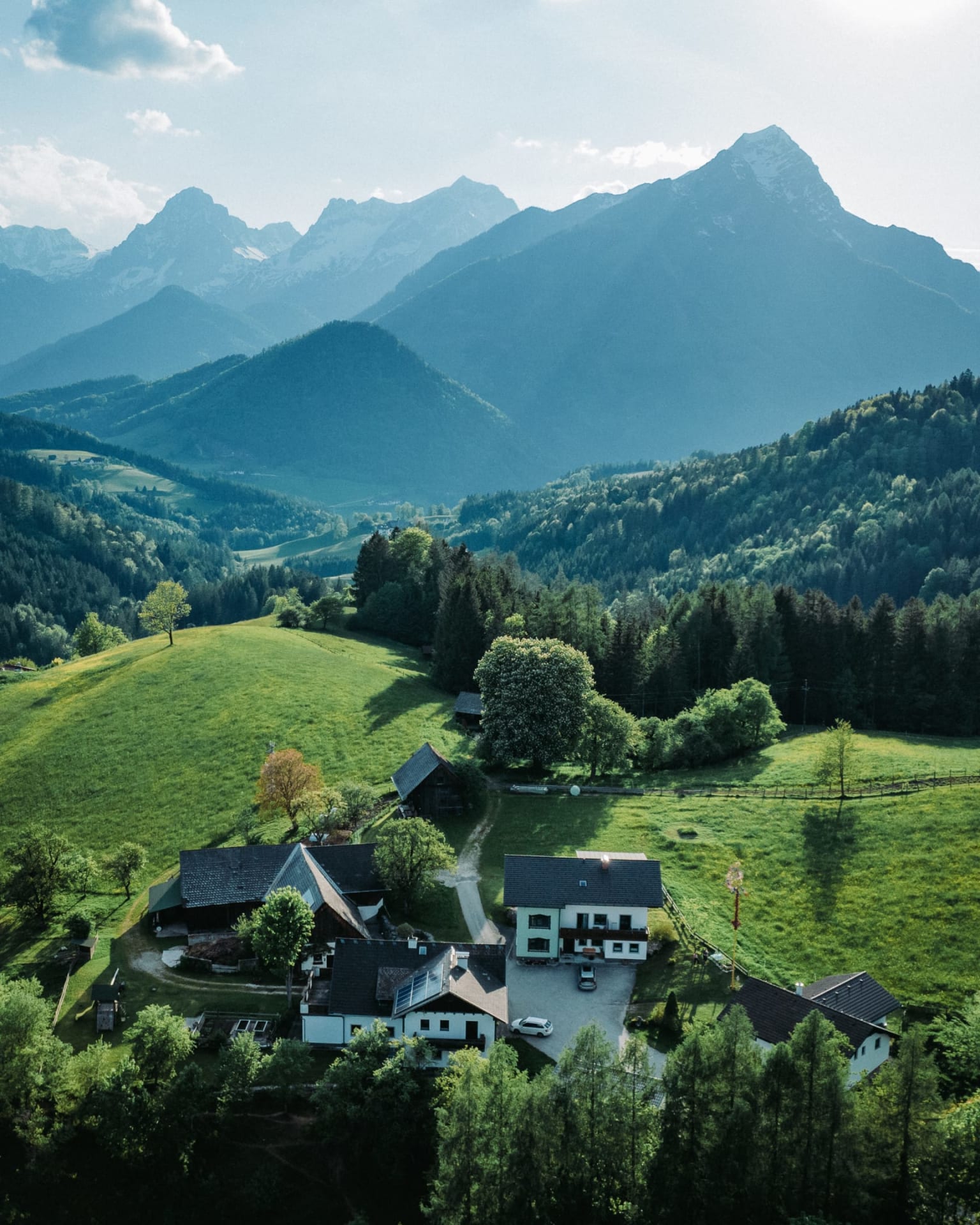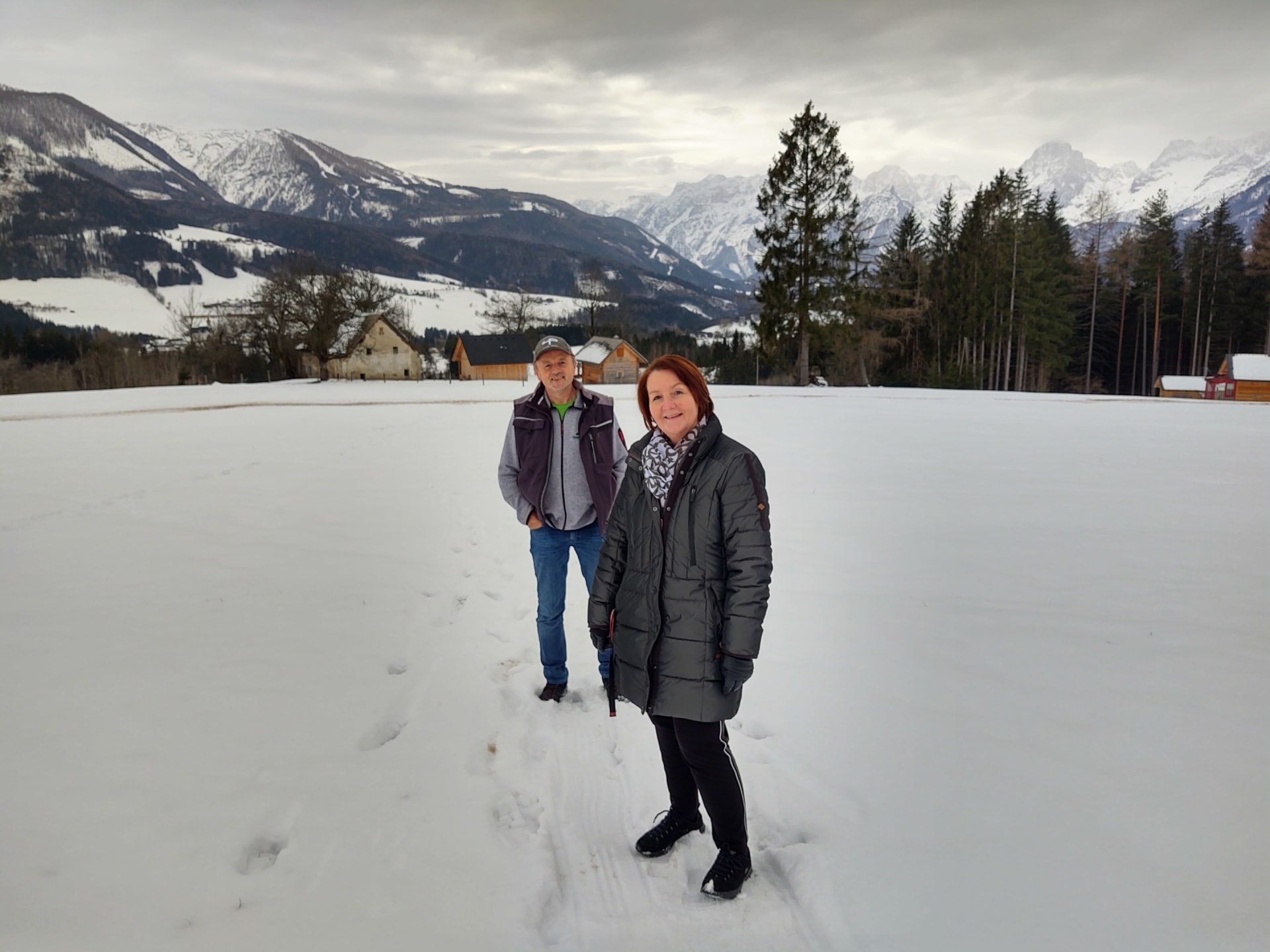 Seehöhe 860 m, auf der Sonnenseite von Vorderstoder mit Blick aufs Gebirge mit Großem Priel und Spitzmauer & das idyllische Bergdorf Vorderstoder mit der Kirche Maria am Stein.