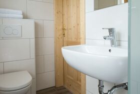 Sehr hübsches, kleines Doppelzimmer mit Blick auf das Hofgeschehen sowie die umliegenden Berggipfel, mit neuem kleinem Bad (Dusche/WC), ohne Fernseher und ohne Balkon.