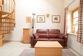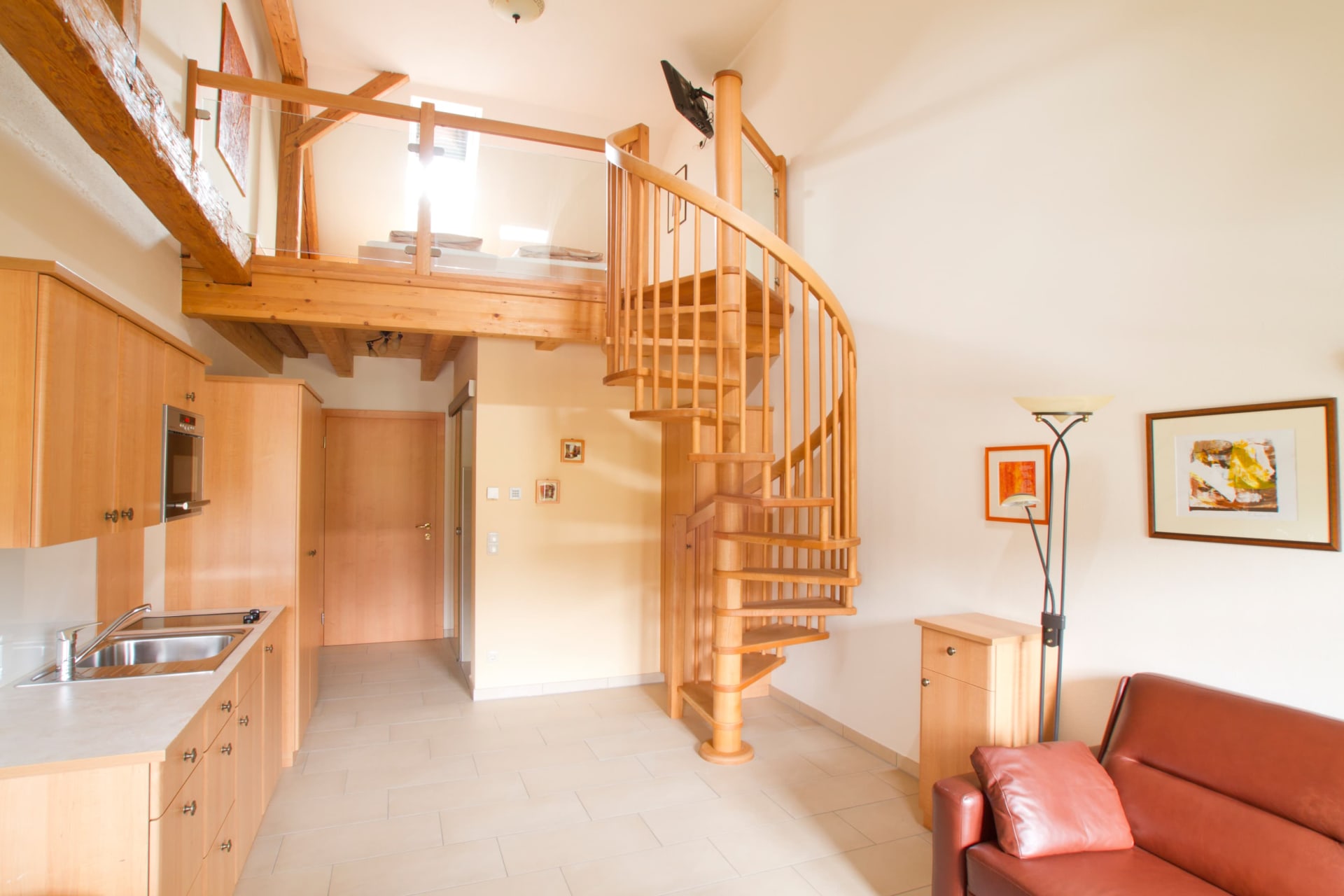 Das geräumige und durch Dachfenster lichtdurchflutete Galerie-Apartment bietet Entspannung auf zwei Ebenen: Auf erster Ebene befindet sich ein Wohnbereich mit Sofa und Essplatz. Die zweite Ebene ist über eine Wendeltreppe erreichbar. Dort befindet sich der Schlafbereich. Auf beiden Ebenen sind Flat TV-Screens und kostenloses WLAN vorhanden.
