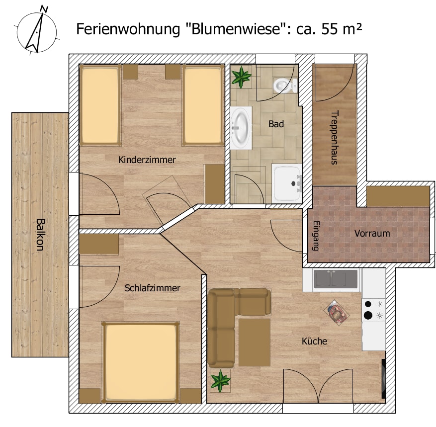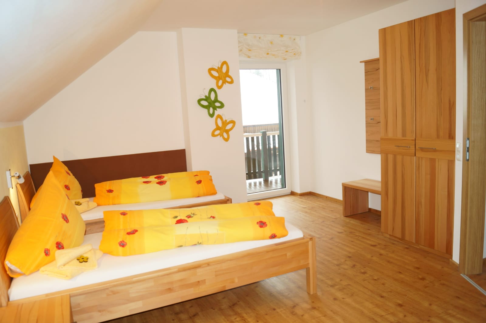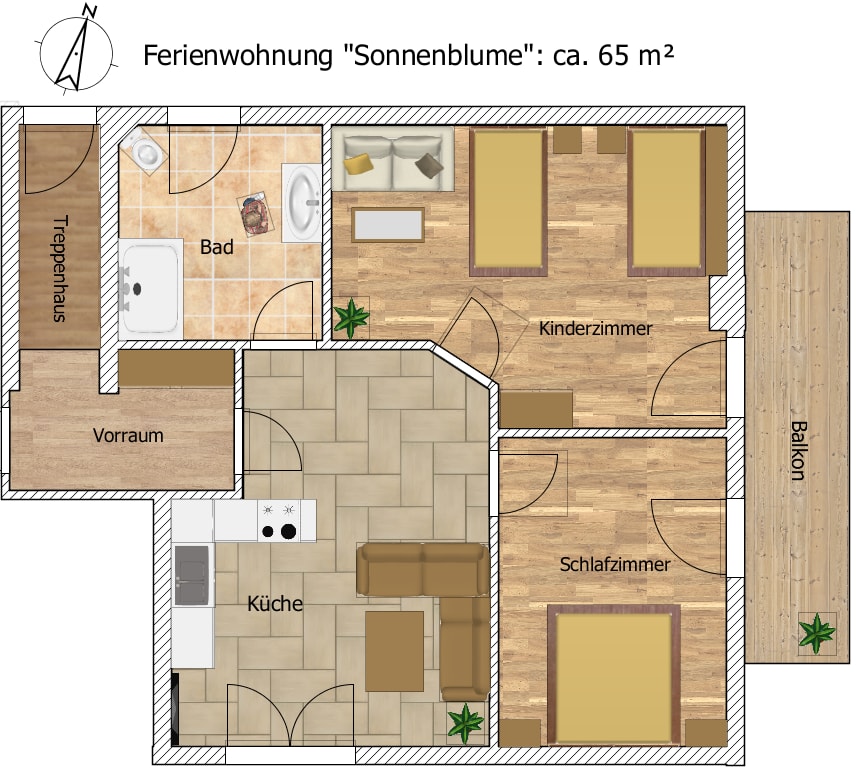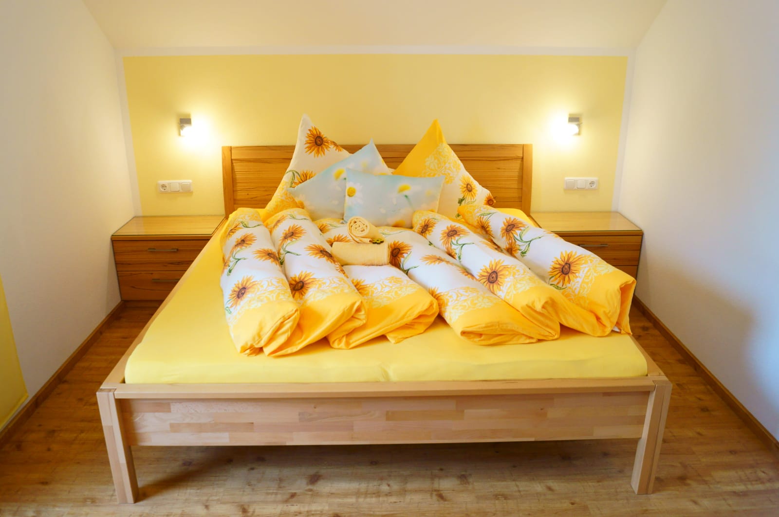 Genießen Sie die Zeit mit Ihren Kindern in unserer völlig neuen und sehr sonnigen Ferienwohnung Sonnenblume. Die Ferienwohnung bietet zwei getrennte Schlafzimmer, ein sehr geräumiges Bad und eine große Wohnküche in der Sie alles Finden das Sie brauchen. Wir legen wert auf Natur, das heißt viel Holz. Genießen Sie Ihre schönsten Tage und lassen Sie sich einfach von uns verwöhnen.
