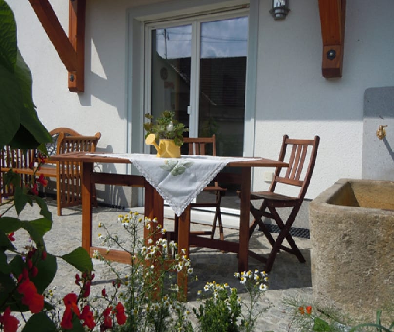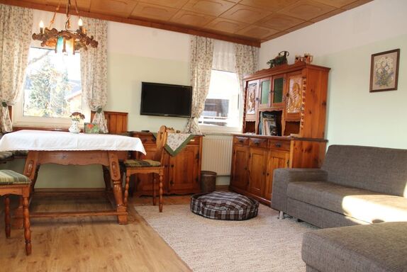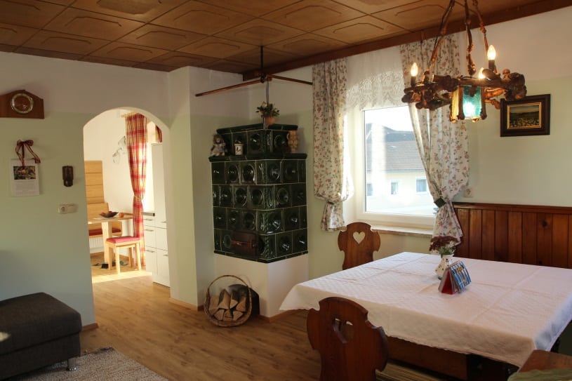 Ferienwohnung für 2-4 Personen. Bestehend aus Küche mit Balkon, Wohnzimmer mit Sitzecke und Eckcouch, Kachelofen, Sat- TV und Internetanschluss, Schlafzimmer, Kinderzimmer mit Stockbett, Badezimmer mit Dusche, WC extra, Balkon in den Innernhof.