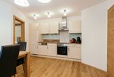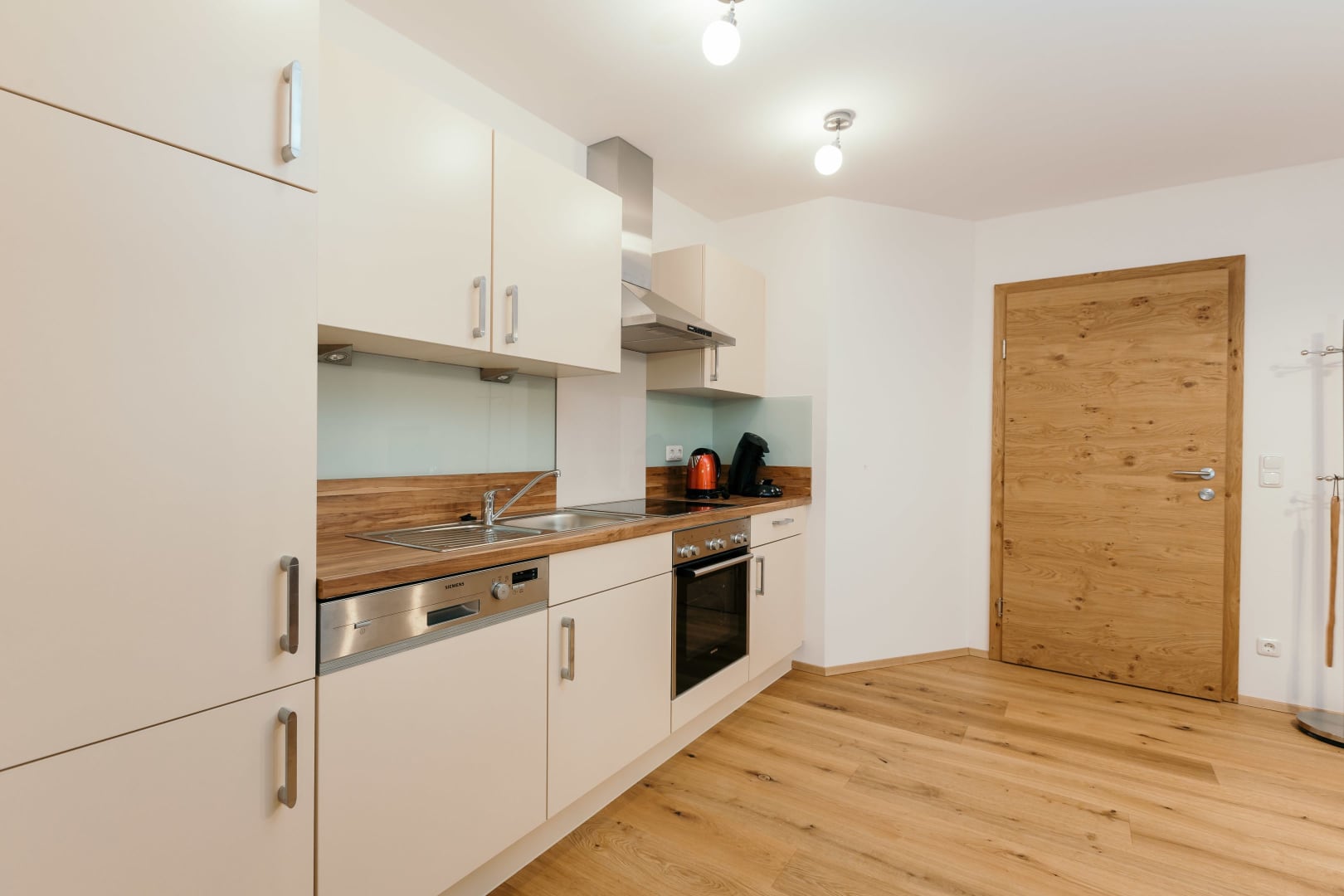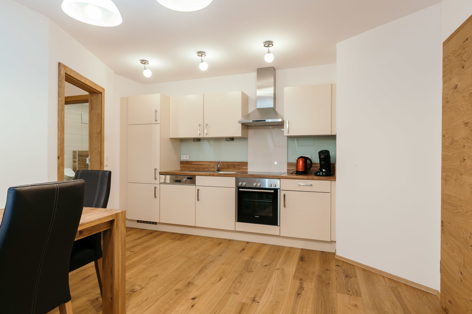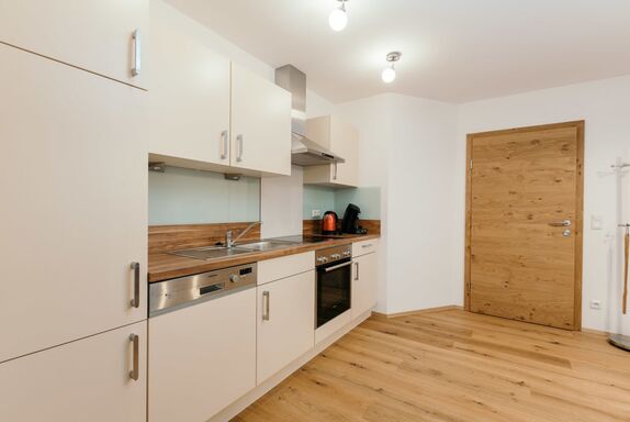 • einer vollausgestatteten Küche mit Wohn-Essbereich (Backofen, Herd, Mikrowelle 3-in-1, Kühlschrank mit Gefrierfach, Geschirrspüler, Wasserkocher, Toaster, Mixer, Pürierstab, Kaffeemaschine mit Tabs und reichlich Geschirr und Küchenutensilien.