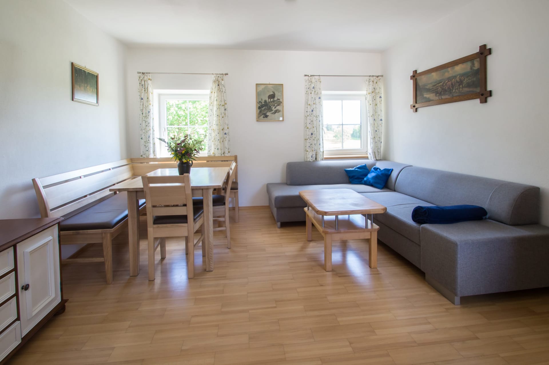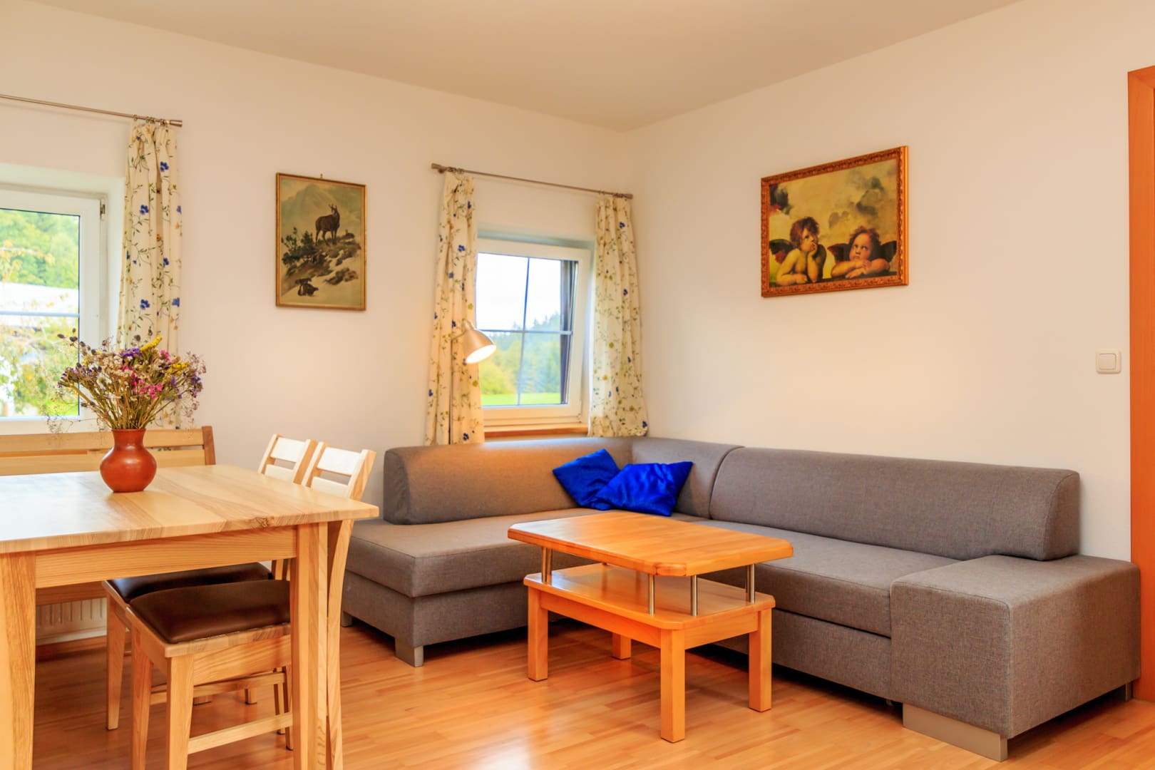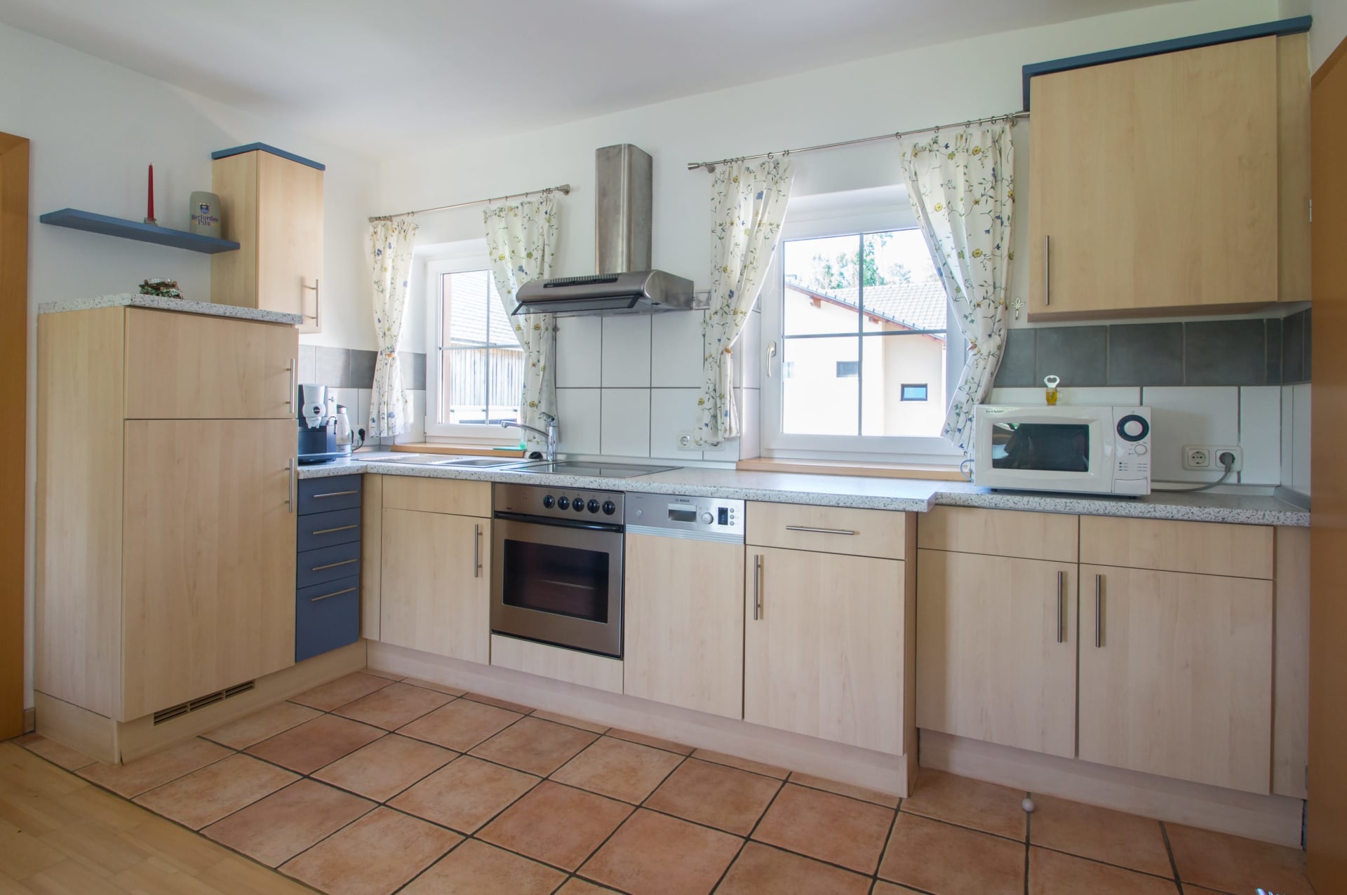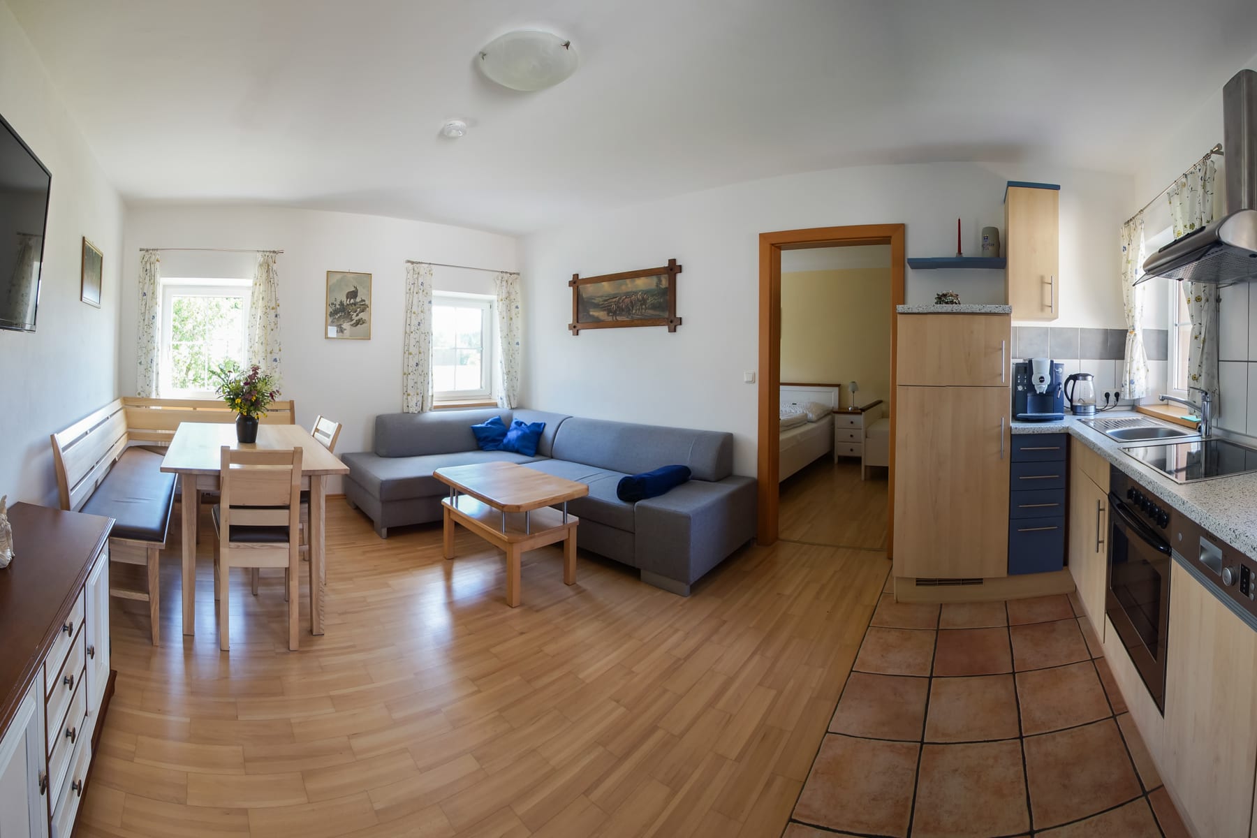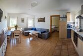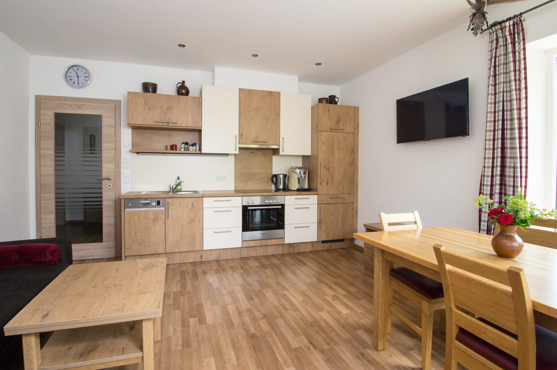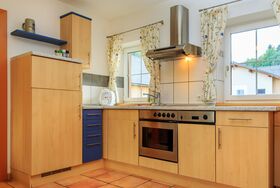 Helle Ferienwohnung mit Wohnküche mit Geschirrspüler, Elternschlafzimmer, Kinderzimmer, Vollholzmöbeln, tollem modernem Bad mit Dusche‚ Föhn‚ WC extra. Flat-TV‚ Internet‚ Babyausstattung, Insektenschutz, eigener Eingang. Ruhiger Balkon im Innenhof.